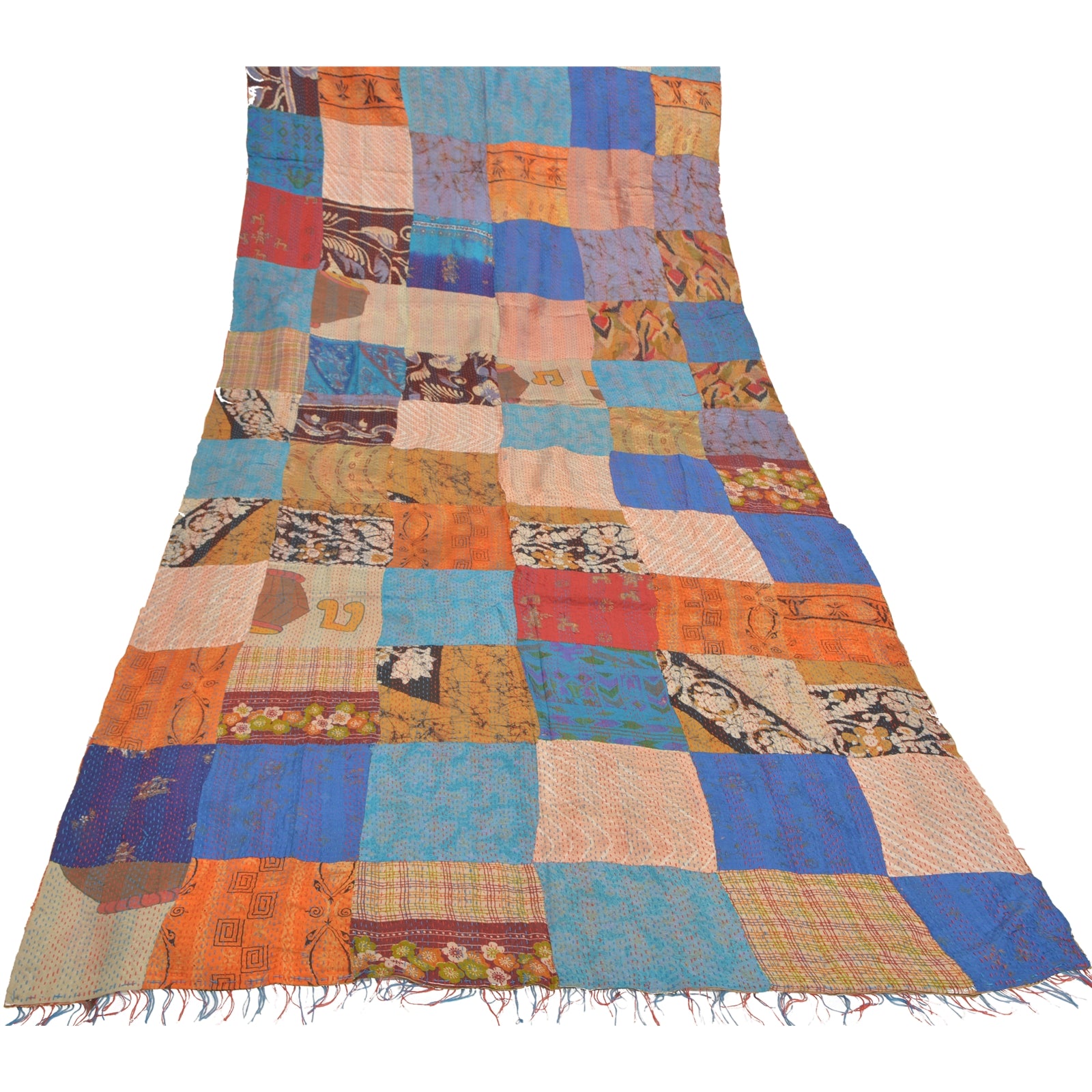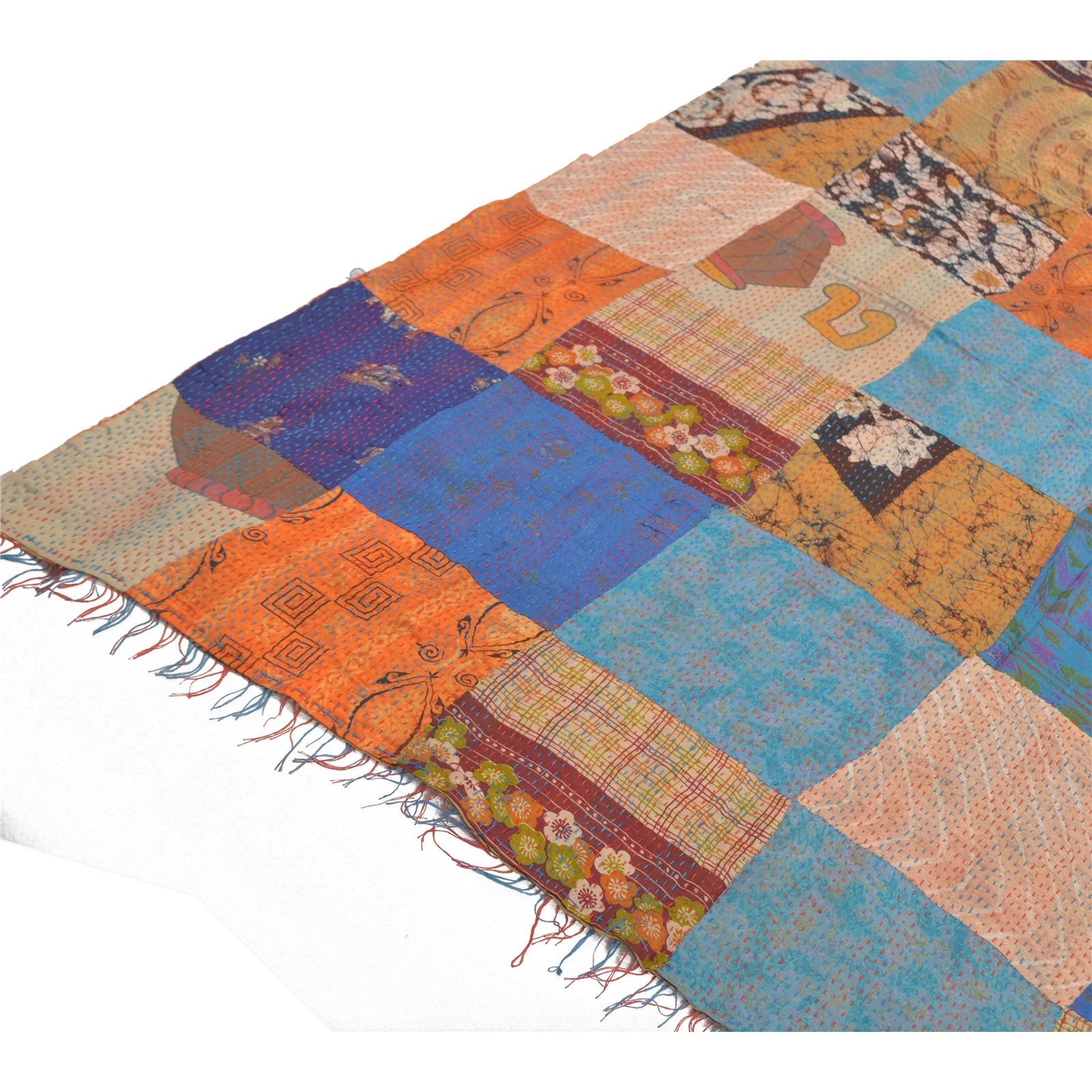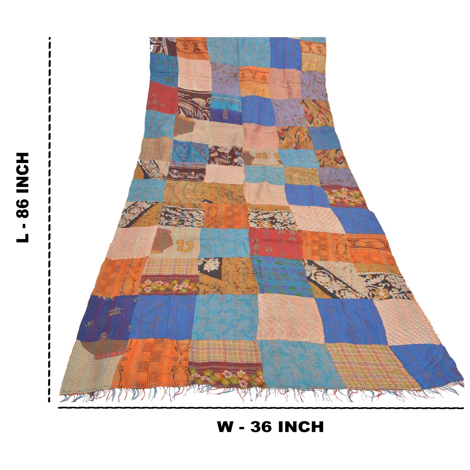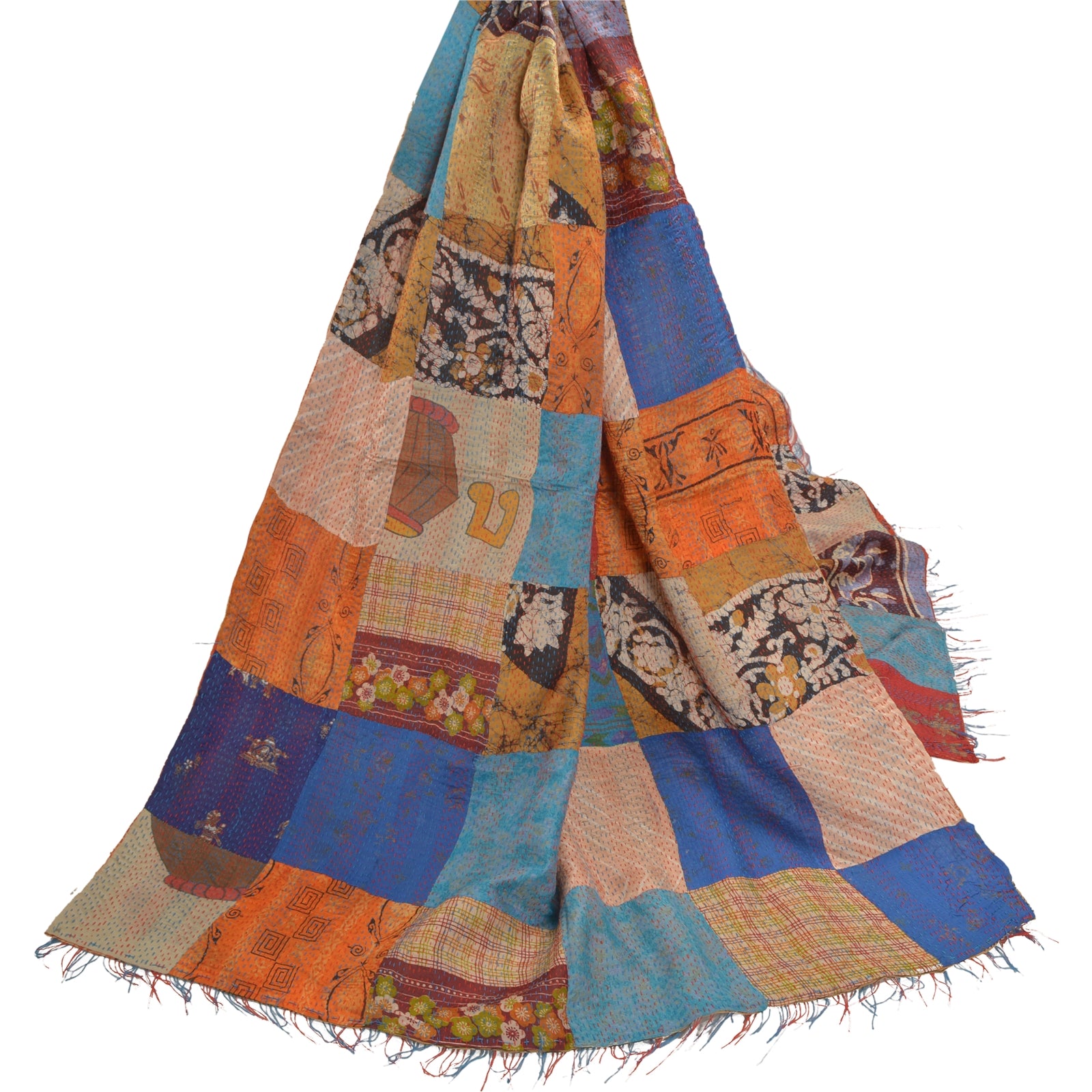 Sanskriti Proffers this Vintage Elegant multicolor 100% Pure Silk hand embroidered patch work kantha long scarf/dupatta. This dupatta is lines design embroidered with red&blue thread work on multicolor base Sustainable Fabric. This stole from Bengal is hand embroidered with the traditional kantha running stitch in a beautiful pattern. What is Kantha Embroidery? Kantha (also spelled kanta, and qanta) is a type of embroidery craft in the eastern regions of the Indian subcontinent, specifically in Bangladesh and in the Indian states of West Bengal, Tripura and Odisha. In Odisha, old saris are stacked on each other and hand-stitched to make a thin piece of cushion. This is normally used above a bed cushion or instead of a cushion.[1] "Kantha saris" are traditionally worn by women in Bengal region of the Indian subcontinent.[2] In these days, embroidery is stitched, popularly known as 'kantha stitched", on sari, kurta (or panjabi) and churidar and many other garments and gaining popularity due to their aesthetic value and handmade characteristics. Kantha stitching is also used to make simple quilts, commonly known as nakshi kantha. Women in Bengal typically use old saris and cloth and layer them with kantha stitching to make a light blanket, throw, or bedspread, especially for children. Kantha is very popular with tourists visiting the Bengal region of the Indian subcontinent. As the product is vintage, some mild stains/damages are expected.