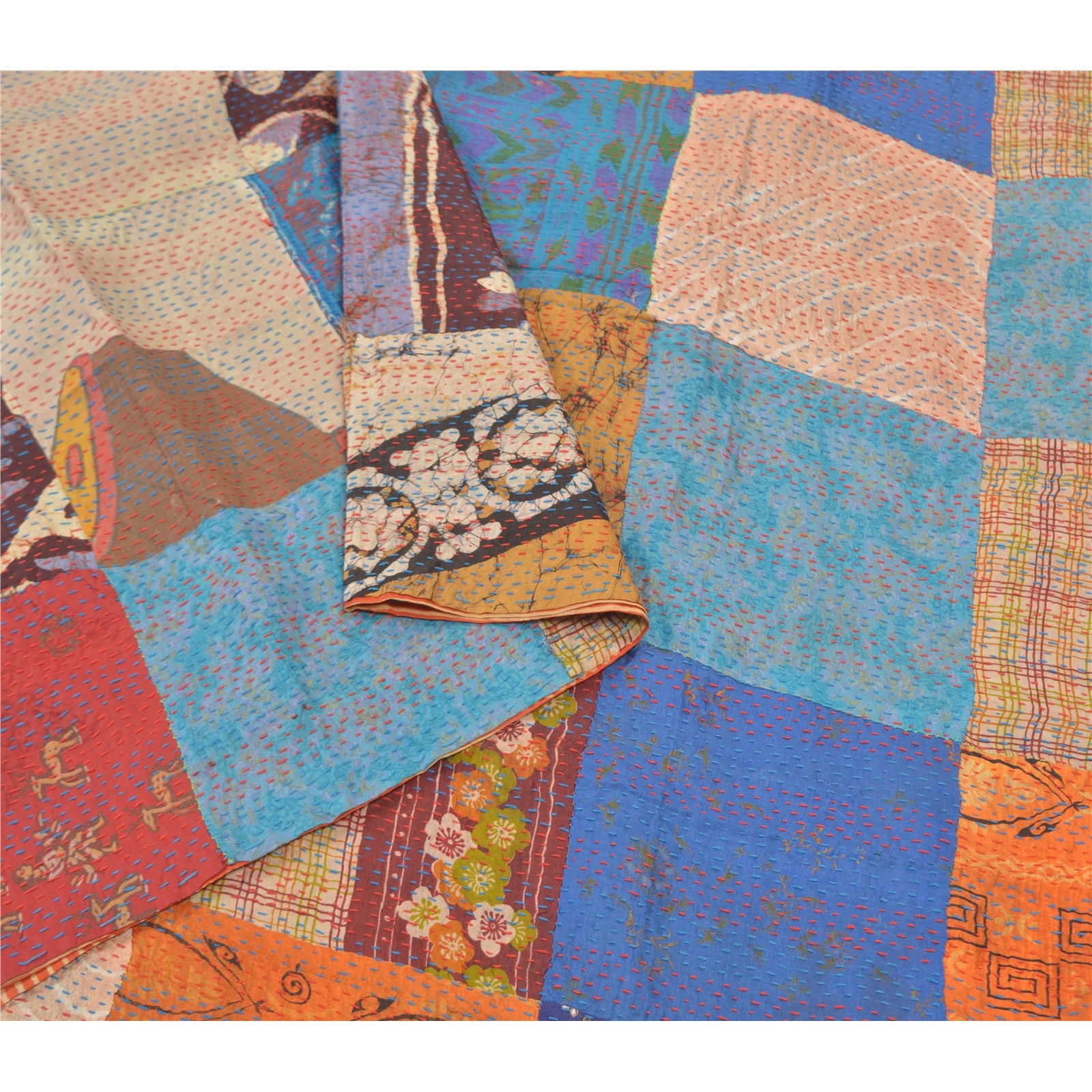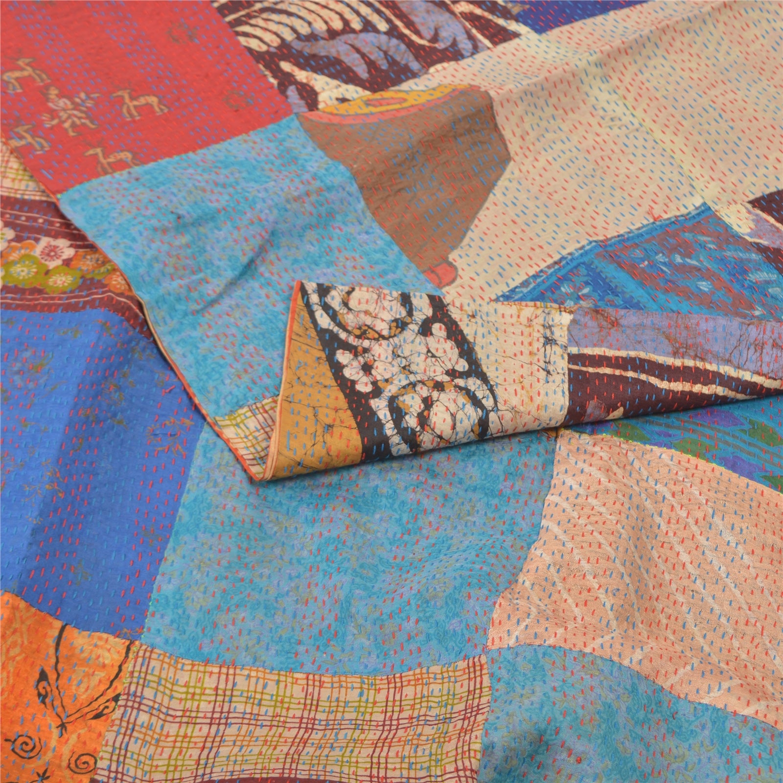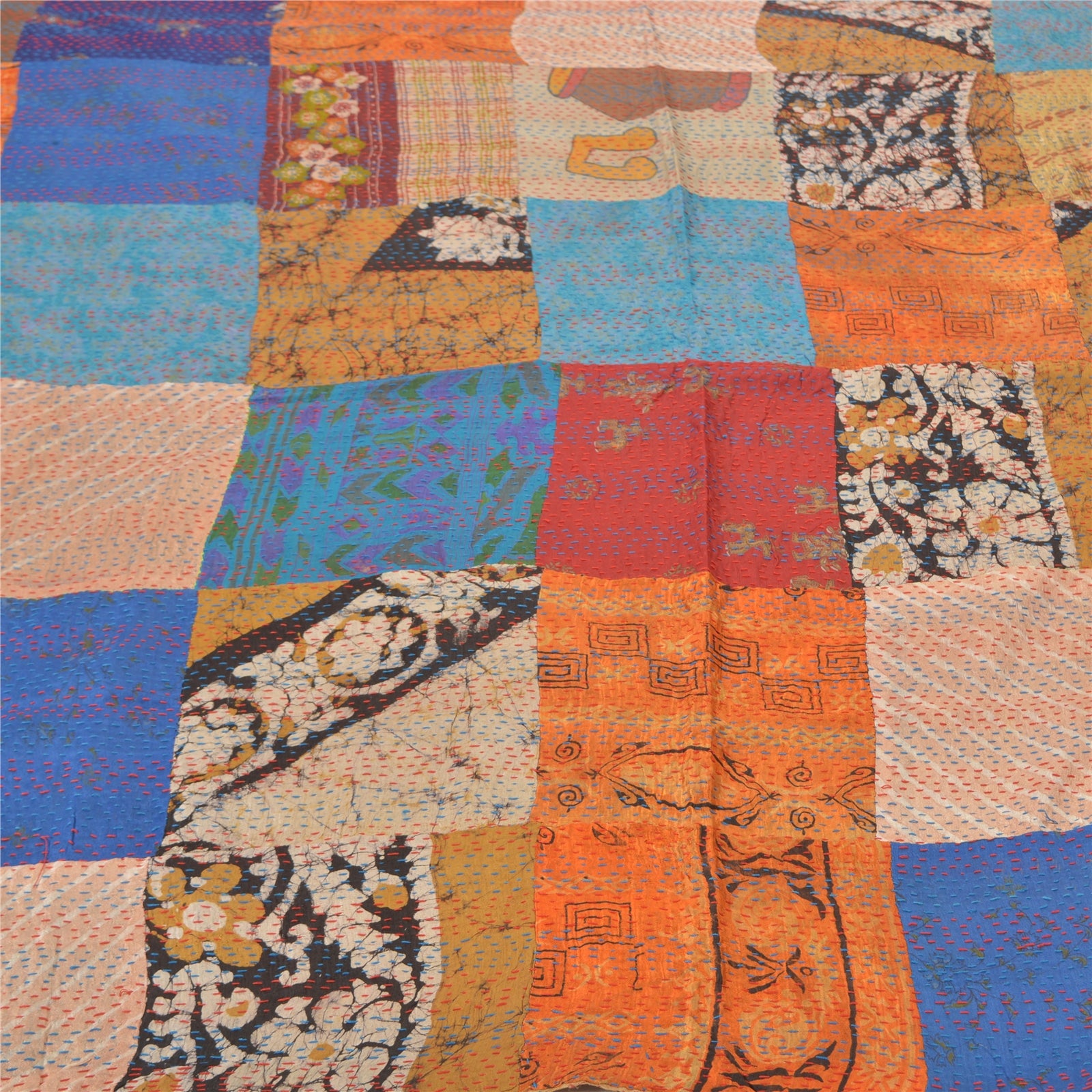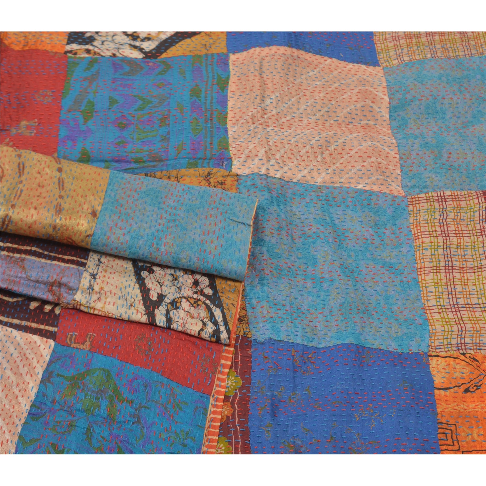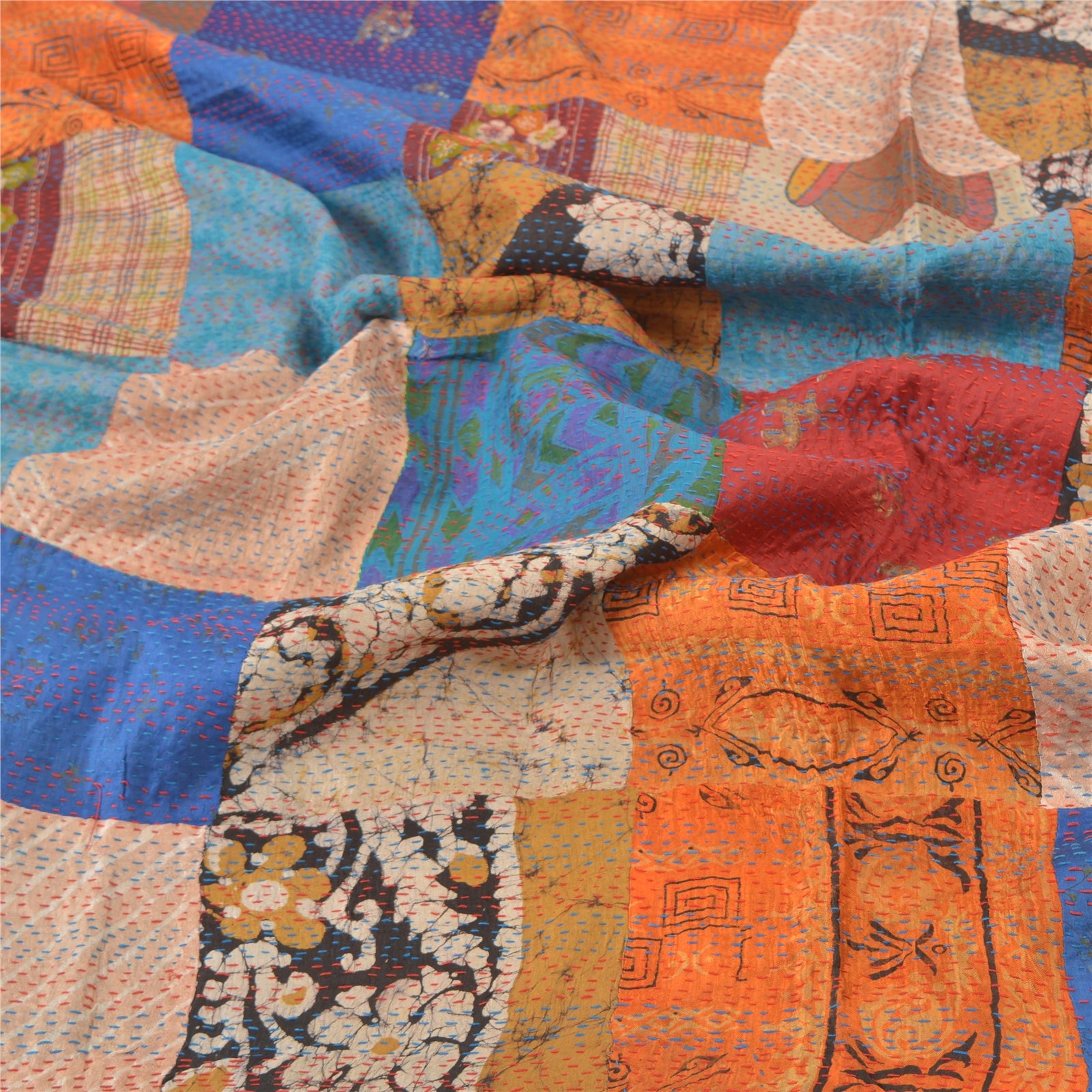 Sanskriti Proffers this Vintage Elegant multicolor 100% Pure Silk hand embroidered patch work kantha long scarf/dupatta. This dupatta is lines design embroidered with red&blue thread work on multicolor base Sustainable Fabric. This stole from Bengal is hand embroidered with the traditional kantha running stitch in a beautiful pattern. What is Kantha Embroidery? Kantha (also spelled kanta, and qanta) is a type of embroidery craft in the eastern regions of the Indian subcontinent, specifically in Bangladesh and in the Indian states of West Bengal, Tripura and Odisha. In Odisha, old saris are stacked on each other and hand-stitched to make a thin piece of cushion. This is normally used above a bed cushion or instead of a cushion.[1] "Kantha saris" are traditionally worn by women in Bengal region of the Indian subcontinent.[2] In these days, embroidery is stitched, popularly known as 'kantha stitched", on sari, kurta (or panjabi) and churidar and many other garments and gaining popularity due to their aesthetic value and handmade characteristics. Kantha stitching is also used to make simple quilts, commonly known as nakshi kantha. Women in Bengal typically use old saris and cloth and layer them with kantha stitching to make a light blanket, throw, or bedspread, especially for children. Kantha is very popular with tourists visiting the Bengal region of the Indian subcontinent. As the product is vintage, some mild stains/damages are expected.