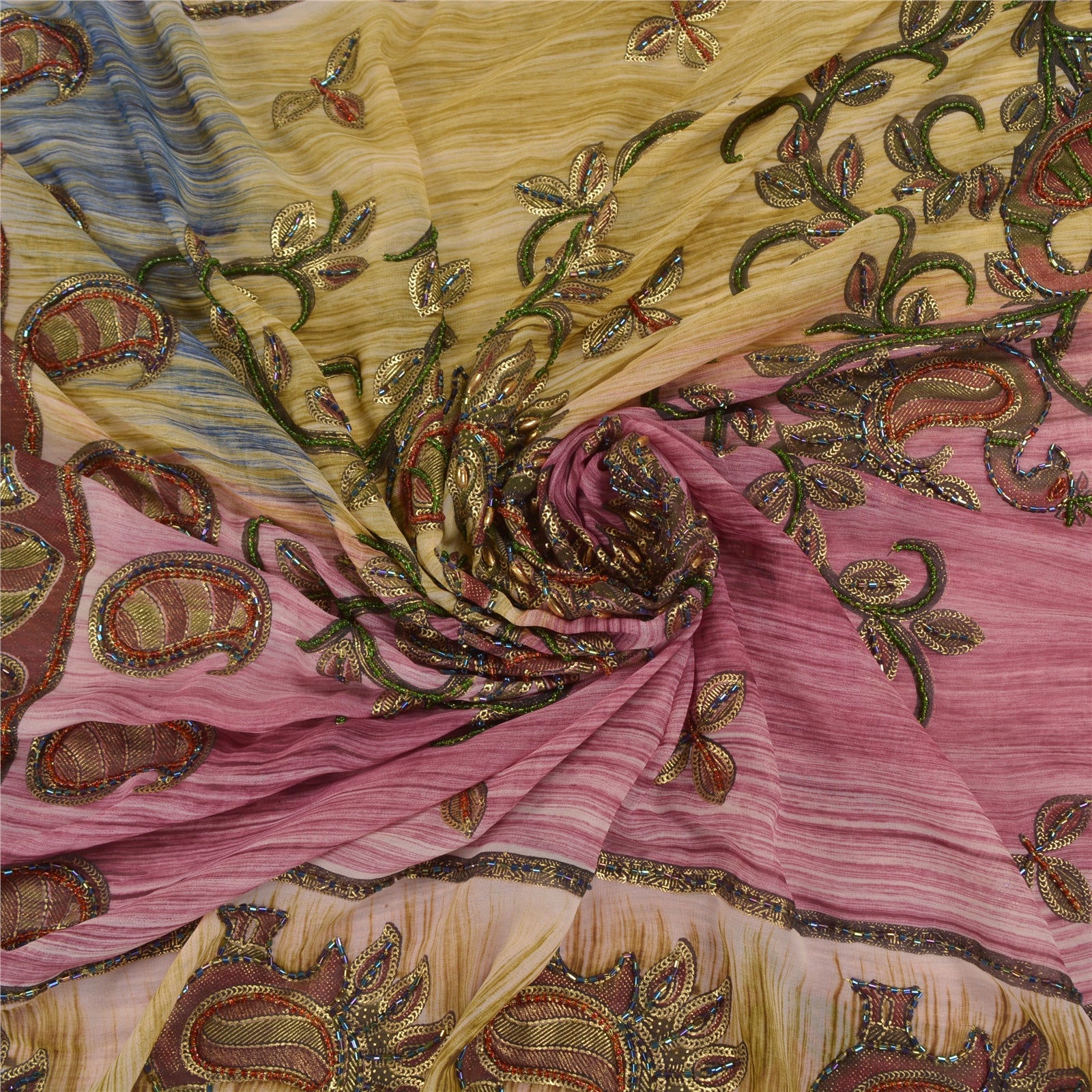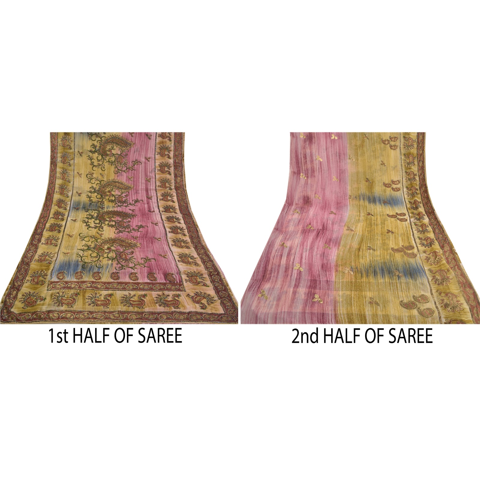 Sanskriti Vintage Indian Sarees Georgette Glass Beads Sari Craft Painted Fabric