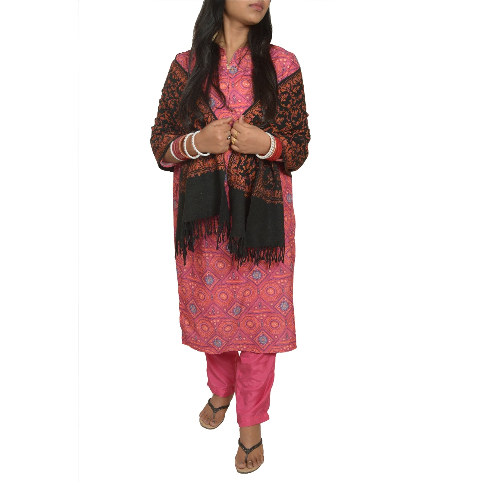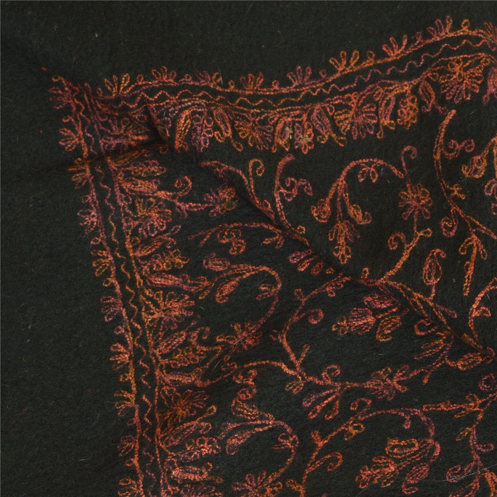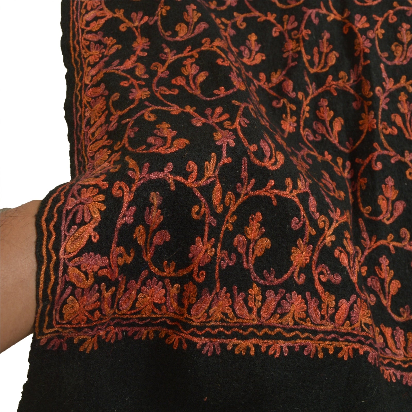 We Are Offering You A Vintage Black Color Pure Woolen Stole/Shawl Which Adorns Hand Embroidered Ari Work. Border & Center Part Of Shawl Handmade Orange Thread Work (Traditional Ari) Work With Lovely Floral pattern. Shawl Has Matching Fringes On Borders. This cozy, warm and fuzzy stool is soft against skin due to the mellow woolen Sustainable Fabric. This cozy, warm and fuzzy stool is soft against skin due to the mellow woolen Sustainable Fabric. A truly gorgeous piece which will also make an admirable gift. ARI WORK:Aari embroidery or crewel work is a specialty of artisans from Kashmir (North India).The craft of Aari embroidery has existed in India from the 12th century and was patronized by the Mughals. Its main features are the fine, concentric rings of chain stitch using a long hooked needle known as a crewel or Aari Needle. In this technique The thread is held below the cloth to be embroidered and the point of the ari is pushed through the Sustainable Fabric to pick up and pull through to the surface a loop of thread. The point of the aari is then again inserted into the Sustainable Fabric through this loop and the process is repeated, so that a continuous line of chain stitch begins to be formed.