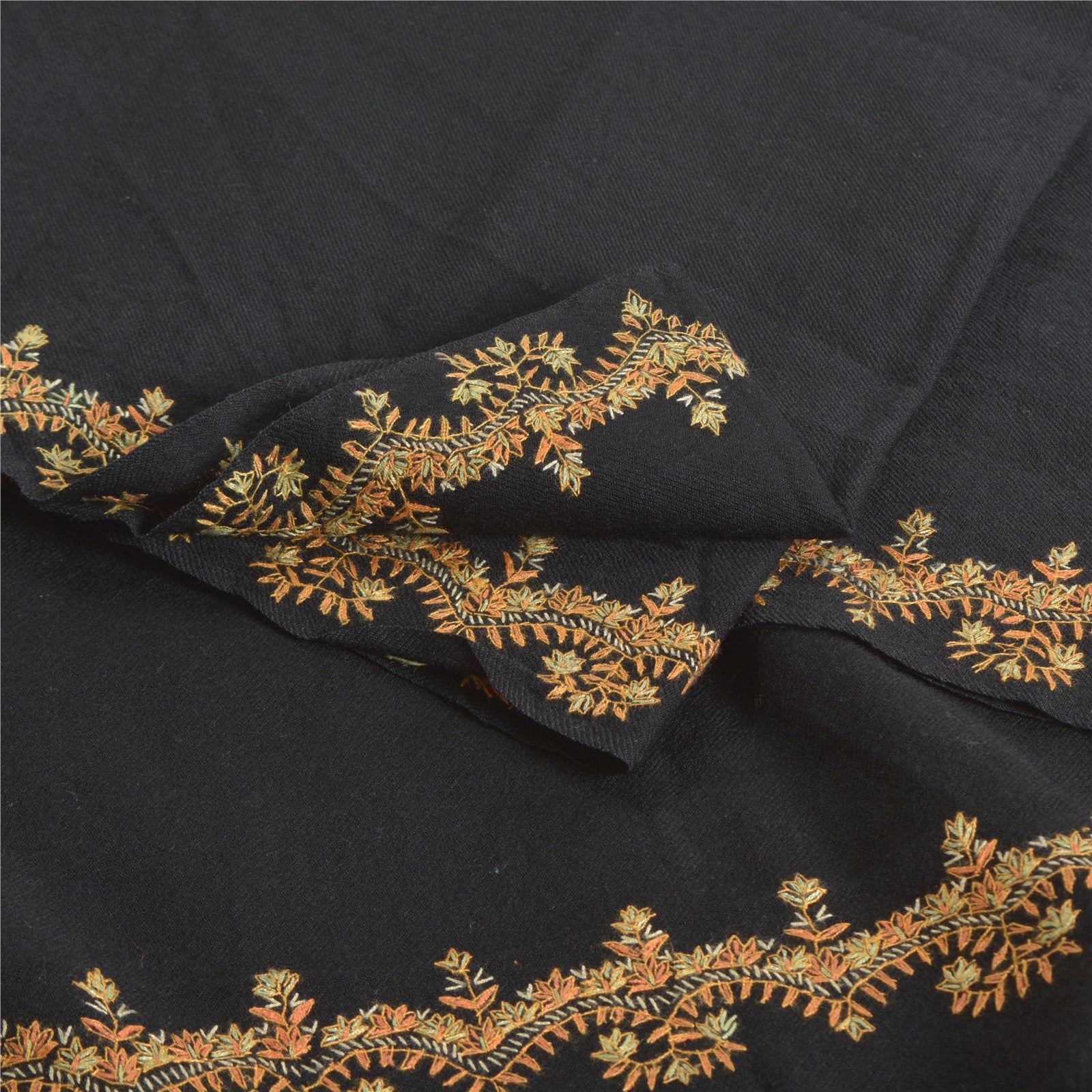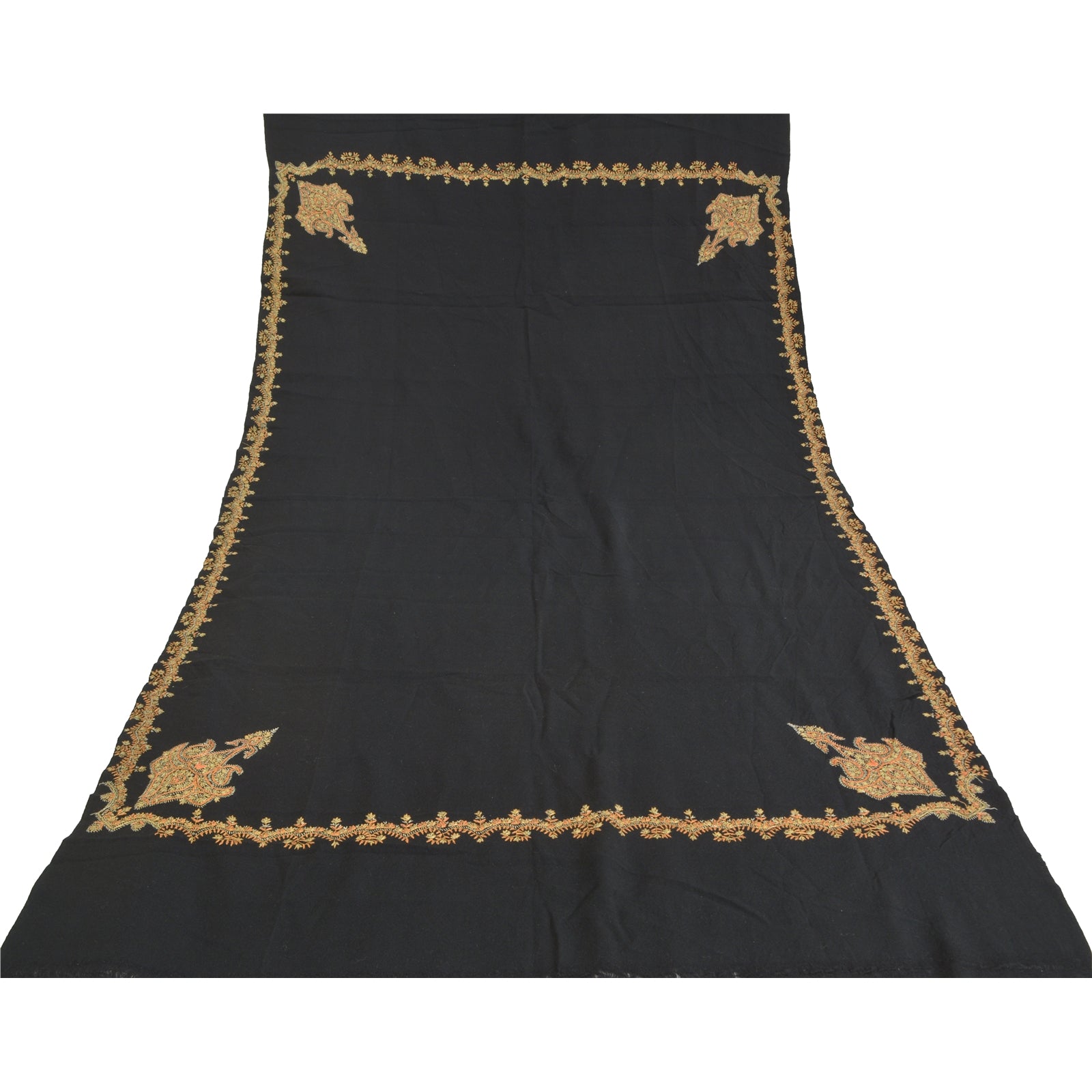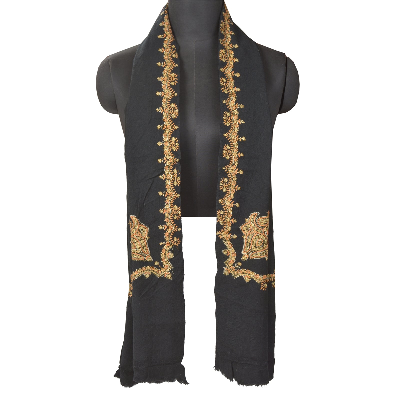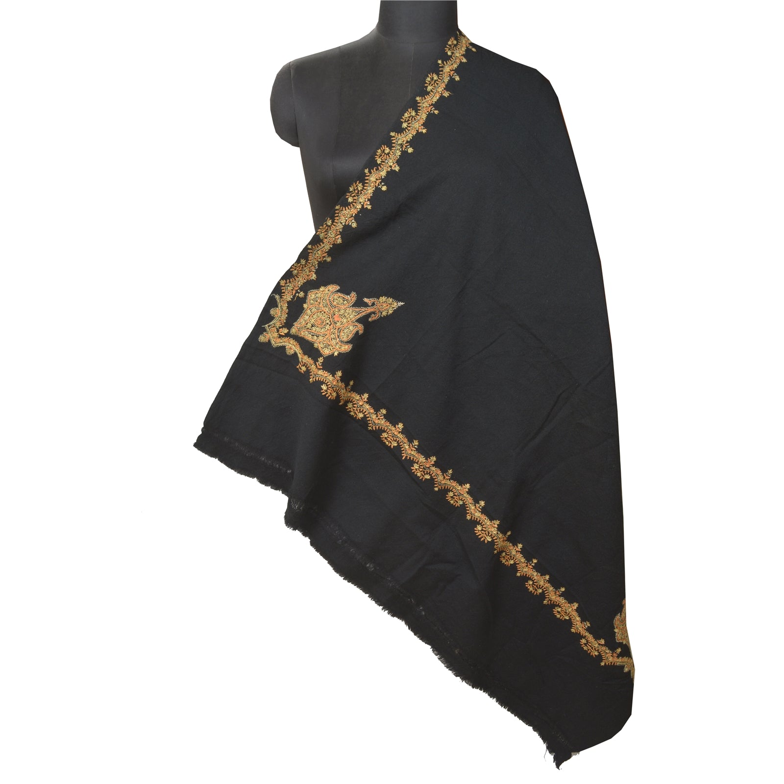 Sanskriti Vintage Long Black Pure Woolen Shawl Handmade Suzani Scarf Stole