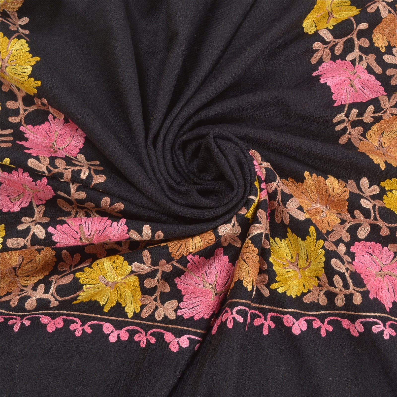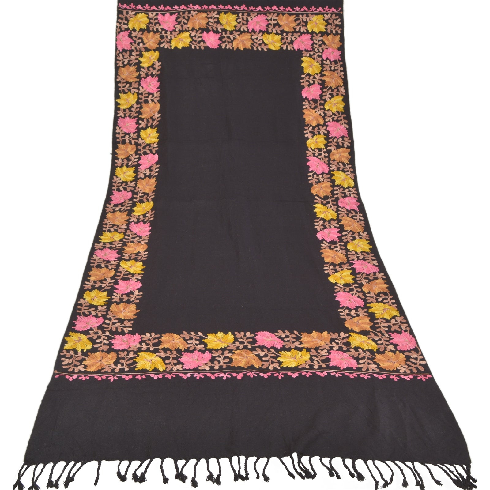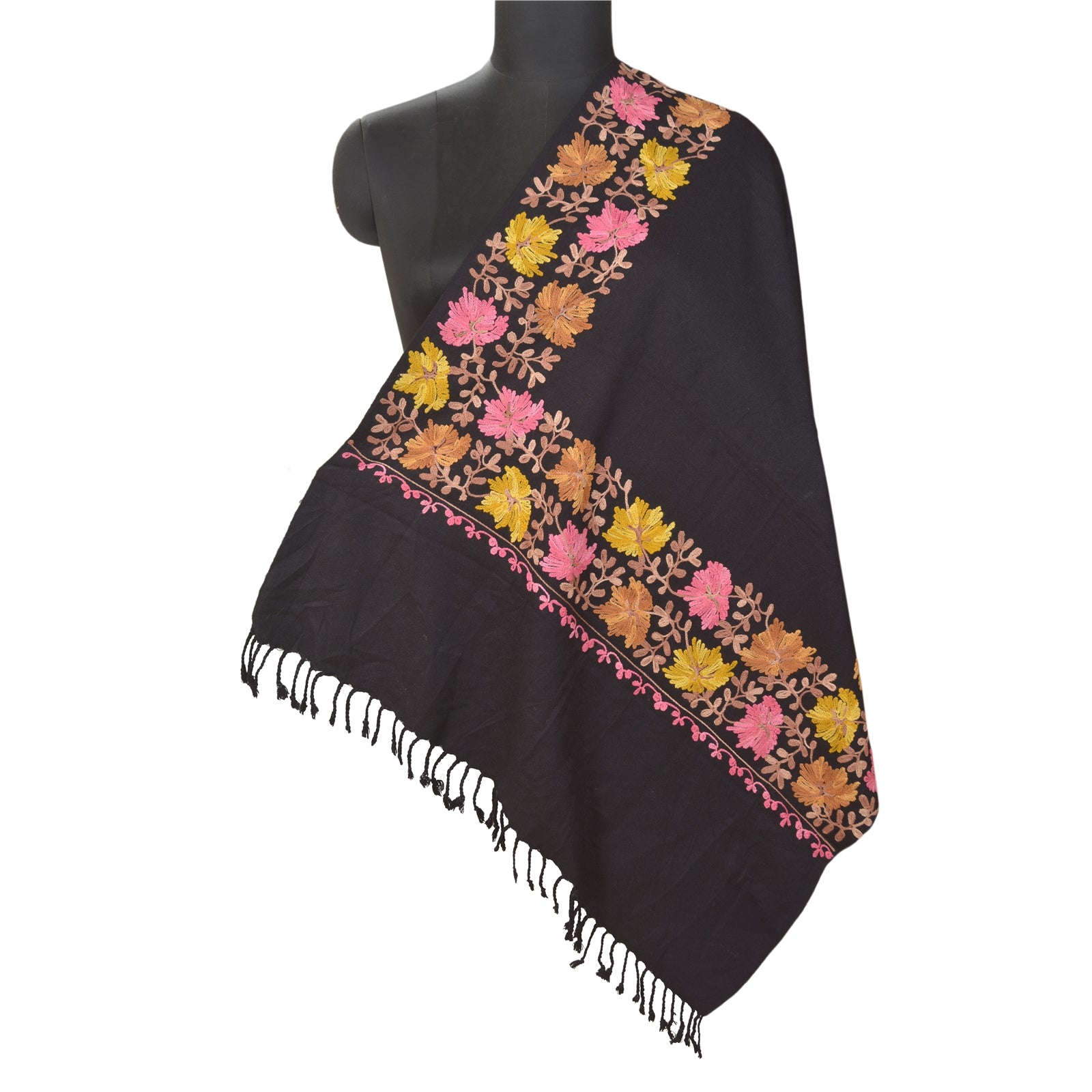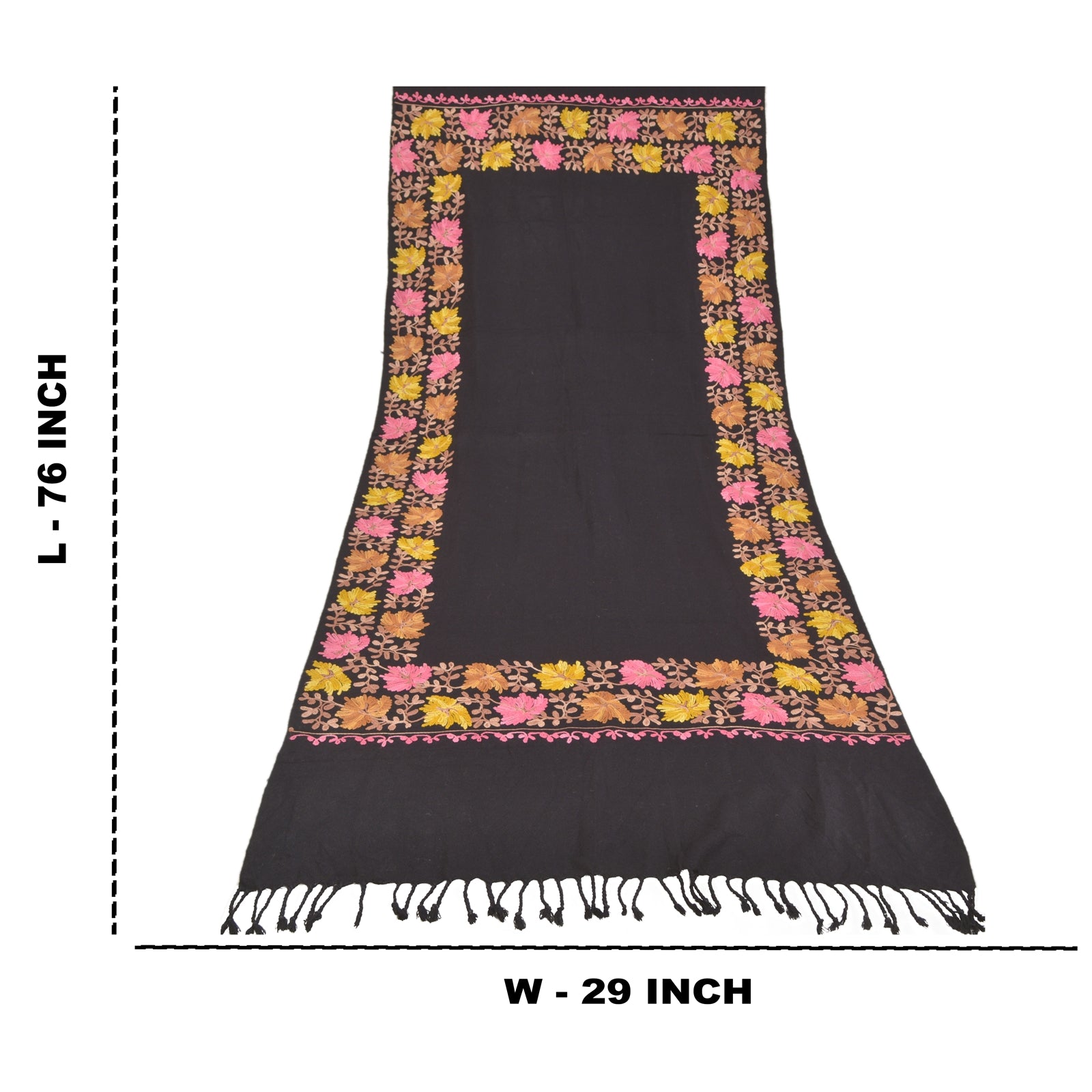 Sanskriti Vintage Long Black Woolen Shawl Handmade Ari Work Scarf Throw Stole