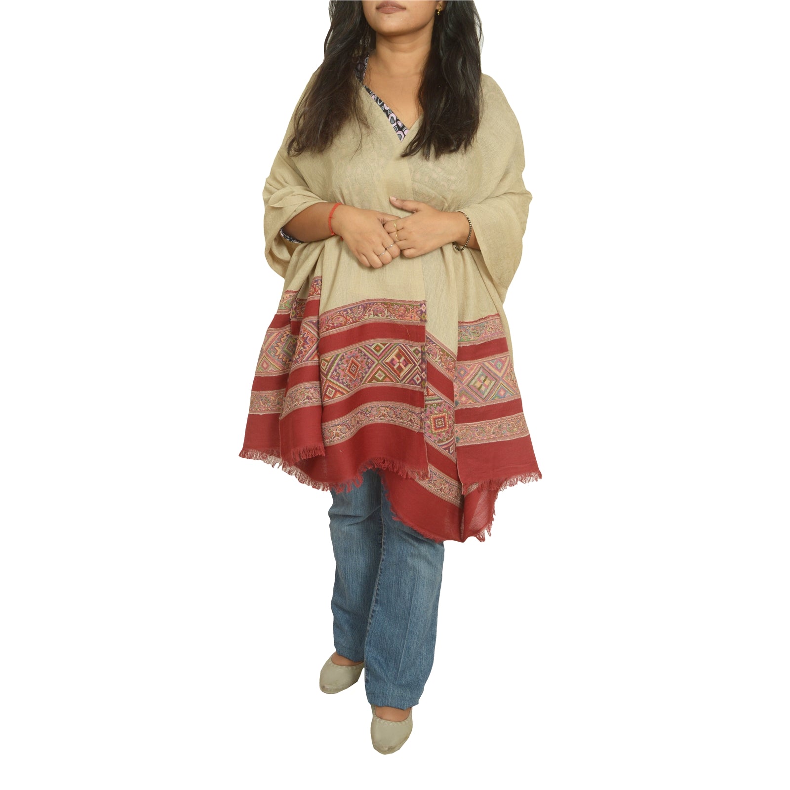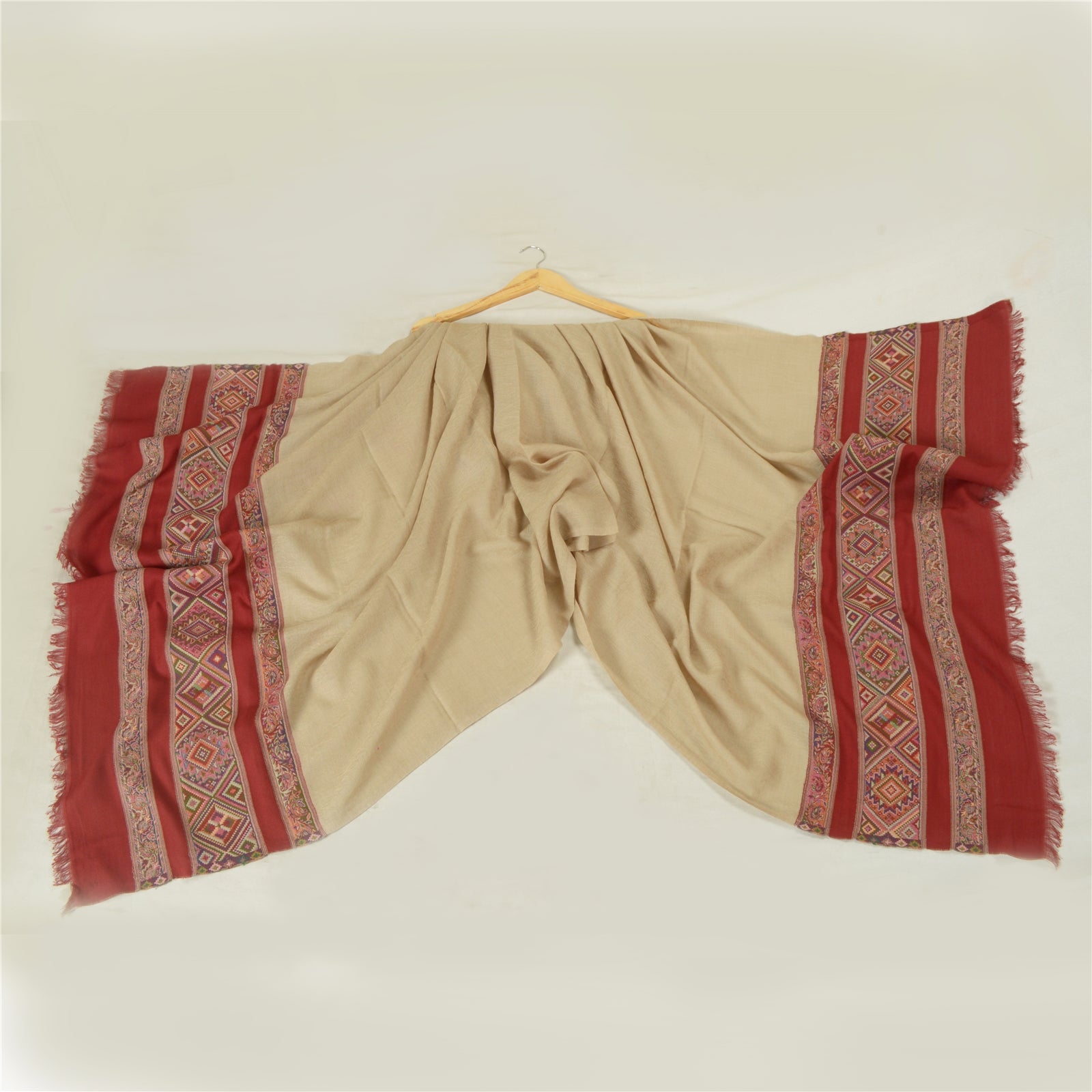 Sanskriti Vintage Long Ivory/Red Woolen Shawl Pure Woven Scarf Throw Soft Stole