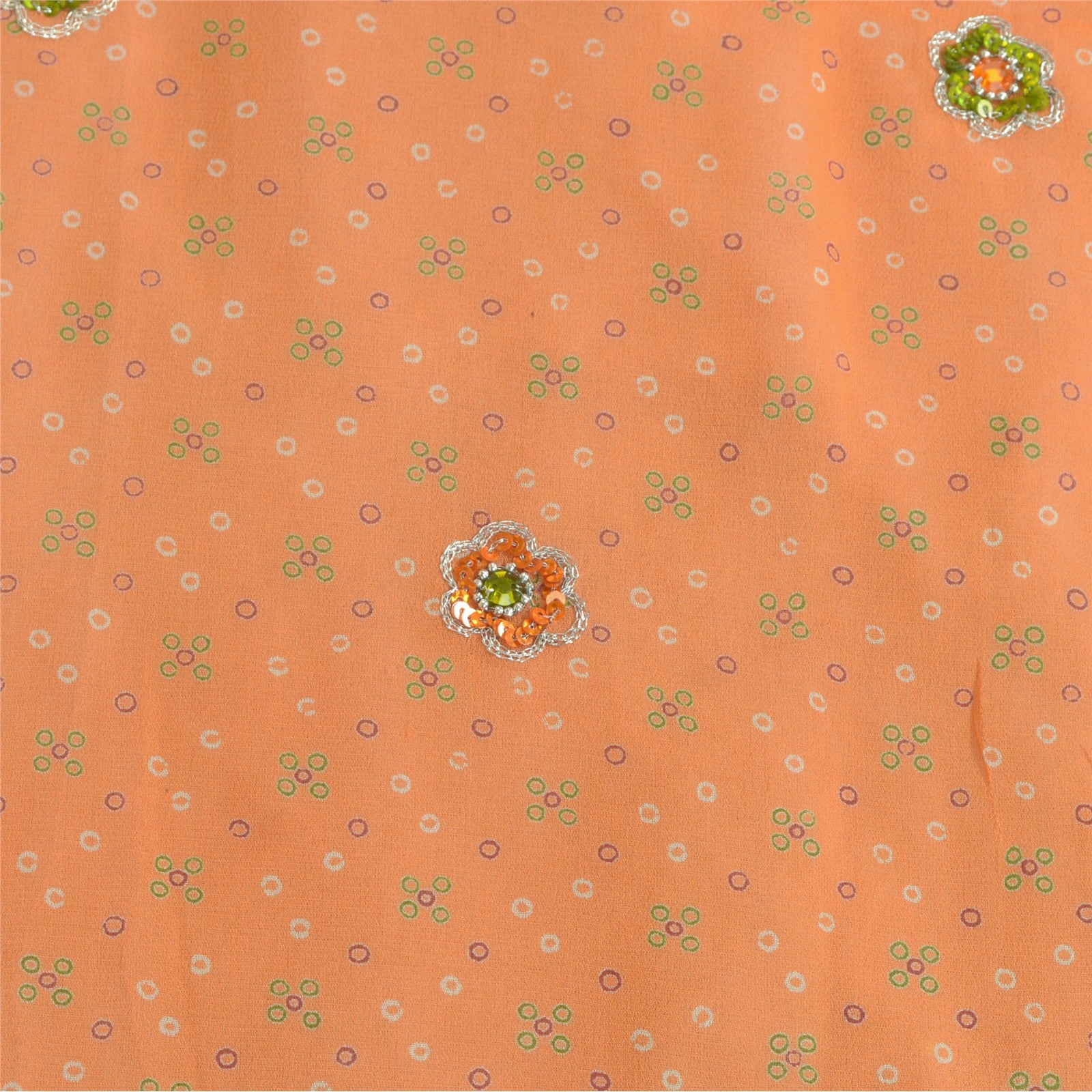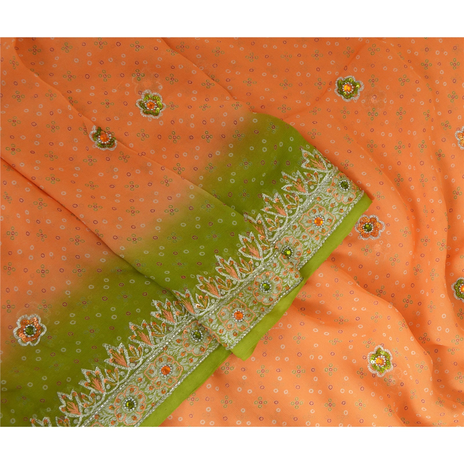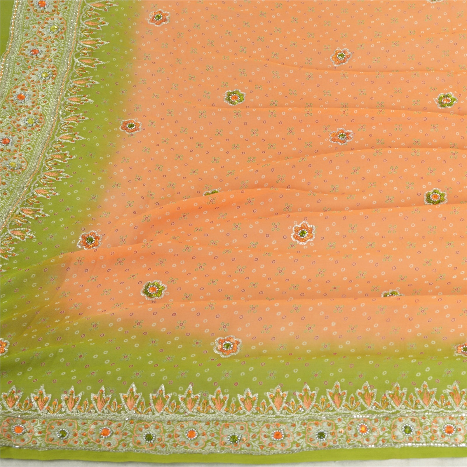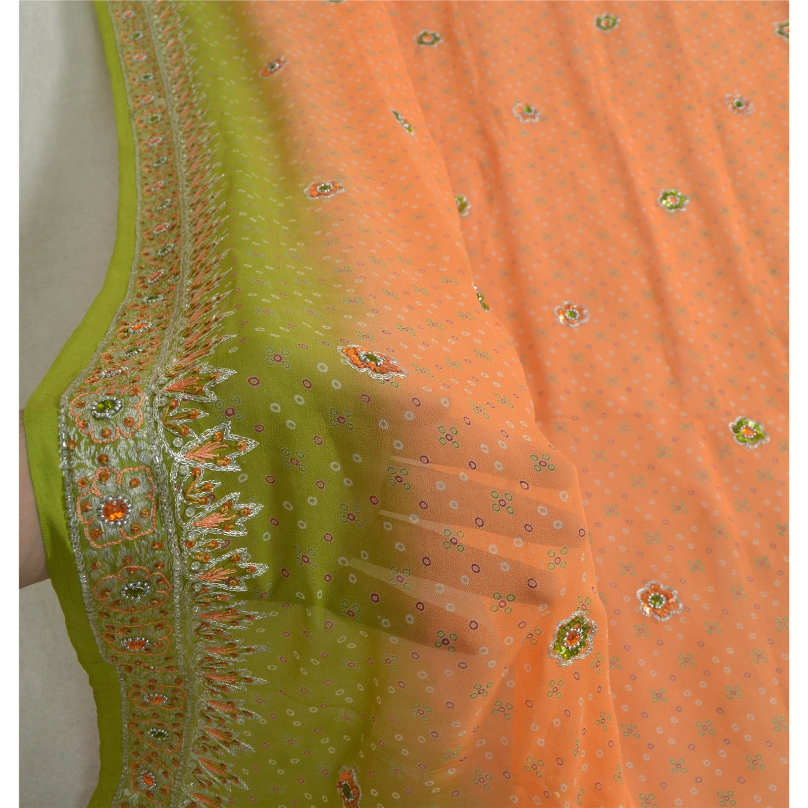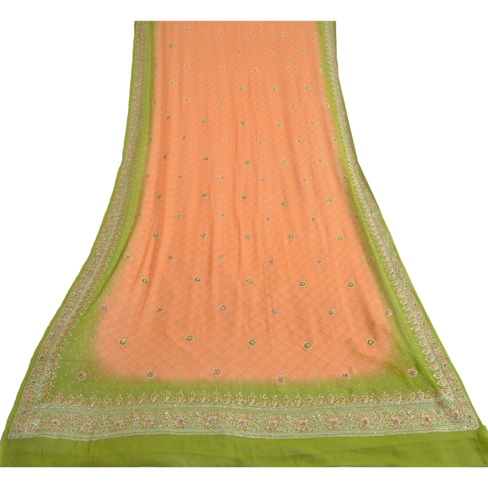'THE ITEM COLOR OR SHADE MAY BE DARKER OR LIGHTER THAN THE PICTURE.' Beautiful peach & green colored 100% pure georgette silk hand embroidered woven long scarf/dupatta. Center portion of the dupatta printed floral design with sequins & rhinestones work. Border has woven floral design embellished with orange/silver sequins, white glass beads, green/orange rhinestones work is really enhancing beauty of the dupatta/stole. This dupatta/stole can be used for various crafting ideas too. Use it for dress designing, as a throw, as window dressing, upholstery, table linen and much more. Let your creative juices flow. International buyers please note: Import duties, taxes, and charges are not included in the item price or postage cost. These charges are the buyer's responsibility. Please check with your country's customs office to determine what these additional costs will be prior to bidding or buying. Buyer will pay custom duty/tax. It is calculated and charged differently by every country. As a seller I do not have any control over it. VAT or sales tax is calculated by the platform at the time of checkout. Customs charge is payable at the time of delivery.'