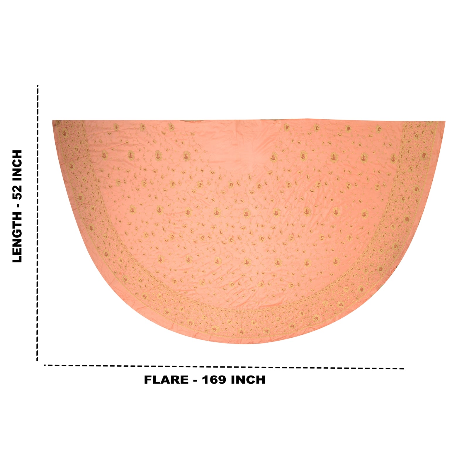 Sanskriti offers this vintage peach color unstitched long skirt made with 100% Pure Silk. Antique very heavy hand embroidered skirt. There is so much antique work done in this one, it is fully covered with zardozi work. Bottom of the skirt has floral design embellished with pure metallic golden/copper zardozi work. All over skirt has similar work with floral design. It is a unstitched skirt with a length of 43 inch and flare of the skirt is 159 inch. Flaunt this heavy skirt with ethnic tops, blouses or kurtis at parties, weddings and other occasions. Antique work skirt with beautiful craftsmanship which I am sure you will truly appreciate. The quality of zari work is amazing, its a pure metallic zari. Some zari work gives an antique look.