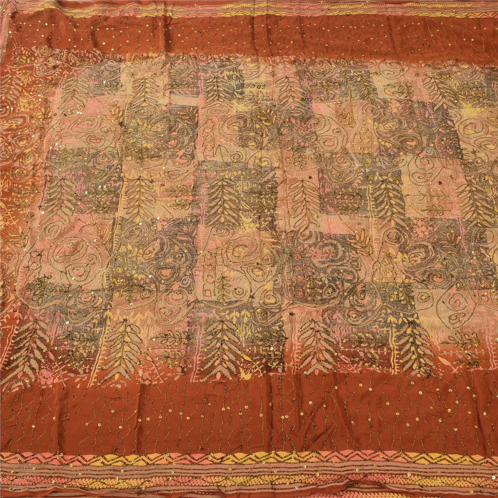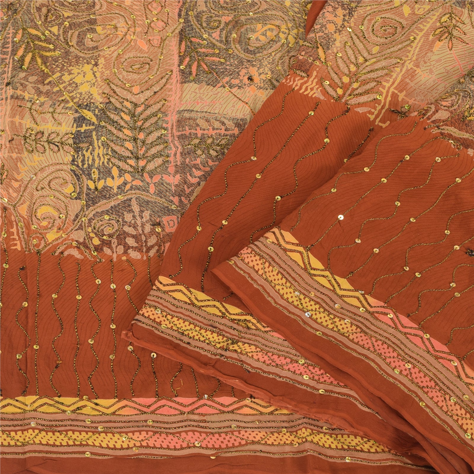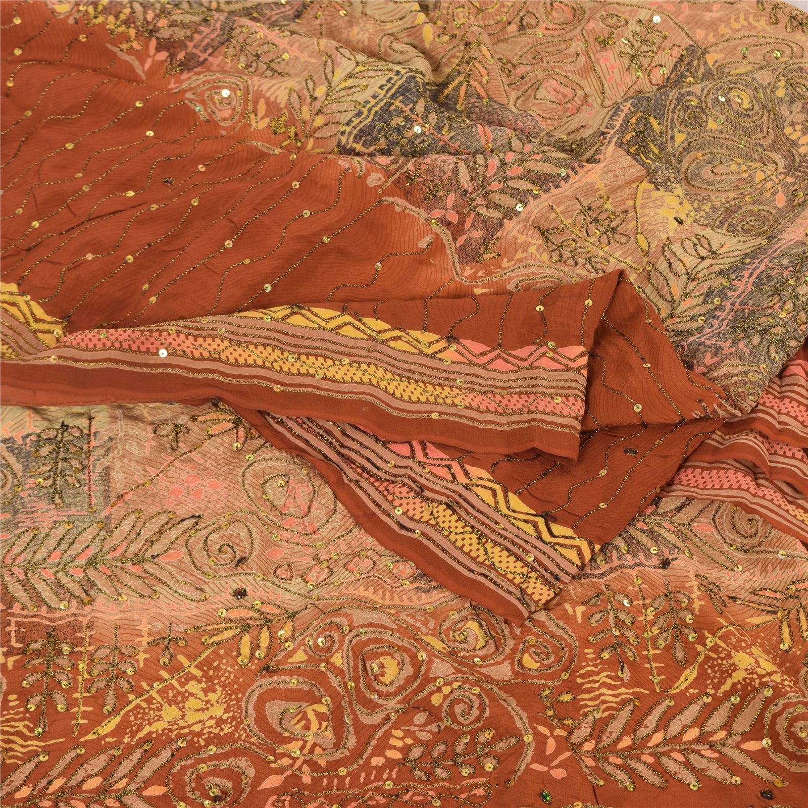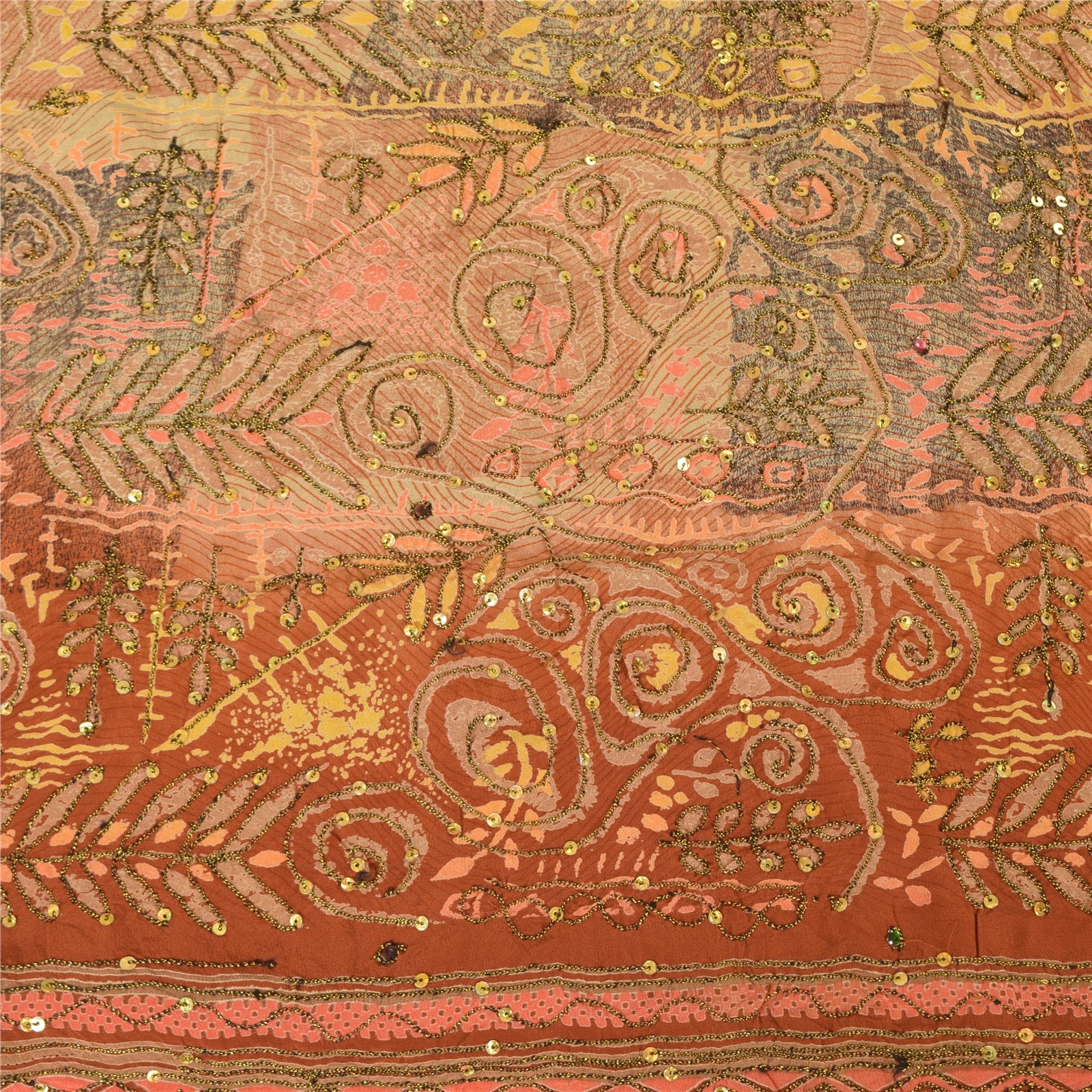 'THE ITEM COLOR OR SHADE MAY BE DARKER OR LIGHTER THAN THE PICTURE.' • Beautiful orange colored hand embroidered printed 100% pure crepe silk sari. • Pallu & border feature printed floral designs embellished with golden and black color thread work & golden sequins work. The center part of the sari has printed pattern with sequins work. As the product is vintage, some mild stains are expected This unique vintage saree can be used for various crafting ideas even if you don't want to use it as a sari. Design a dress, use it as a throw, as window dressing, upholstery, sarongs, table linen and much more. Let your creative juices flow and use this decorated Sustainable Fabric in multiple fashion. Shipping note: International buyers please note: Import duties, taxes, and charges are not included in the item price or postage cost. These charges are the buyer's responsibility. Please check with your country's customs office to determine what these additional costs will be prior to bidding or buying. Buyer will pay custom duty/tax. It is calculated and charged differently by every country. As a seller I do not have any control over it. VAT or sales tax is calculated by the platform at the time of checkout. Customs charge is payable at the time of delivery. SKU : PS-35586