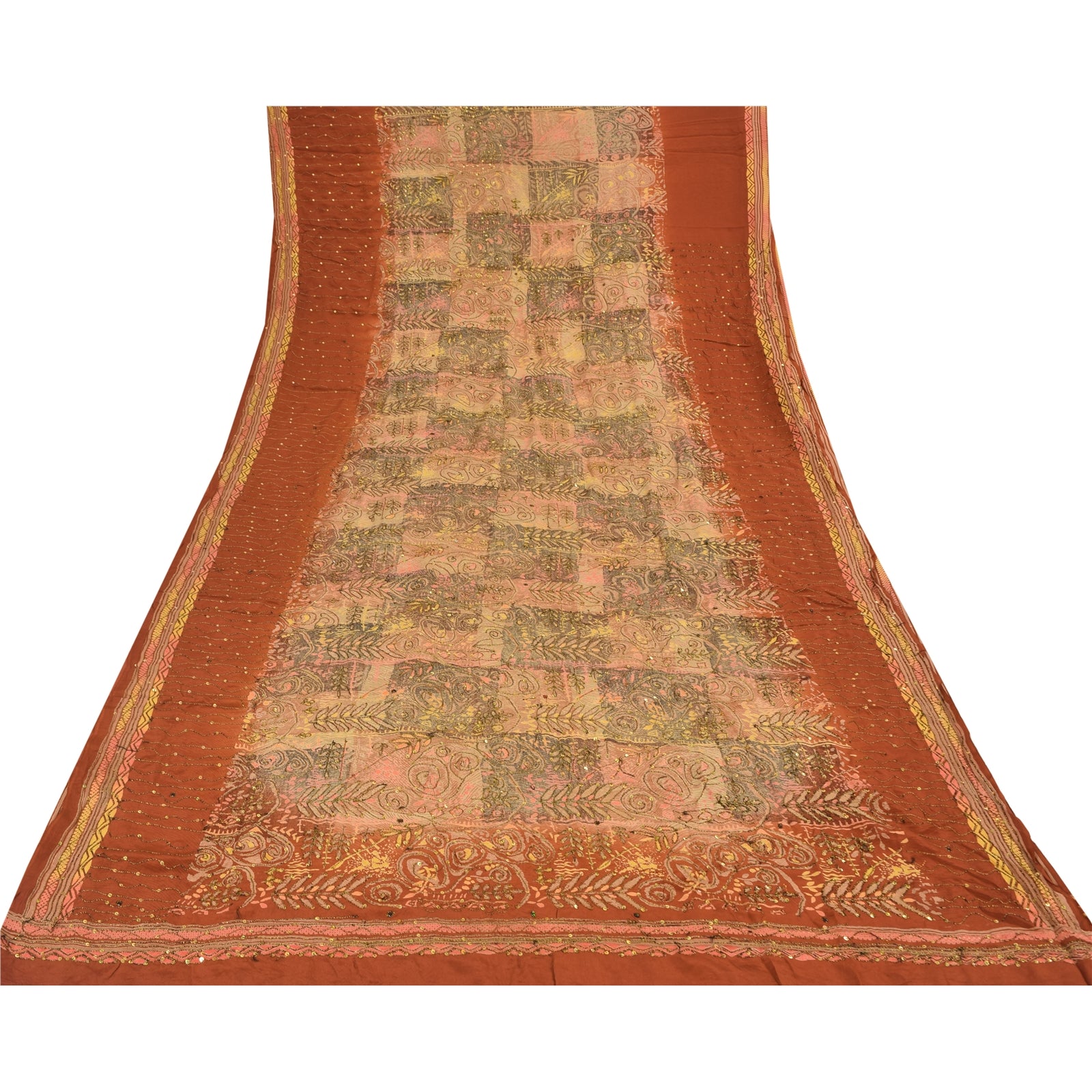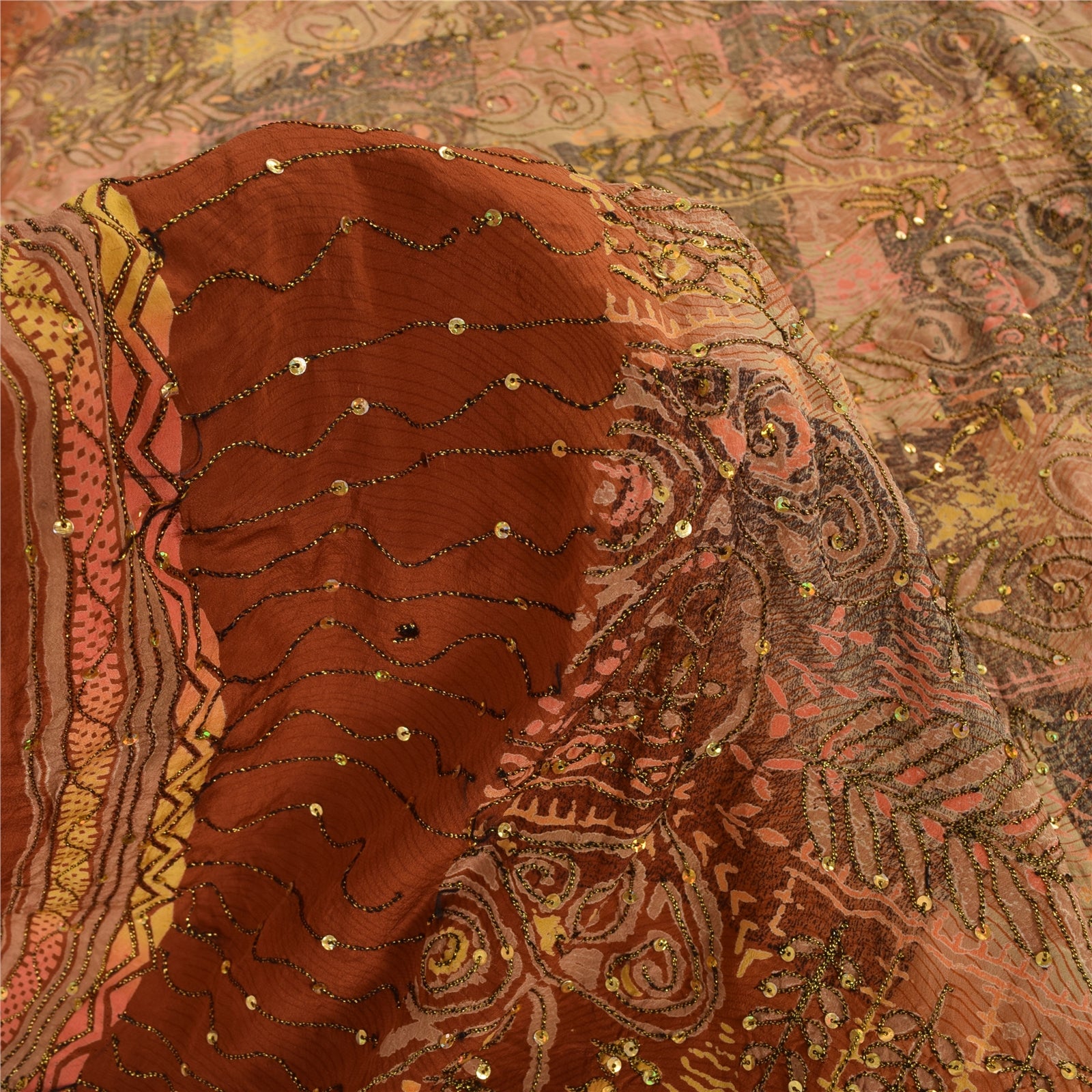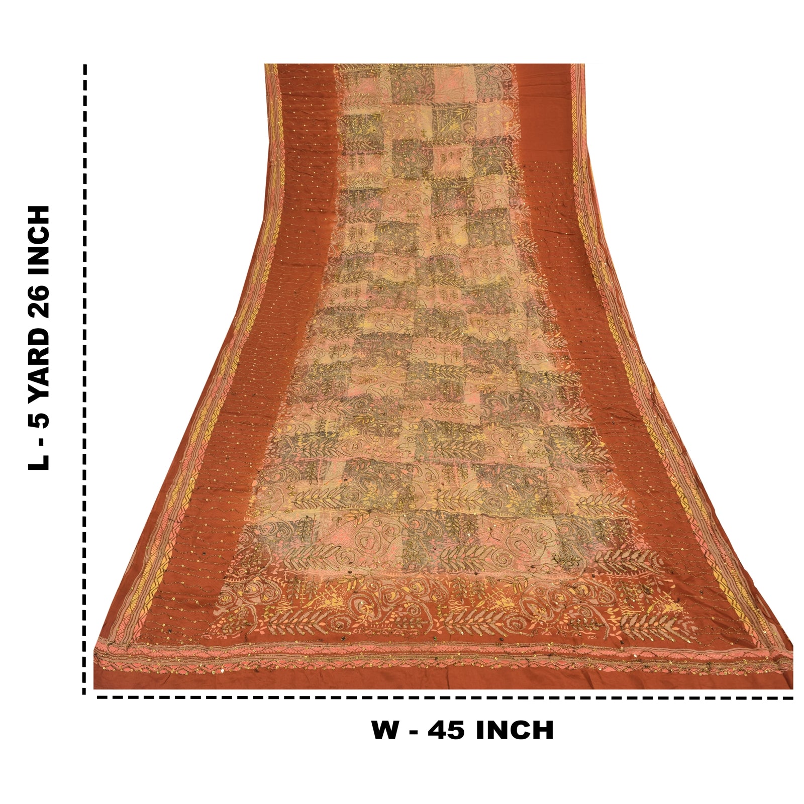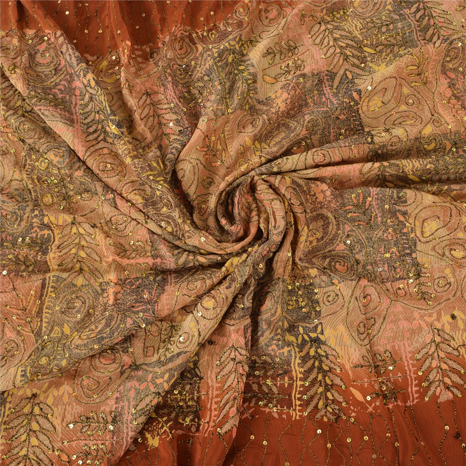 'THE ITEM COLOR OR SHADE MAY BE DARKER OR LIGHTER THAN THE PICTURE.' • Beautiful orange colored hand embroidered printed 100% pure crepe silk sari. • Pallu & border feature printed floral designs embellished with golden and black color thread work & golden sequins work. The center part of the sari has printed pattern with sequins work. As the product is vintage, some mild stains are expected This unique vintage saree can be used for various crafting ideas even if you don't want to use it as a sari. Design a dress, use it as a throw, as window dressing, upholstery, sarongs, table linen and much more. Let your creative juices flow and use this decorated Sustainable Fabric in multiple fashion. Shipping note: International buyers please note: Import duties, taxes, and charges are not included in the item price or postage cost. These charges are the buyer's responsibility. Please check with your country's customs office to determine what these additional costs will be prior to bidding or buying. Buyer will pay custom duty/tax. It is calculated and charged differently by every country. As a seller I do not have any control over it. VAT or sales tax is calculated by the platform at the time of checkout. Customs charge is payable at the time of delivery. SKU : PS-35586