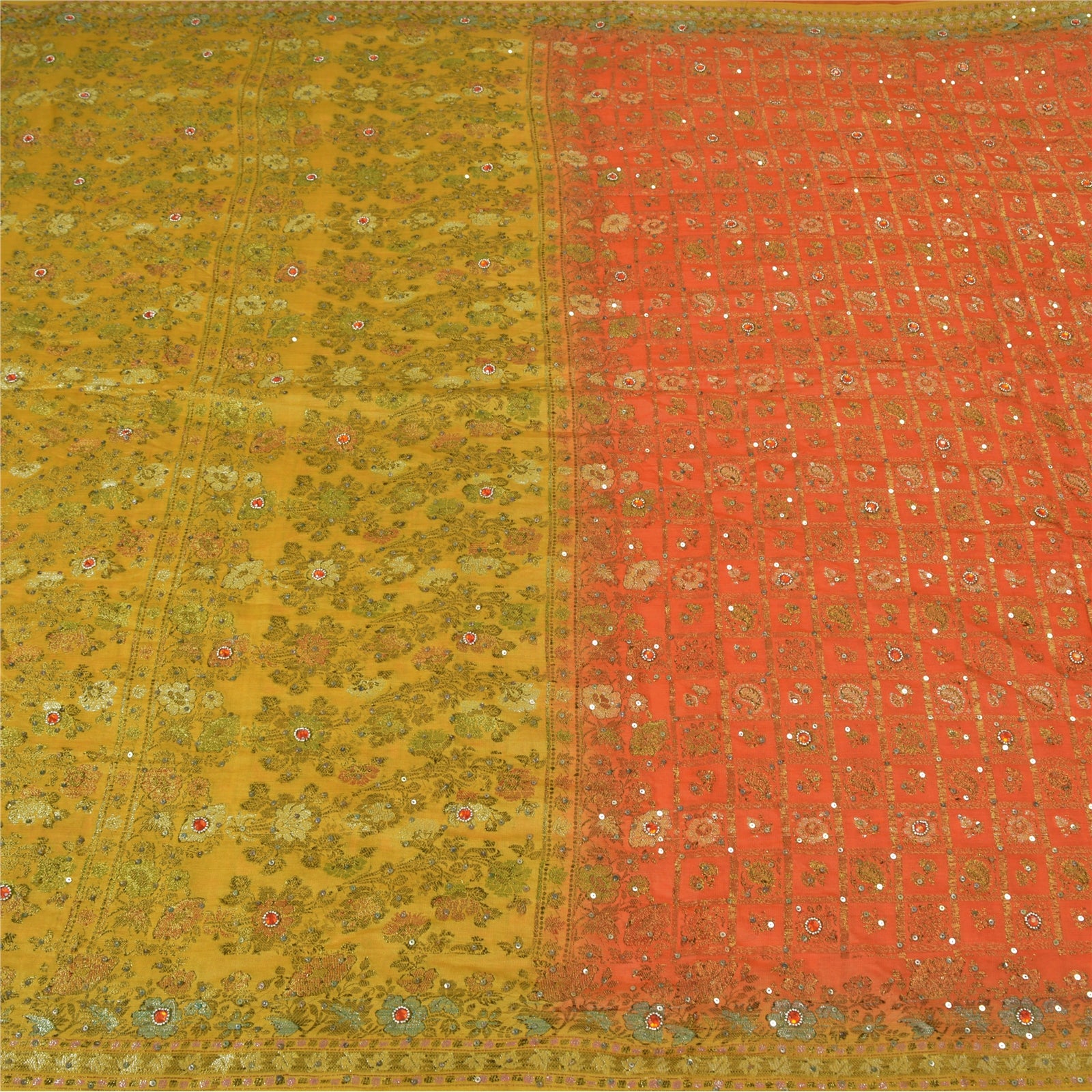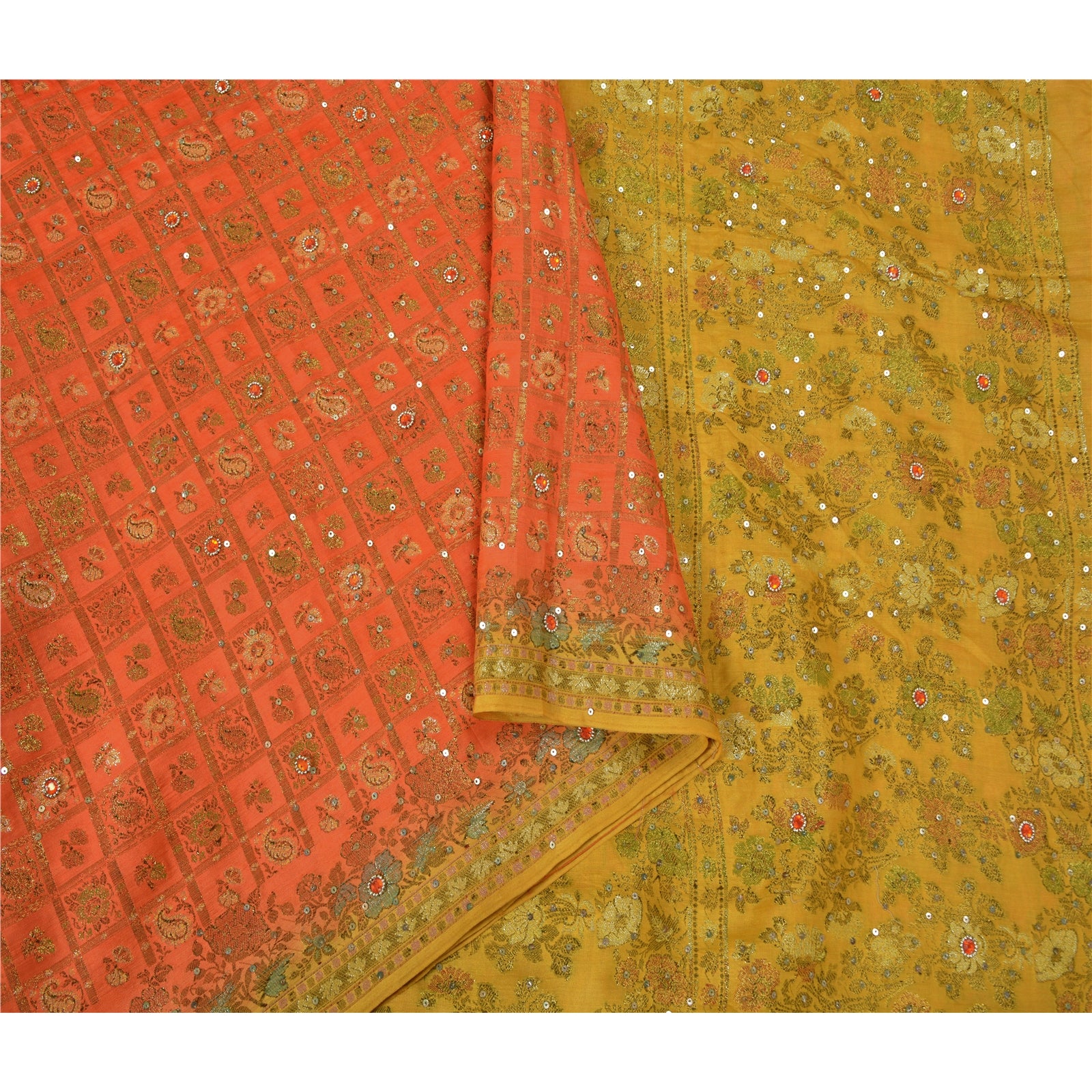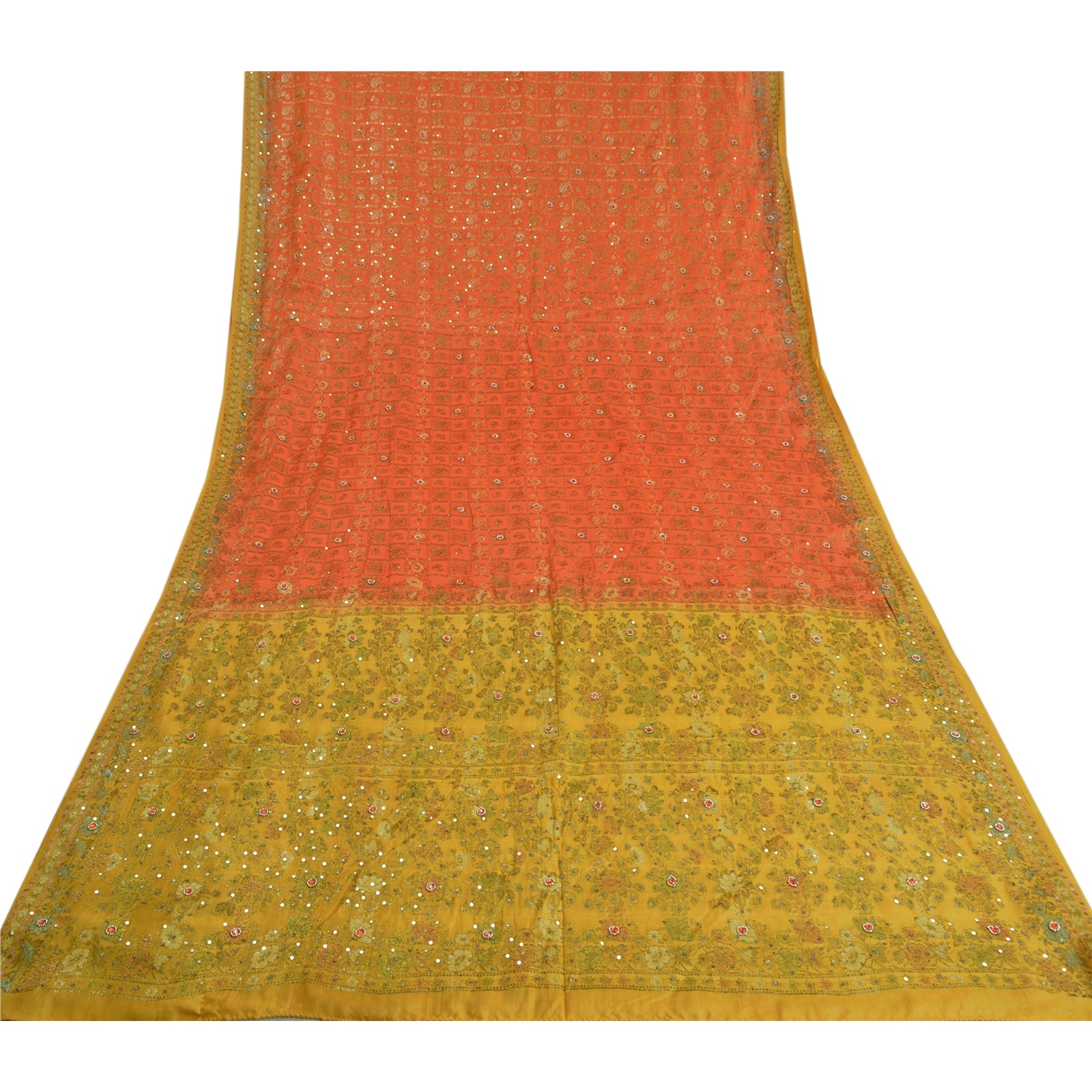 Beautiful orange & saffron colored pure silk hand embroidered woven sari. Pallu & Border has woven floral design embellished with golden sequins & beads, orange rhinestones work. The center of the saree has woven floral design with rhinestones work. This saree can be used for various crafting ideas too. Use it for dress designing, as a throw, as window dressing, upholstery, table linen and much more. Let your creative juices flow.