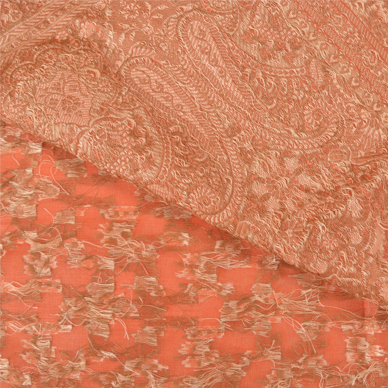 Beautiful peach & orange colored pure silk hand woven sari. Pallu & Border has floral & paisley design wit woven thread work. The center of the saree has floral pattern with woven work. This saree can be used for various crafting ideas too. Use it for dress designing, as a throw, as window dressing, upholstery, table linen and much more. Let your creative juices flow.