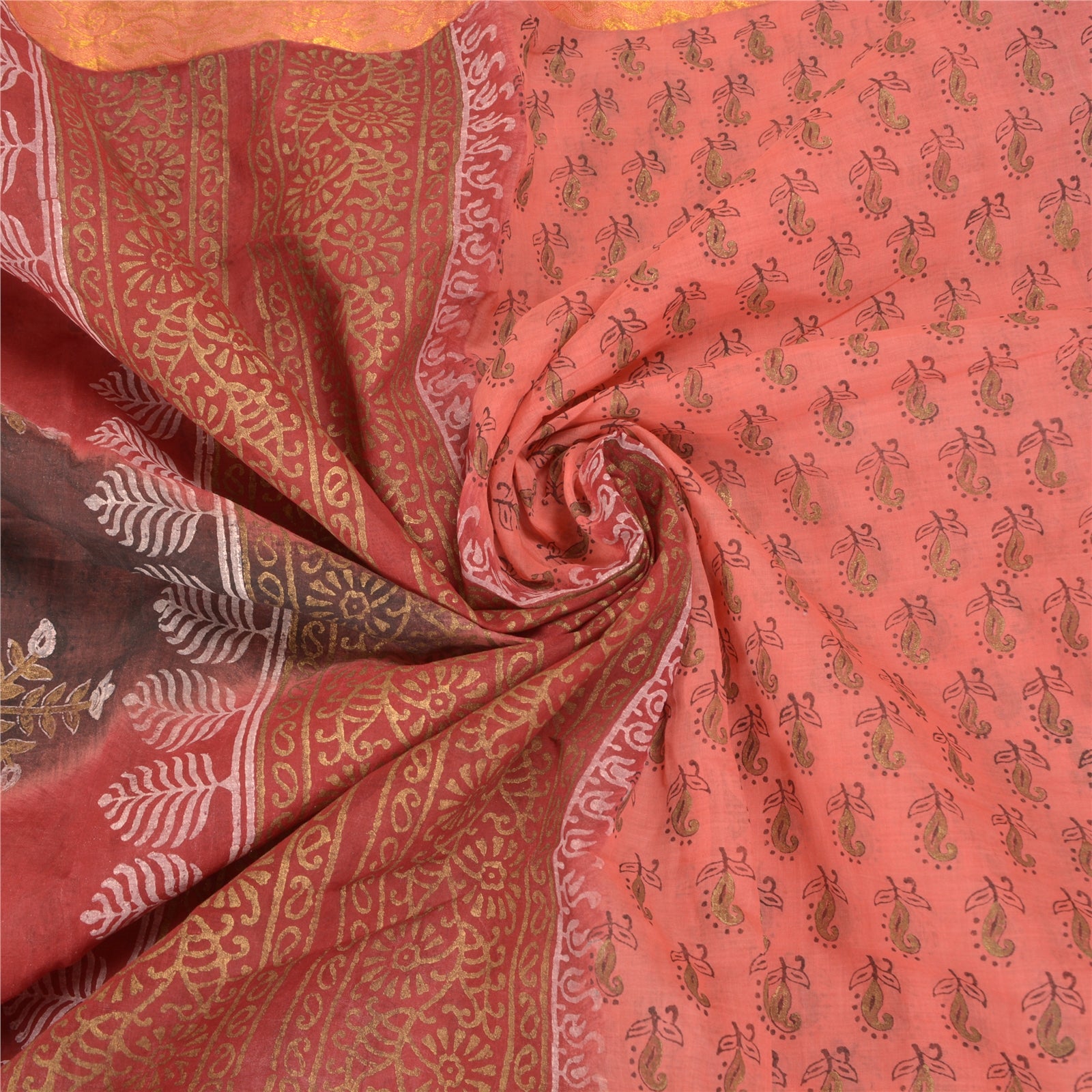 Beautiful Peach & Brown Colored 100% Pure Cotton Hand Painted Woven Sari. Pallu & Center part of the sari has golden hand painted work with paisley & floral design. You can see golden zari woven work with floral pattern. This saree can be used for various crafting ideas too. Use it for dress designing, as a throw, as window dressing, upholstery, table linen and much more. Let your creative juices flow. For USA buyers - Single item ships via registered air mail, buy 1 more to get FedEx.