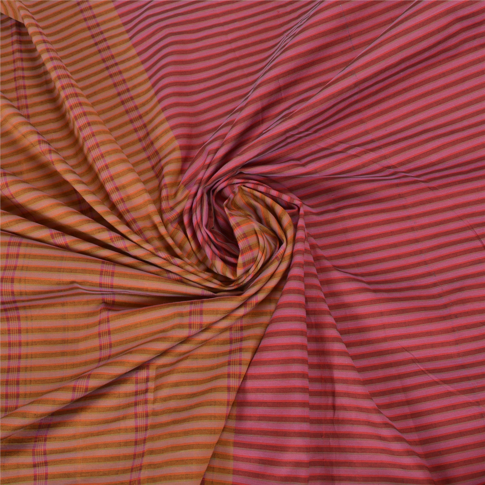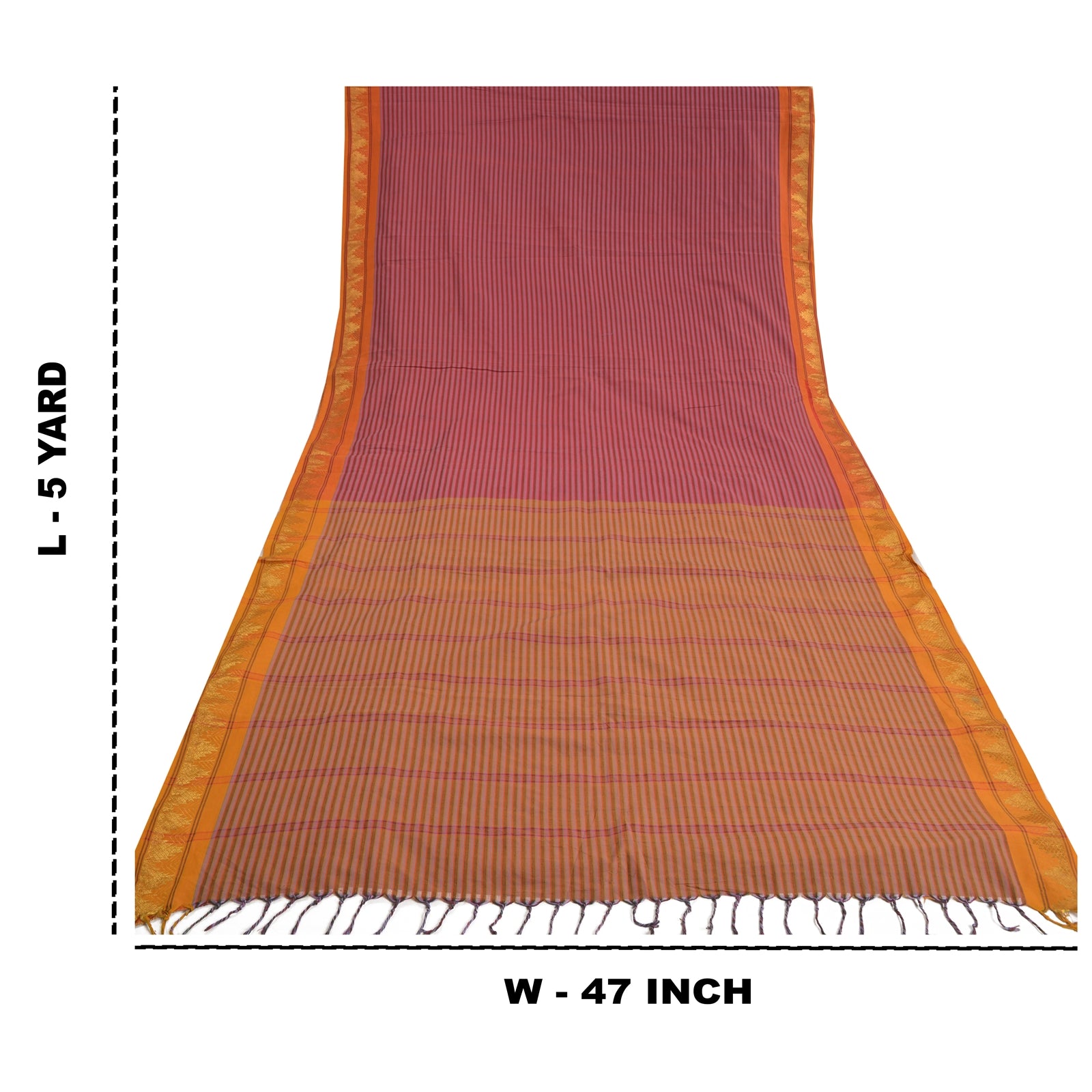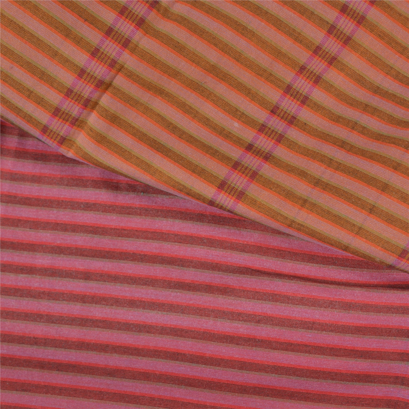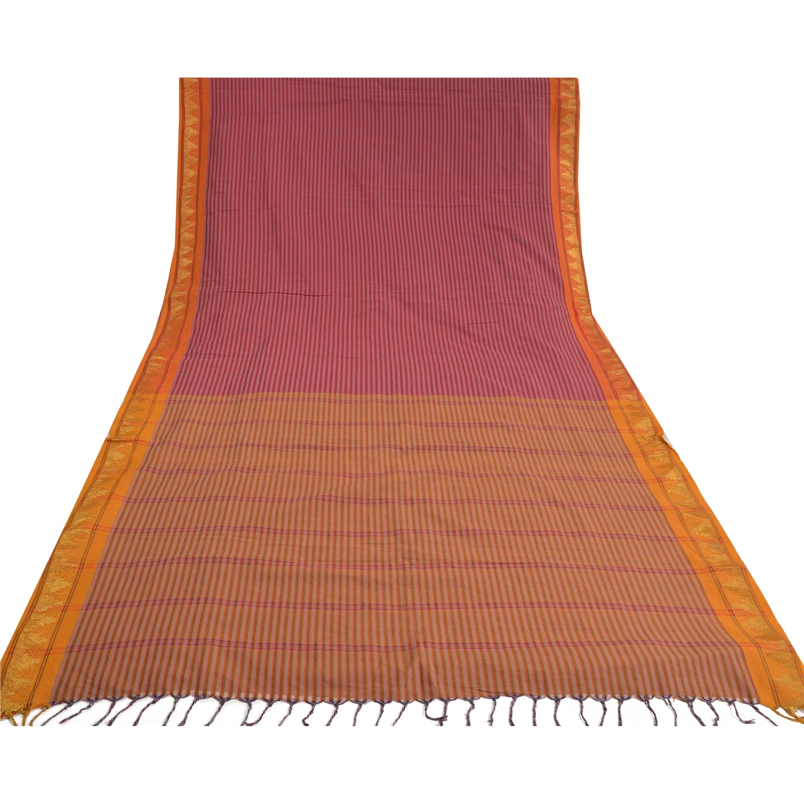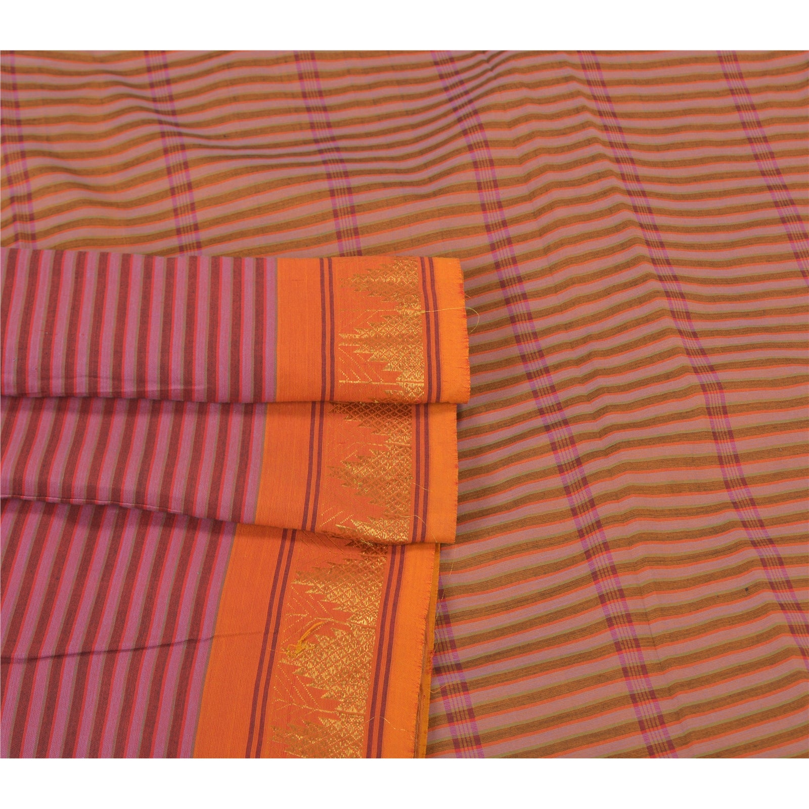 Beautiful pink & saffron colored blend cotton woven sari/Sustainable Fabric. Pallu & Border has floral design with woven grid pattern. Border has golden zari pattern. The center of the saree has similar woven lines pattern. This saree can be used for various crafting ideas too. Use it for dress designing, as a throw, as window dressing, upholstery, table linen and much more. Let your creative juices flow.