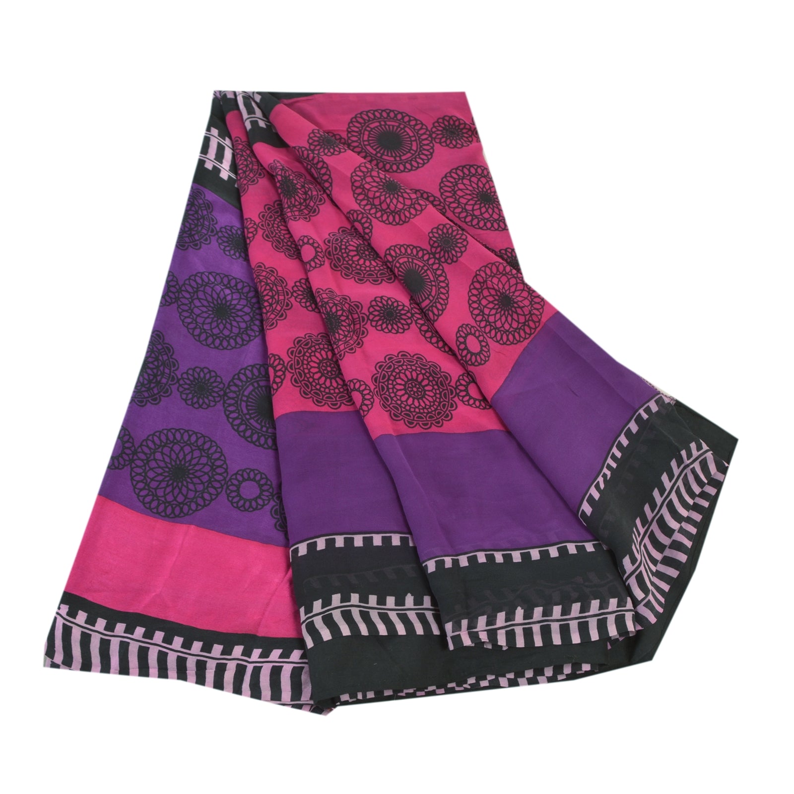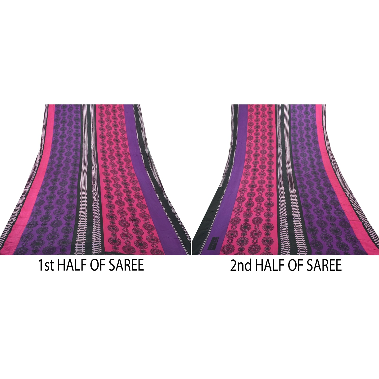 Fabulous pink & purple colored pure georgette silk printed saree. Allover sari has printed floral & circle design. What is special about this saree? Brilliant design on soft Sustainable Fabric is really enhancing the beauty of the saree.This unique vintage saree can be used for various crafting ideas even if you don't want to use it as a sari. Design a dress, use it as a as window dressing, upholstery, sarongs, throw, dress making and table linen much more. Let your creative juices flow and use this decorated Sustainable Fabric in multiple fashion.