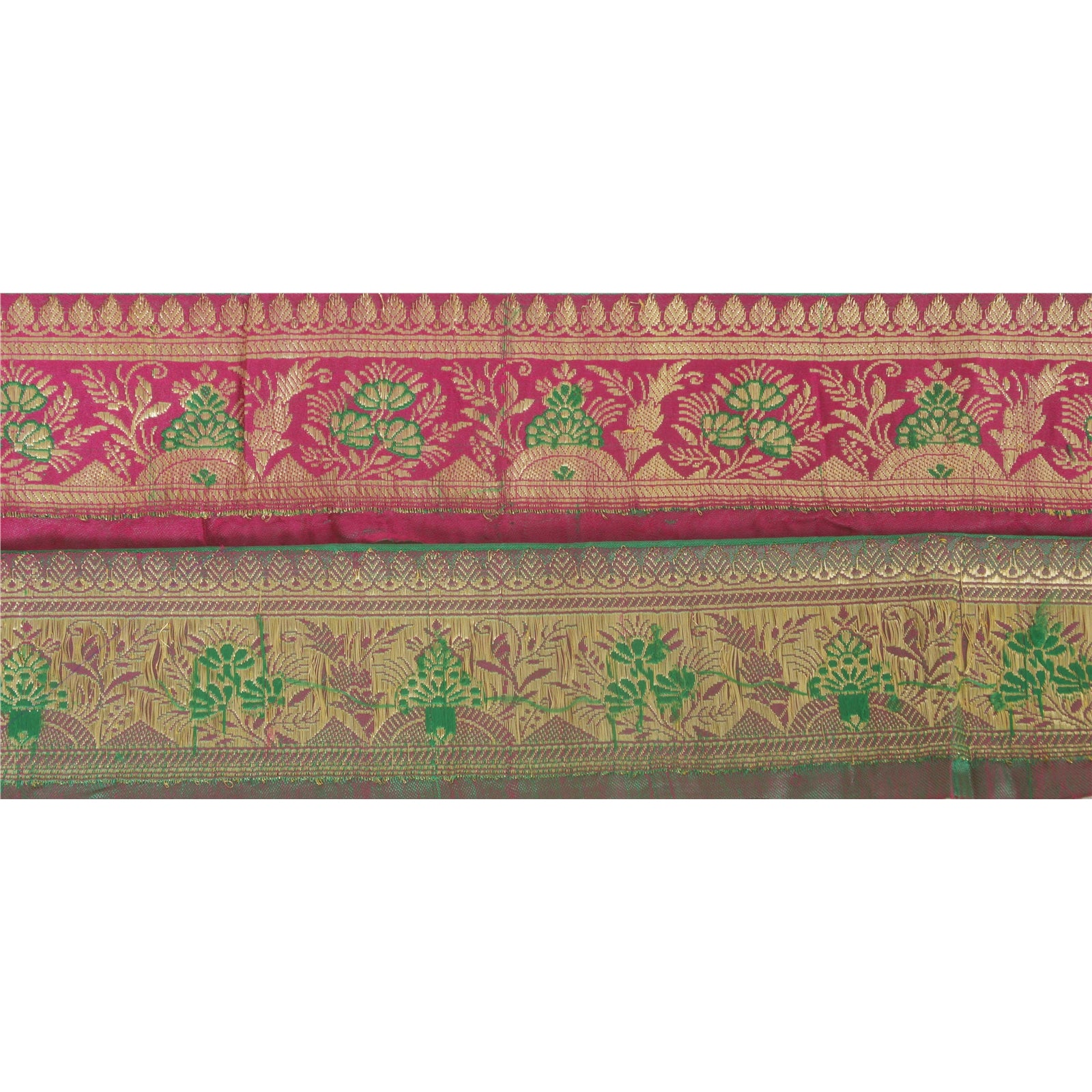 Fabulous pure silk woven brocade sari border in green & pink color . Border has beautiful patterns painstakingly golden zari weaving work, green thread work . WOW!! an awesome one of a kind versatile border. 1 Quantity = 1 Yard