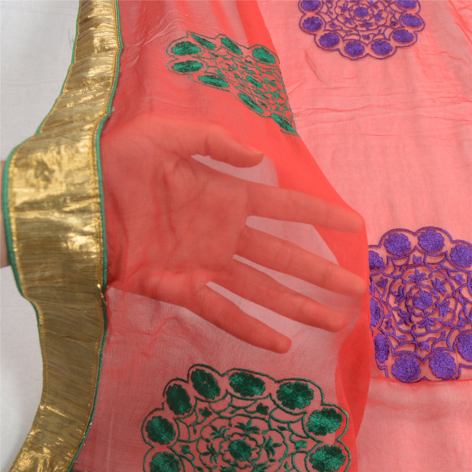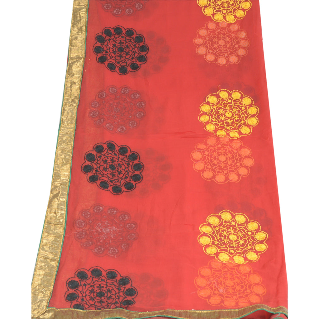 'THE ITEM COLOR OR SHADE MAY BE DARKER OR LIGHTER THAN THE PICTURE.' Attractive red colored pure chiffon silk embroidered long scarf/dupatta. Floral design all over embroidered with purple/yellow/black/green thread work . Dupatta has golden lace work on 4 sides of border . This item can be used for various crafting ideas too. Use it for dress designing, as a throw, as window dressing, upholstery, table linen and much more. Let your creative juices flow! Shipping note: International buyers please note: Import duties, taxes, and charges are not included in the item price or postage cost. These charges are the buyer's responsibility. Please check with your country's customs office to determine what these additional costs will be prior to bidding or buying. Buyer will pay custom duty/tax. It is calculated and charged differently by every country. As a seller I do not have any control over it. VAT or sales tax is calculated by the platform at the time of checkout. Customs charge is payable at the time of delivery. SKU: DC-23233