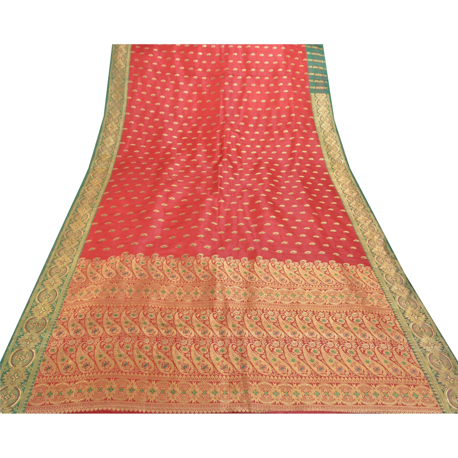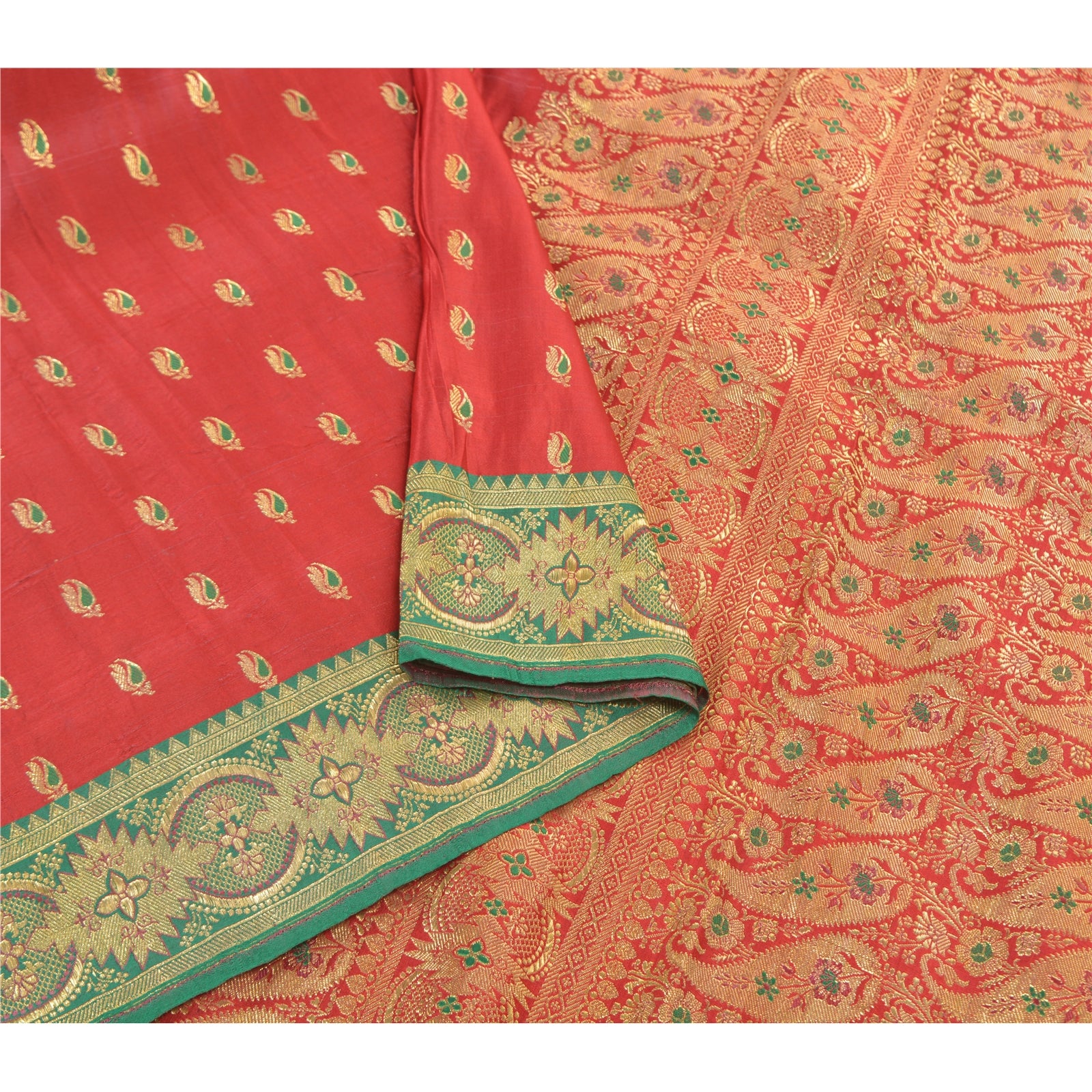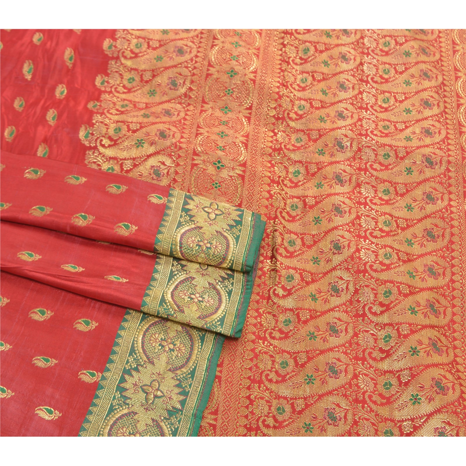 Sanskriti Vintage Red Heavy Sarees Pure Satin Silk Woven Brocade Sari Sustainable Fabric