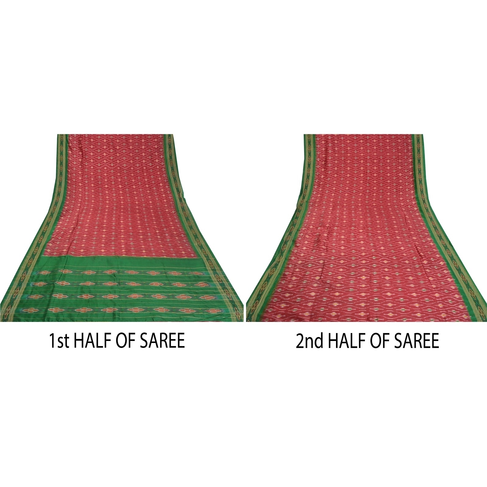• Traditional dark red & green colored 100% pure silk woven ikat sambhalpuri sari. • Pallu & border features floral design with ikat woven work. Sari has floral design with golden zari woven work on both sides. • Similar work in center part of saree. Saree has mild stain on it. Versatile Uses-Crafting, Repurpose, Creative Sewing Project, Dressmaking, Kaftans, Use It As A Sari, Window Dressing, Upcycling, Sarongs, Throw,Table Linen,Decorative Fabric, Sustainable Indian Fabric. THE ITEM COLOR OR SHADE MAY BE DARKER OR LIGHTER THAN THE PICTURE.' International buyers please note: Import duties, taxes, and charges are not included in the item price or postage cost. Buyer will pay custom duty/tax,VAT, and any applicable charges at the time of delivery. PT-5149