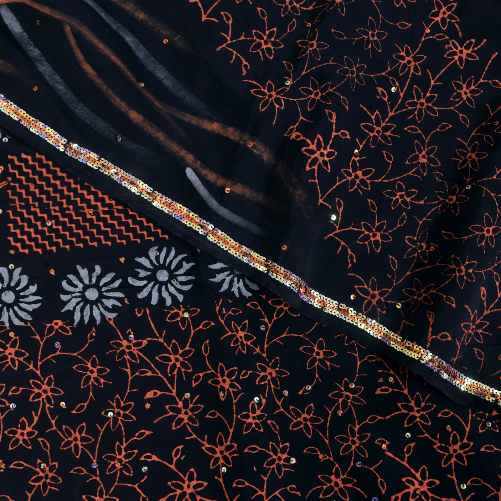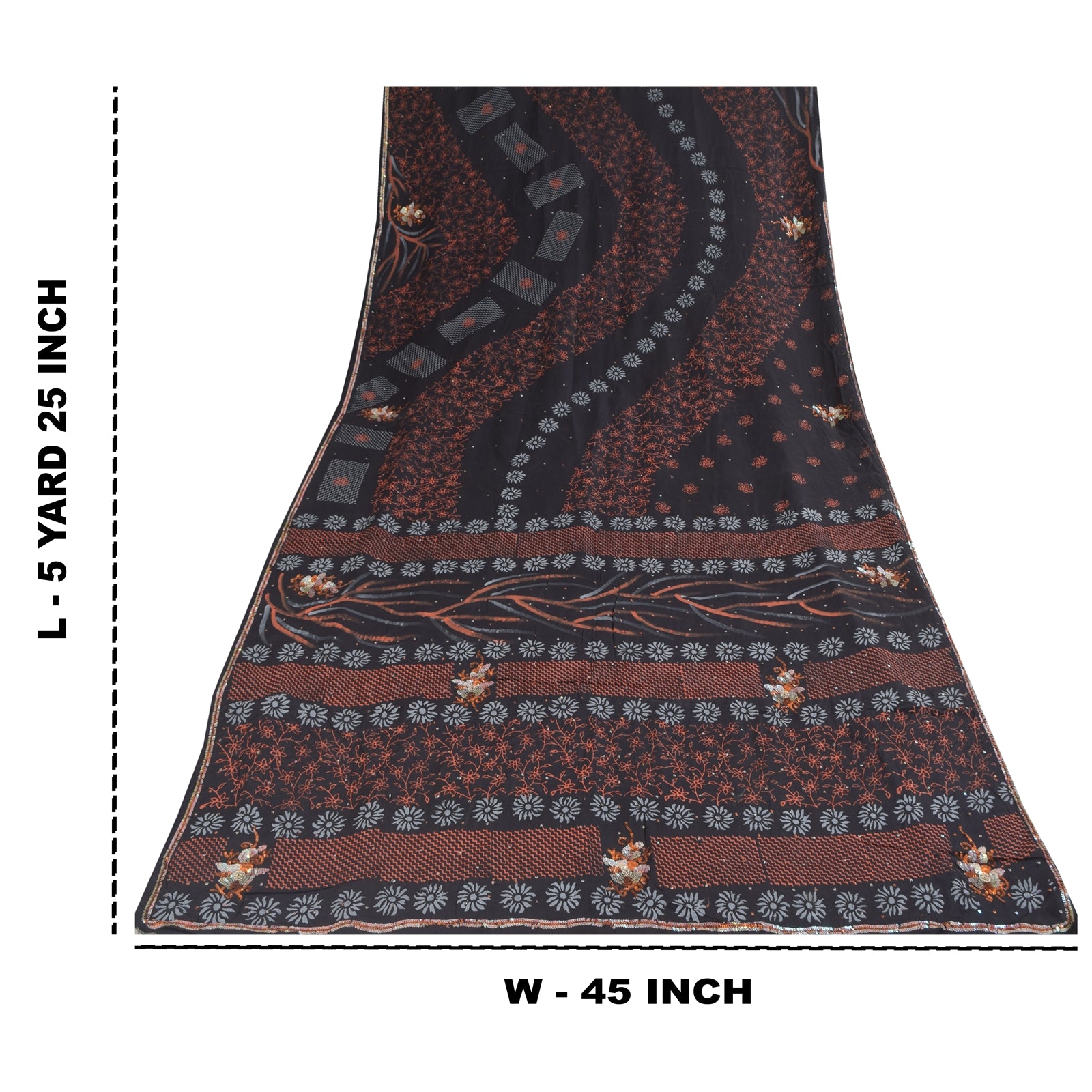 Sanskriti Vintage Sarees Black Hand Beaded Pure Crepe Printed Sari 5+yd Sustainable Fabric