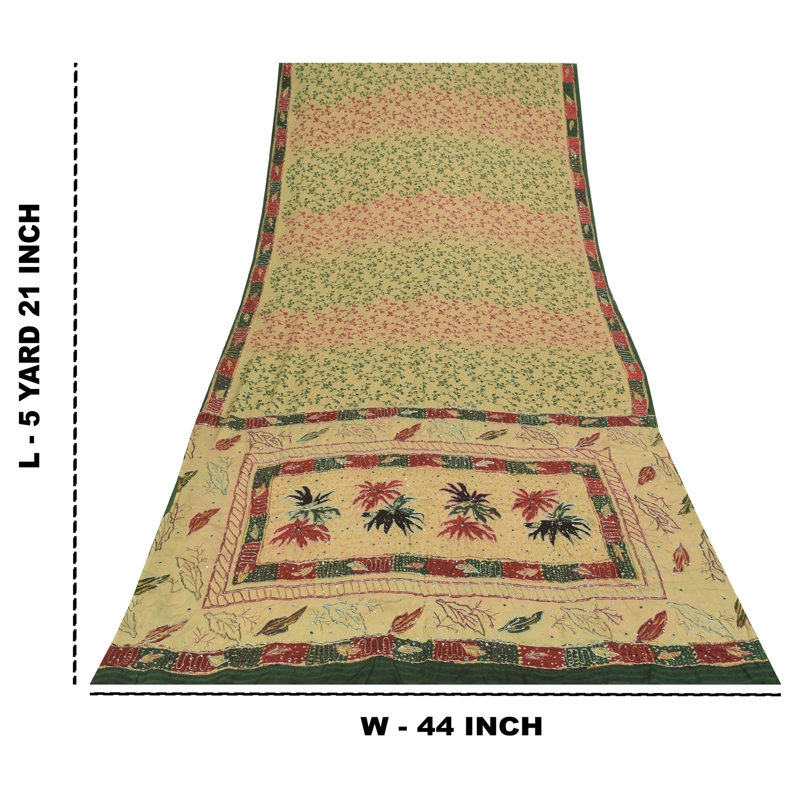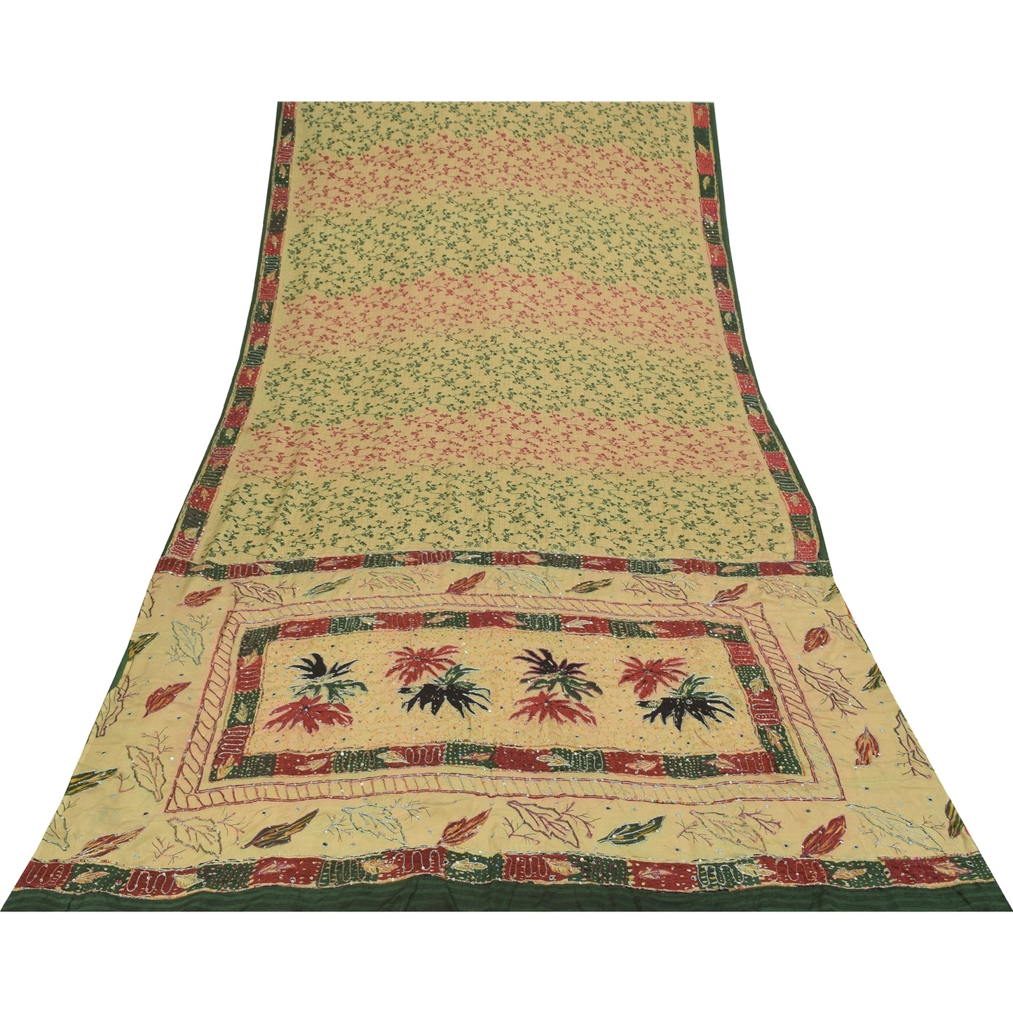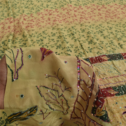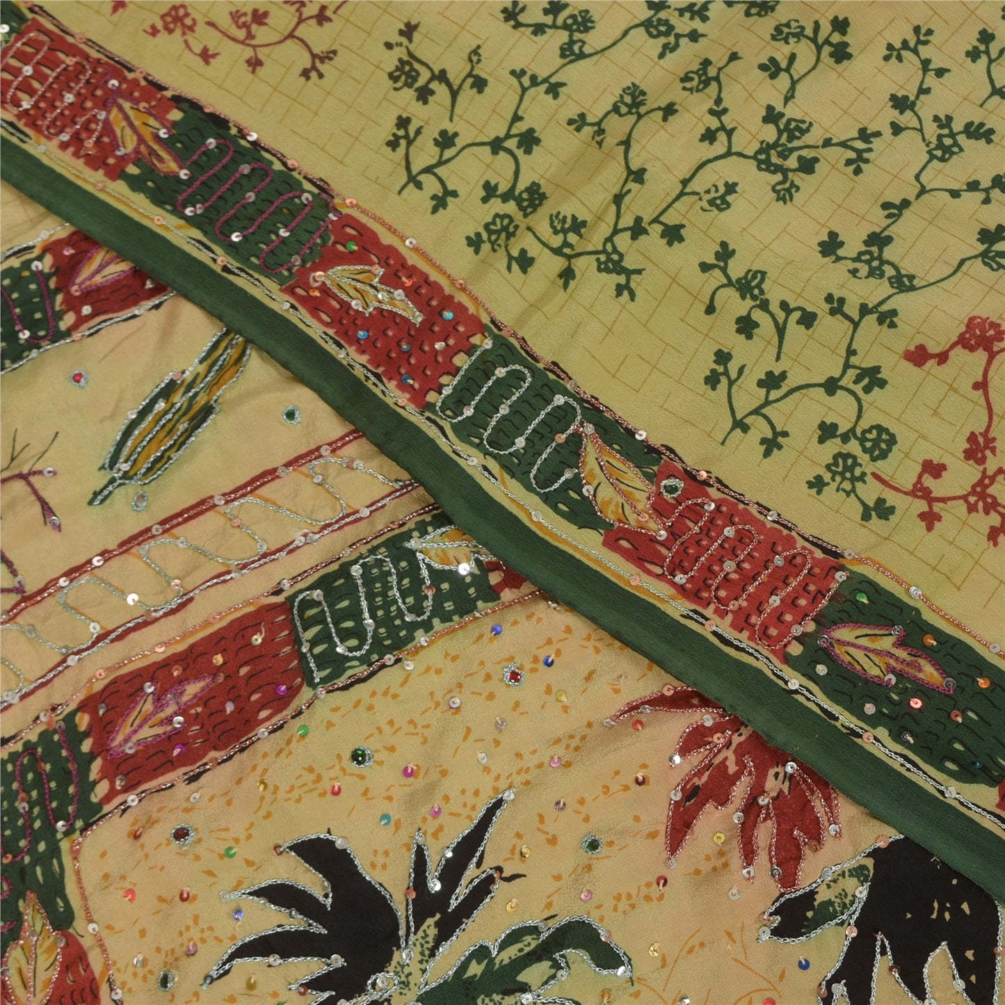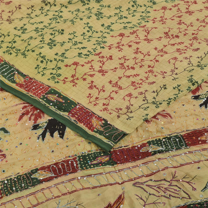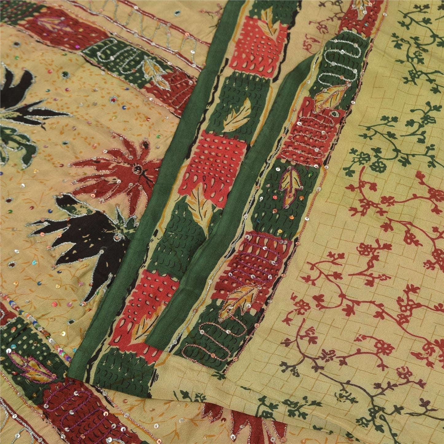 Sanskriti Vintage Sarees Cream Hand Beaded Pure Crepe Printed Sari 5+yd Sustainable Fabric