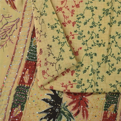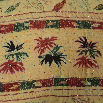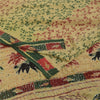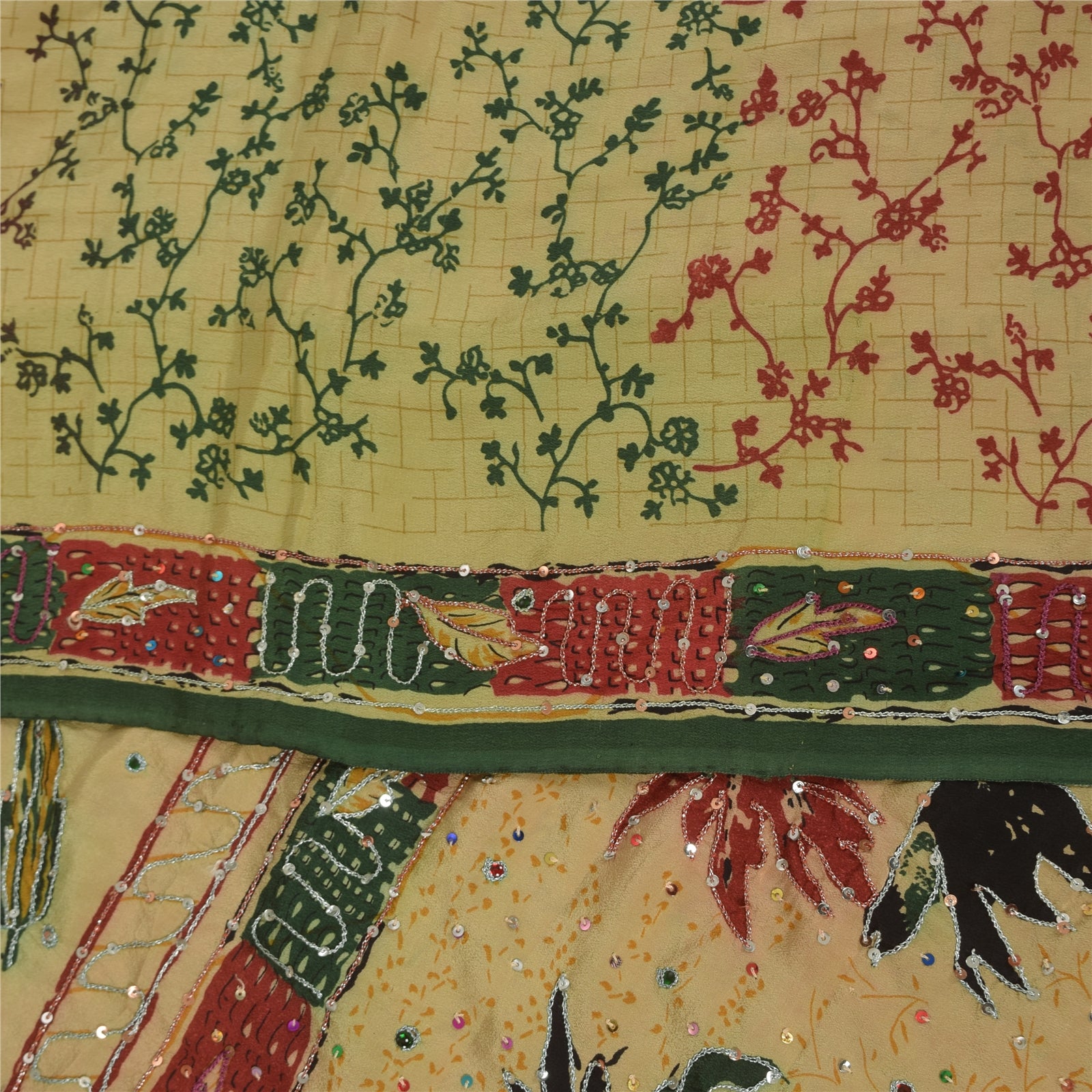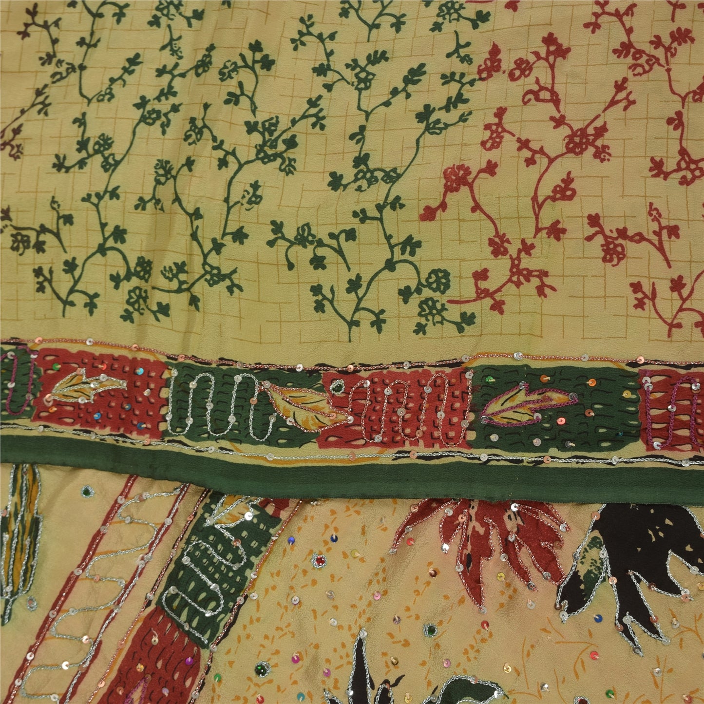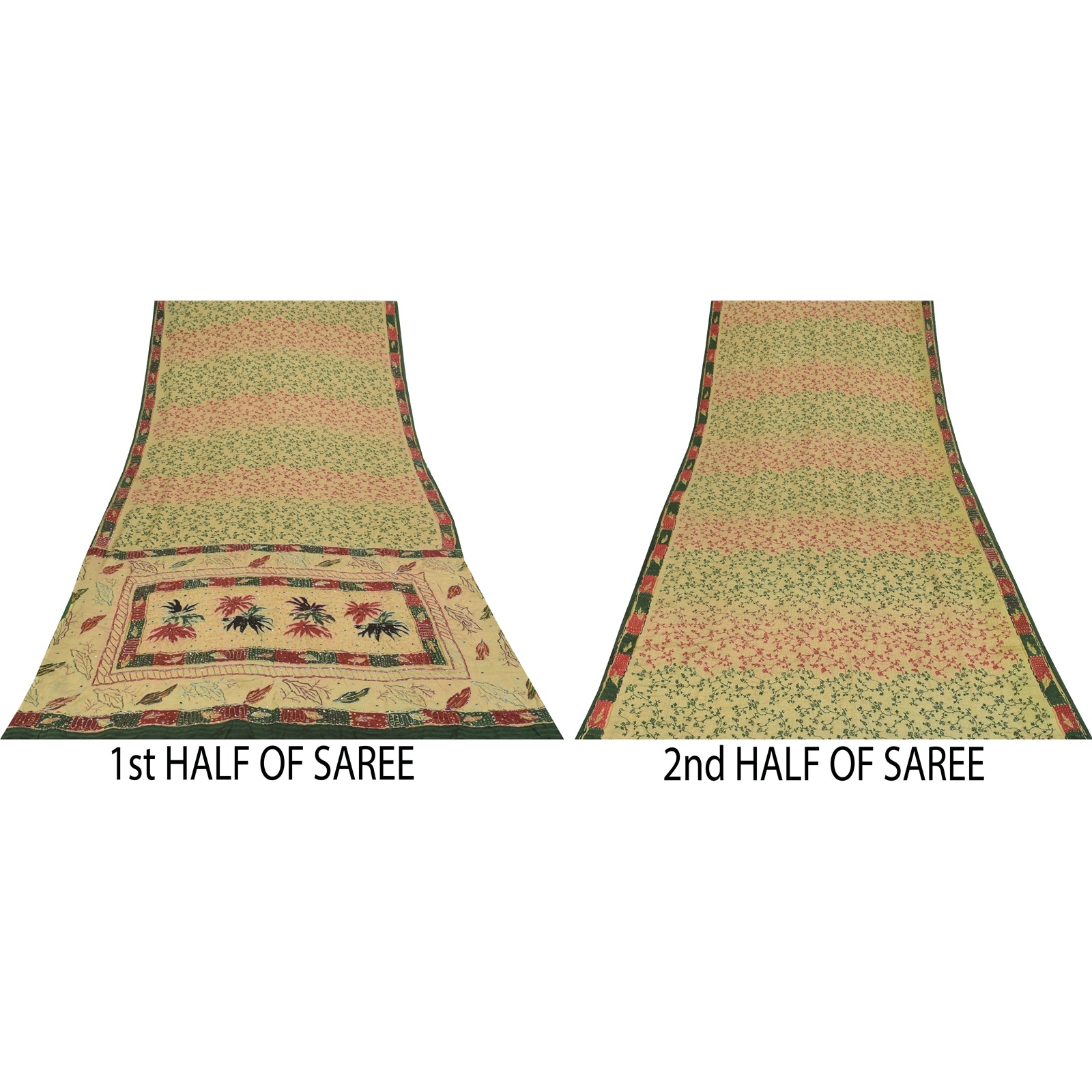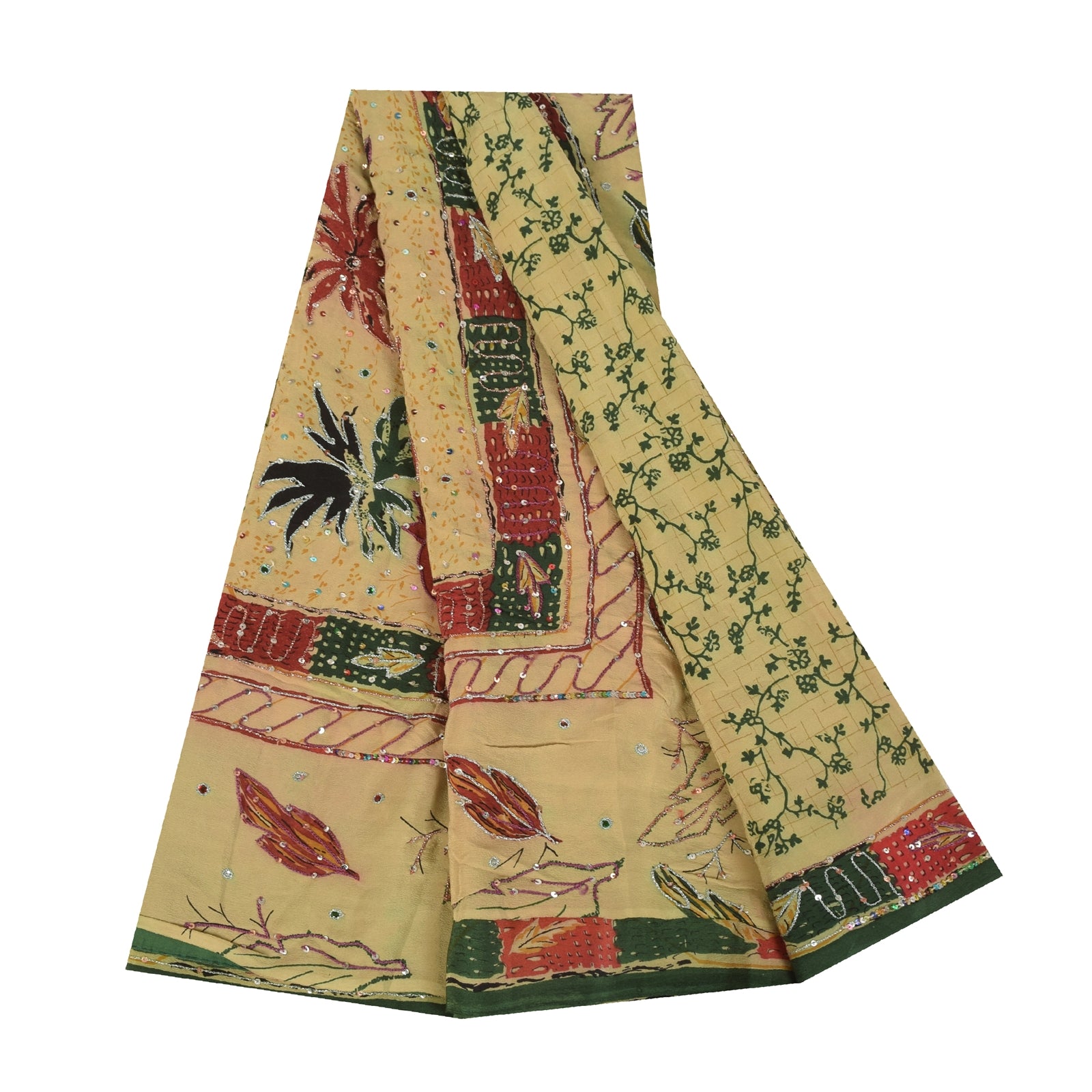 Sanskriti Vintage Sarees Cream Hand Beaded Pure Crepe Printed Sari 5+yd Sustainable Fabric