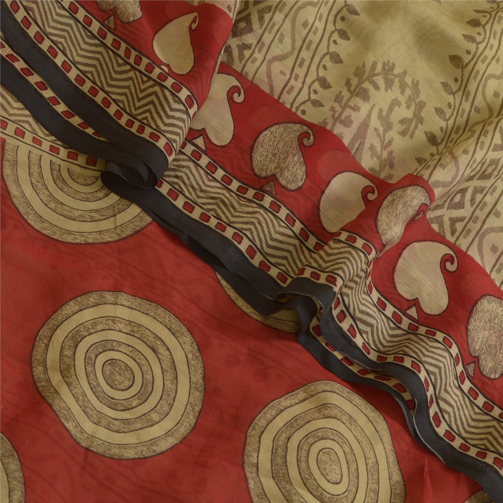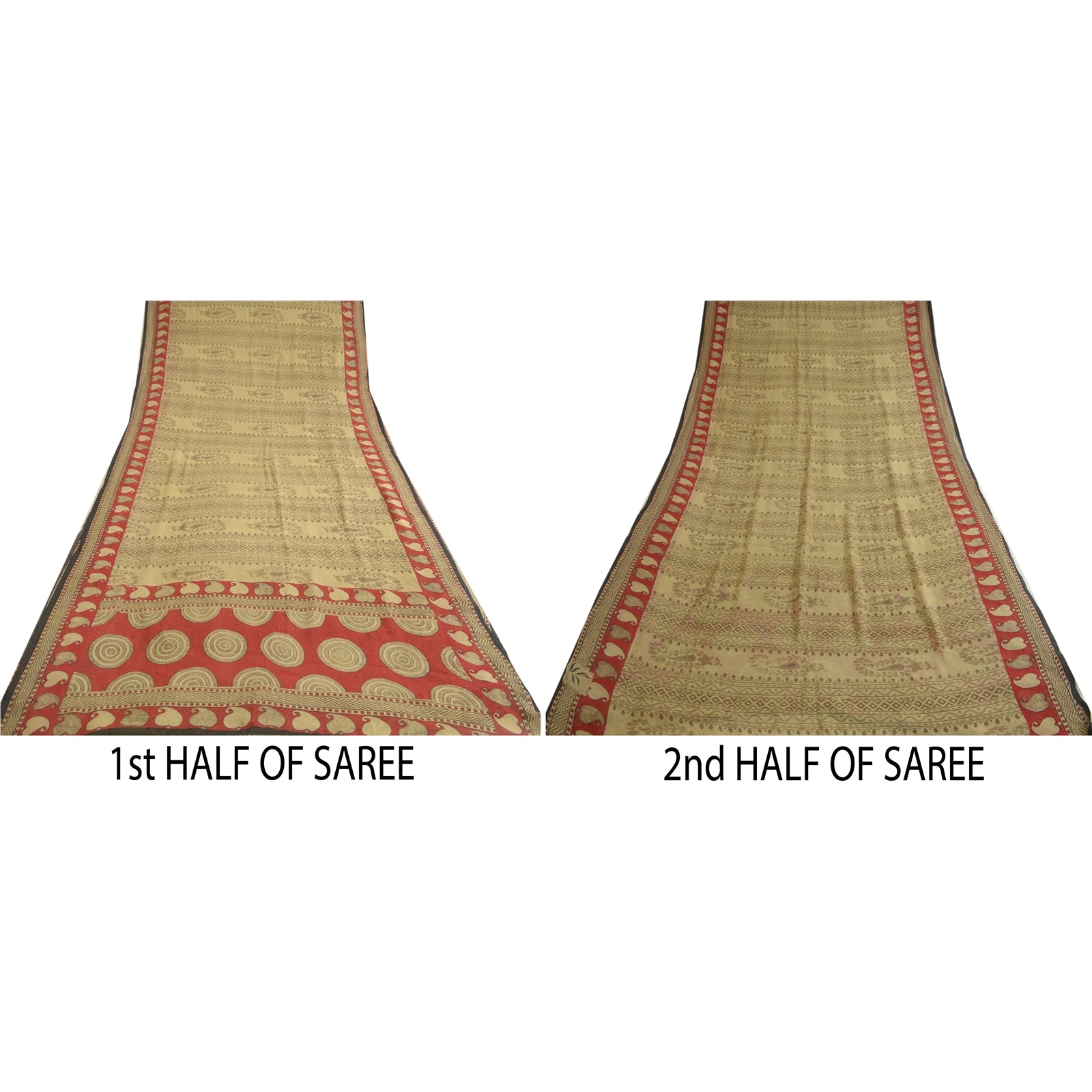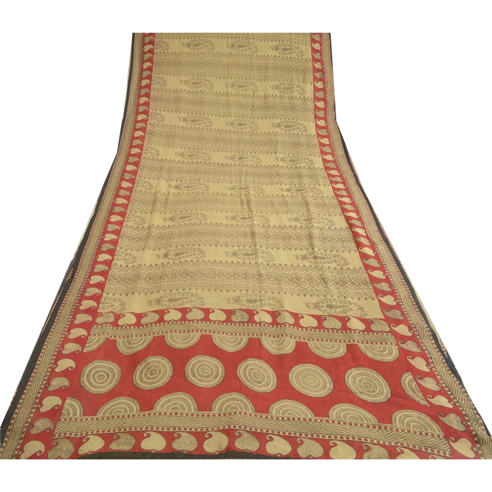 THE ITEM COLOR OR SHADE MAY BE DARKER OR LIGHTER THAN THE PICTURE.' Beautiful cream & red colored pure chiffon silk printed saree. Pallu & Border has printed floral & circle design. Floral & geometric design in center part of saree. Saree has mild stain on it. What is special about this saree? Brilliant design on soft Sustainable Fabric is really enhancing the beauty of the saree. This unique vintage saree can be used for various crafting ideas even if you don't want to use it as a sari. Design a dress, use it as a as window dressing, upholstery, sarongs, throw, dress making and table linen much more. Let your creative juices flow and use this decorated Sustainable Fabric in multiple fashion. International buyers please note: Import duties, taxes, and charges are not included in the item price or postage cost. These charges are the buyer's responsibility. Please check with your country's customs office to determine what these additional costs will be prior to bidding or buying.Buyer will pay custom duty/tax. It is calculated and charged differently by every country. As a seller I do not have any control over it. VAT or sales tax is calculated by the platform at the time of checkout. Customs charge is payable at the time of delivery.