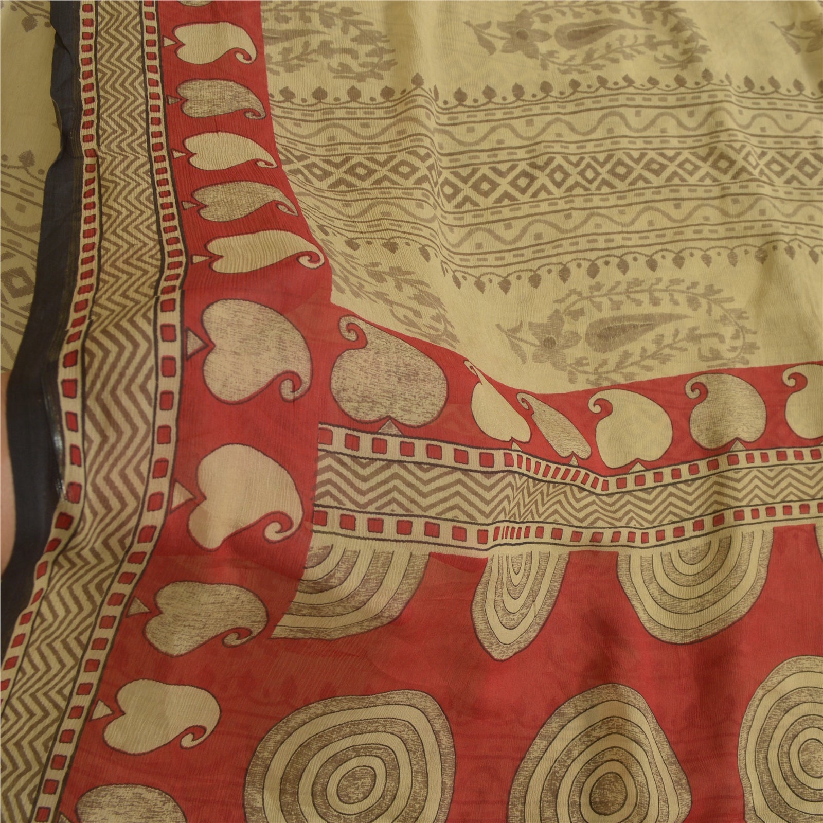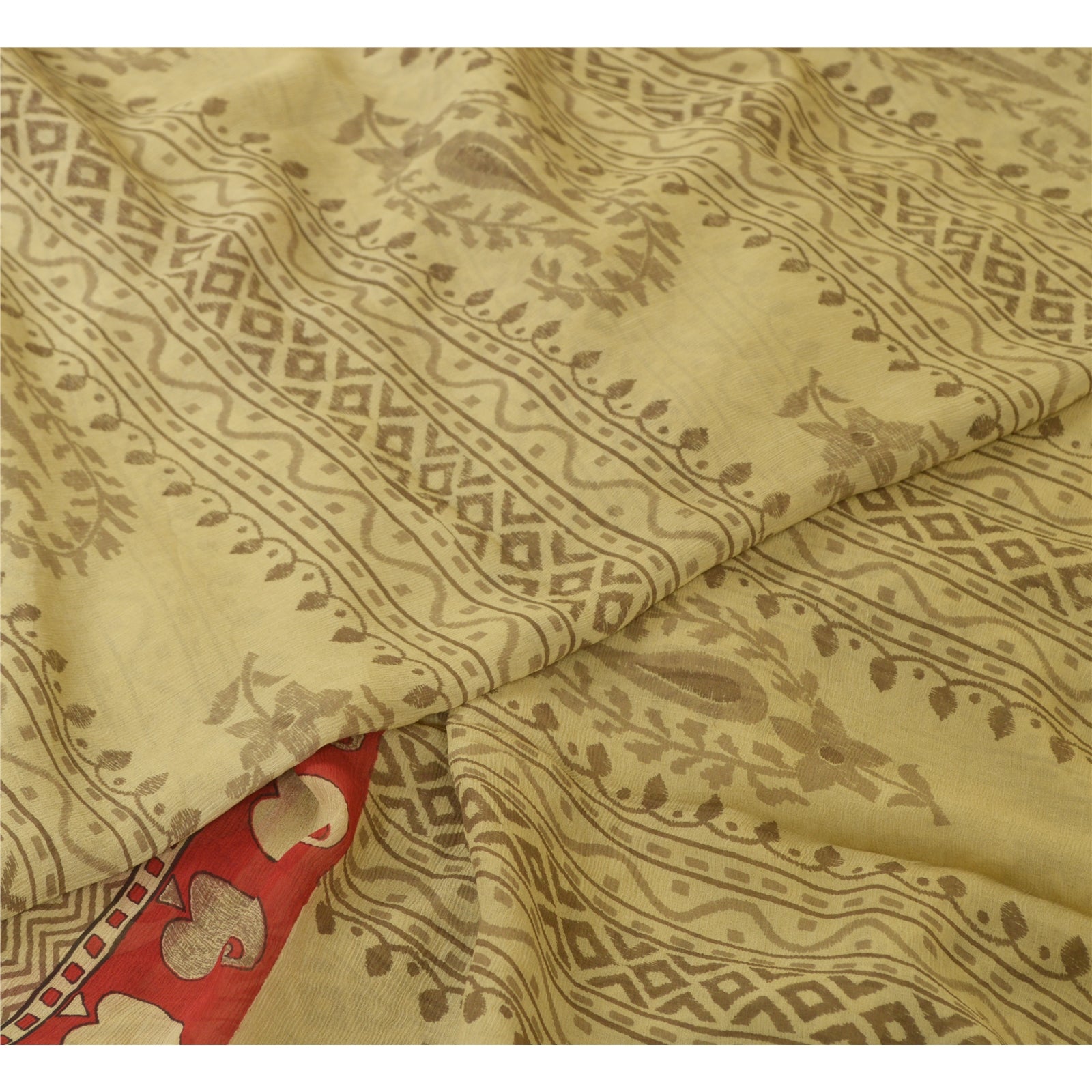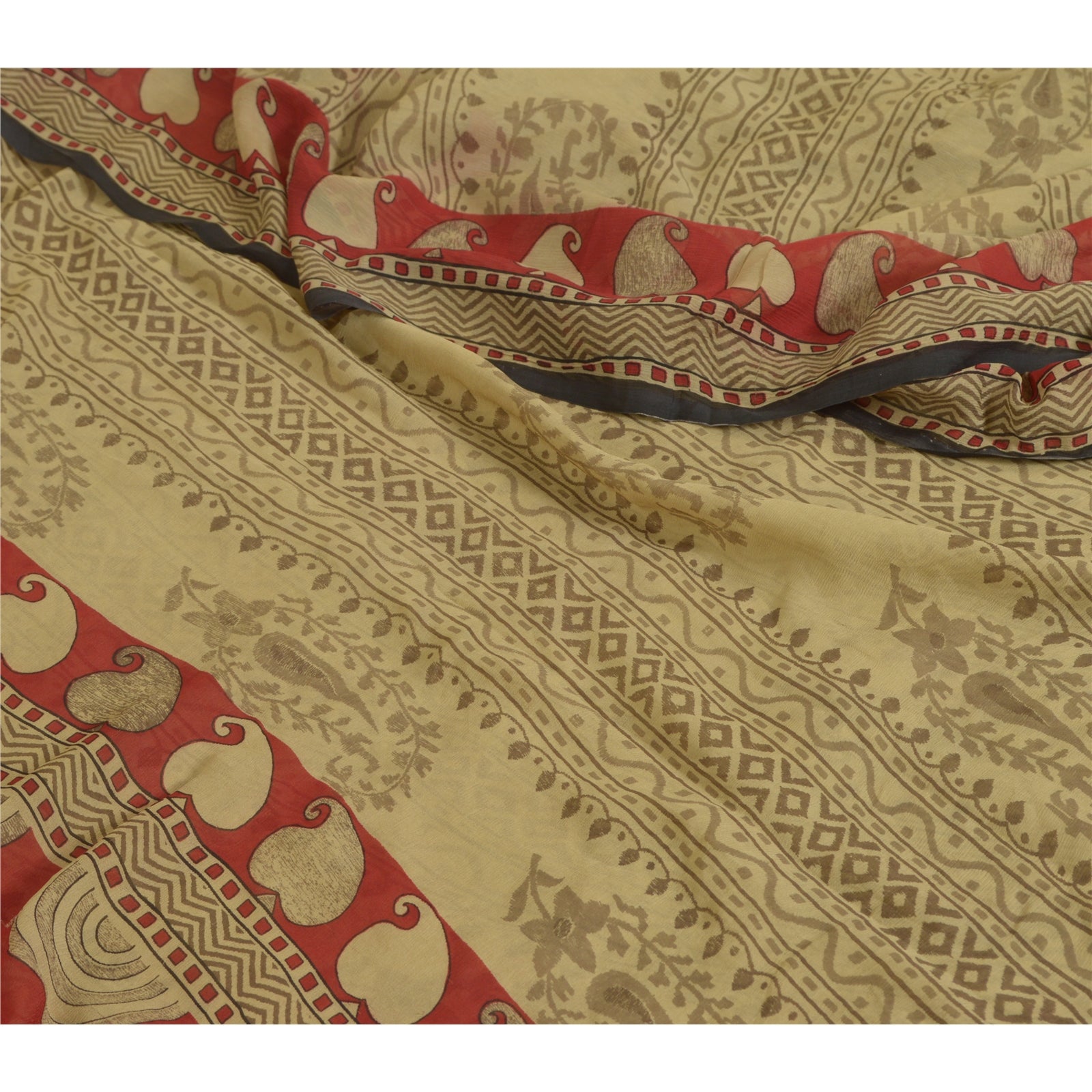 Sanskriti Vintage Sarees Cream/Red Pure Chiffon Silk Printed Sari Craft Sustainable Fabric