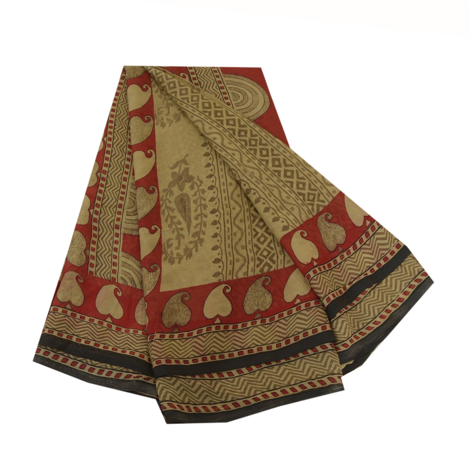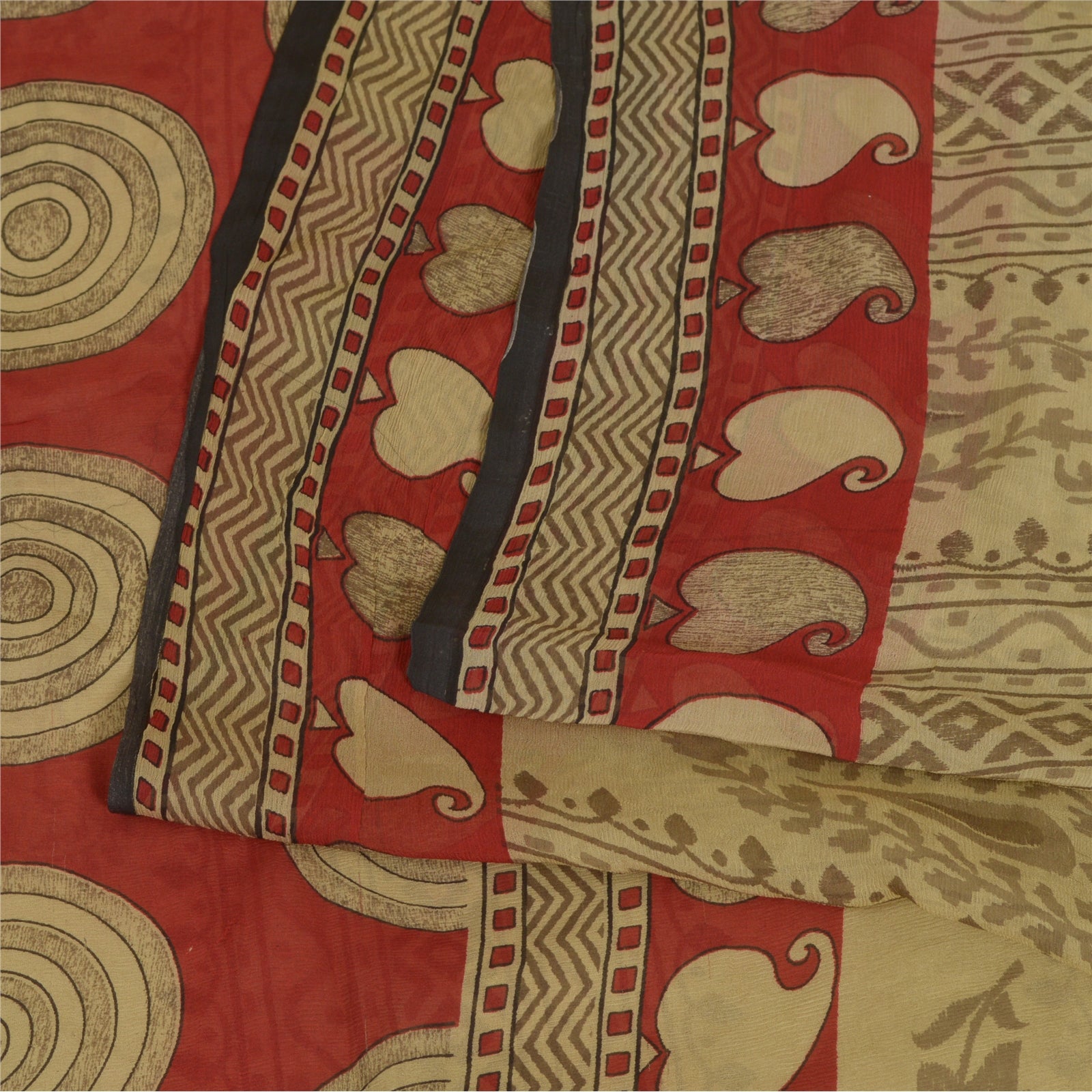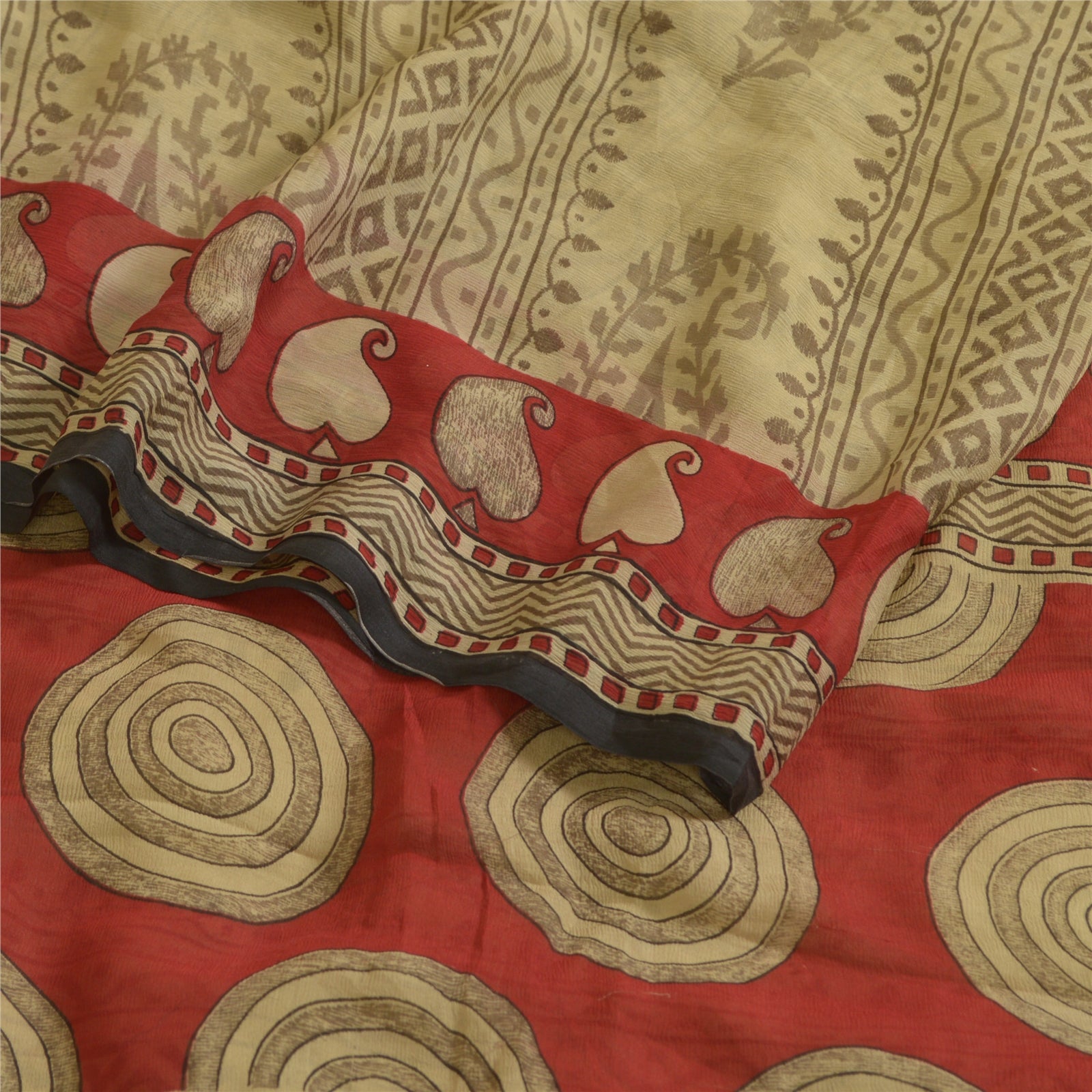 Sanskriti Vintage Sarees Cream/Red Pure Chiffon Silk Printed Sari Craft Sustainable Fabric
