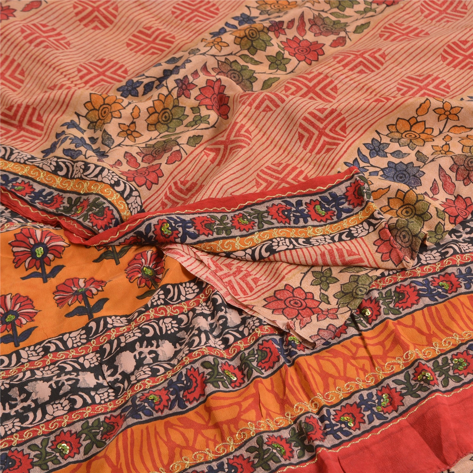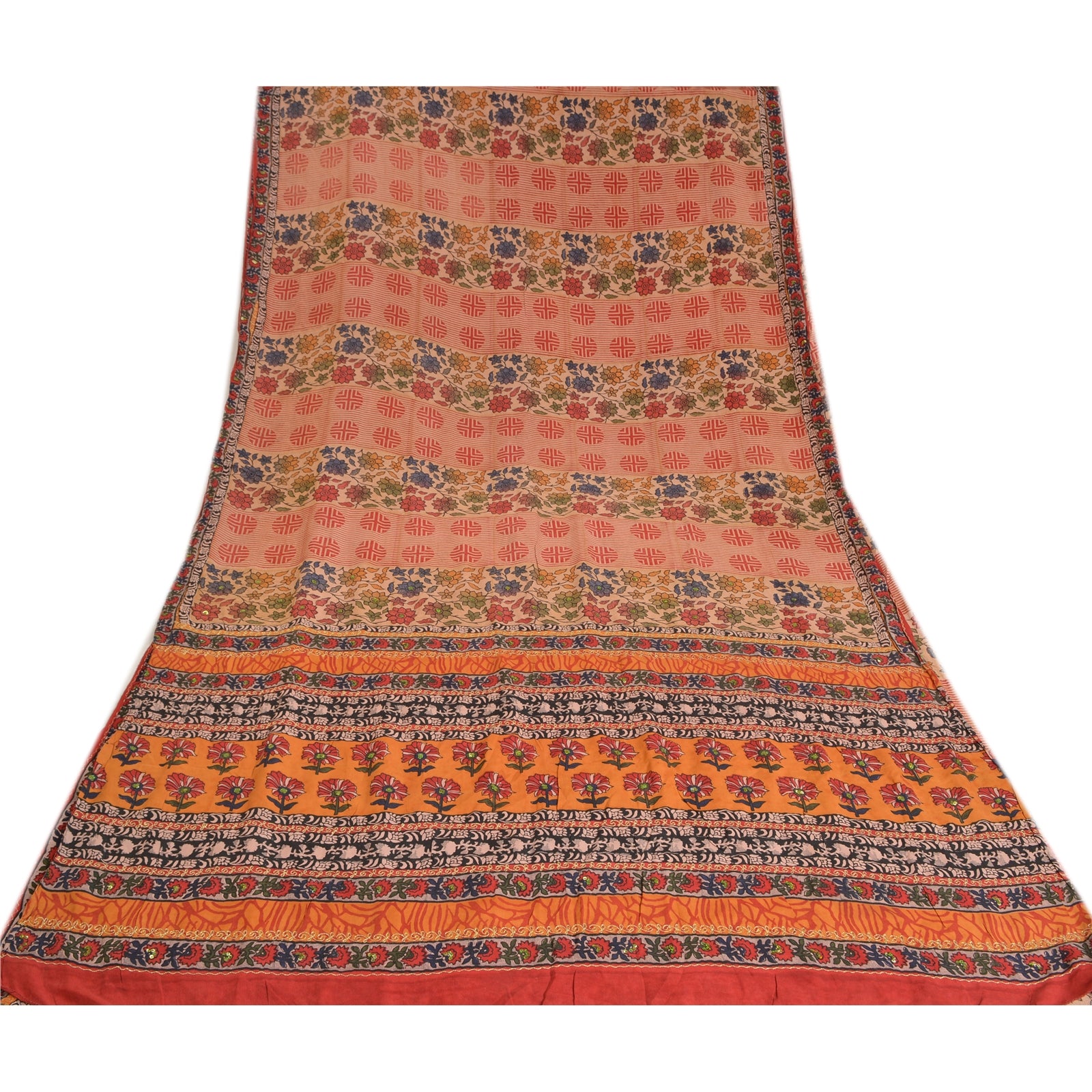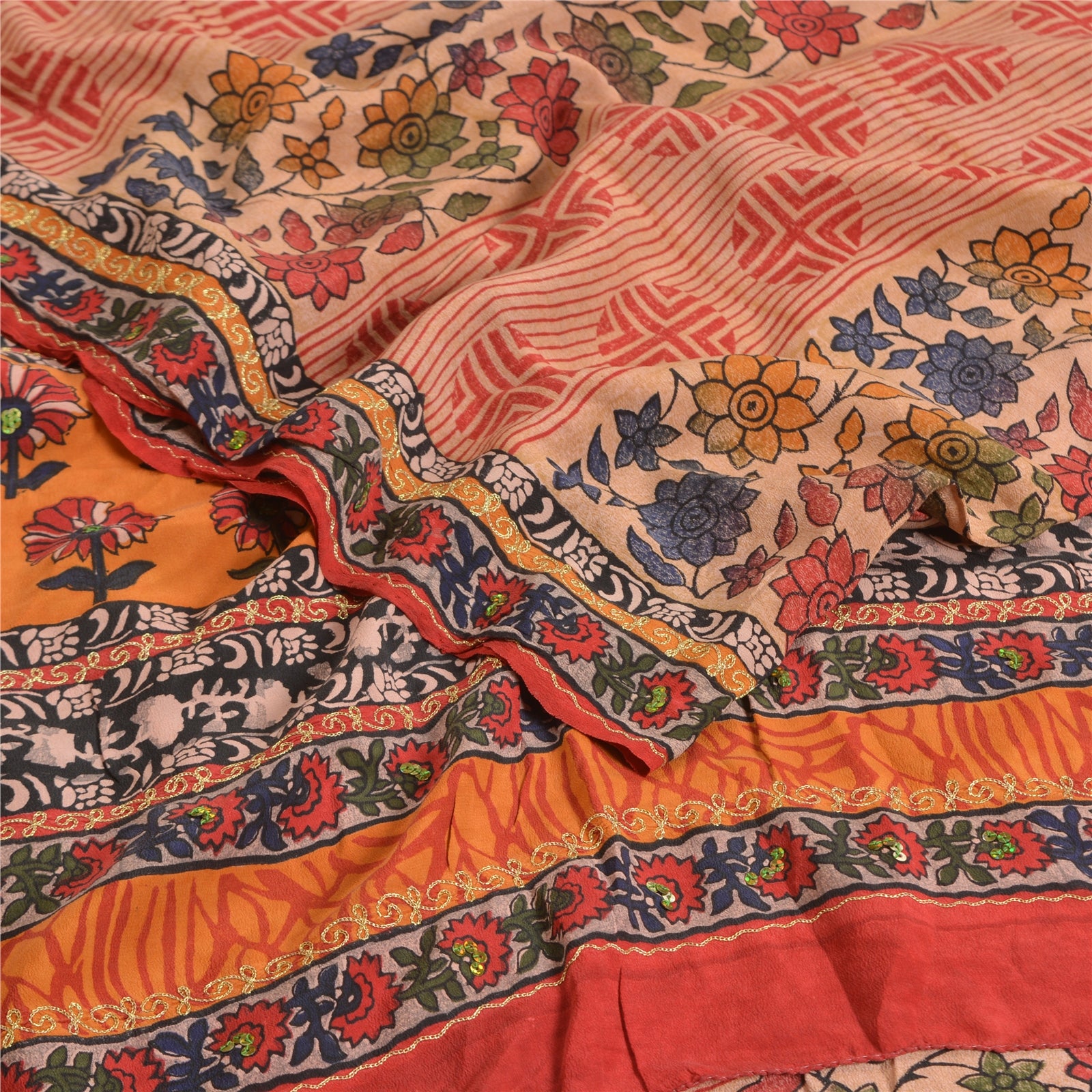 THE ITEM COLOR OR SHADE MAY BE DARKER OR LIGHTER THAN THE PICTURE.' Beautiful multi colored pure crepe silk printed & hand embroidered saree. Pallu & border has printed floral design with golden thread & sequins work. Similar work in center part of saree. What is special about this saree? Fabulous design is really enhancing the beauty of the saree. This unique vintage saree can be used for various crafting ideas even if you don't want to use it as a sari. Design a dress, use it as window,dressing, upholstery, sarongs, throw, dress making and table linen much more. Let your creative juices flow and use this decorated Sustainable Fabric in multiple fashion. International buyers please note: Import duties, taxes, and charges are not included in the item price or postage cost. These charges are the buyer's responsibility. Please check with your country's customs office to determine what these additional costs will be prior to bidding or buying.Buyer will pay custom duty/tax. It is calculated and charged differently by every country. As a seller I do not have any control over it.VAT or sales tax is calculated by the platform at the time of checkout. Customs charge is payable at the time of delivery.
