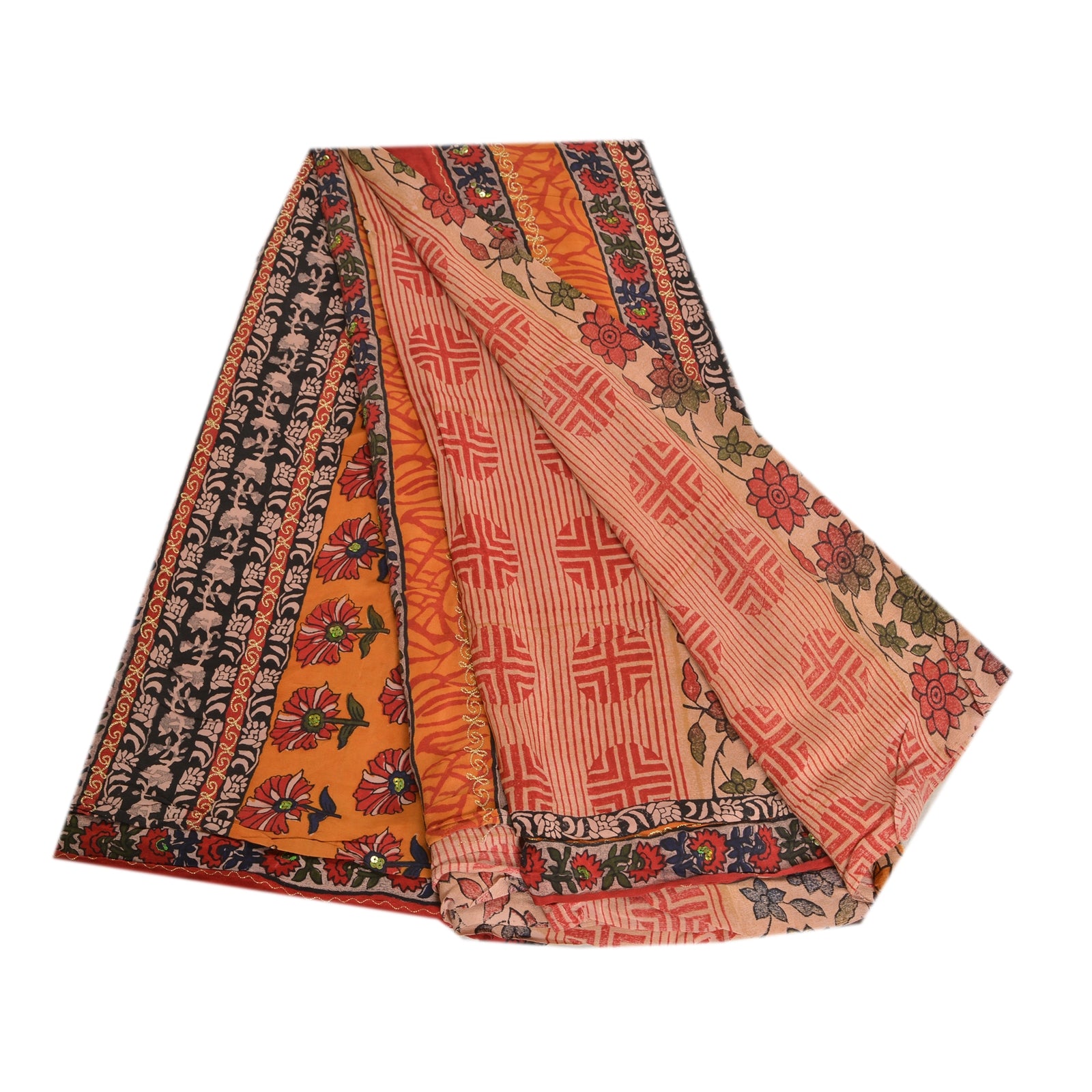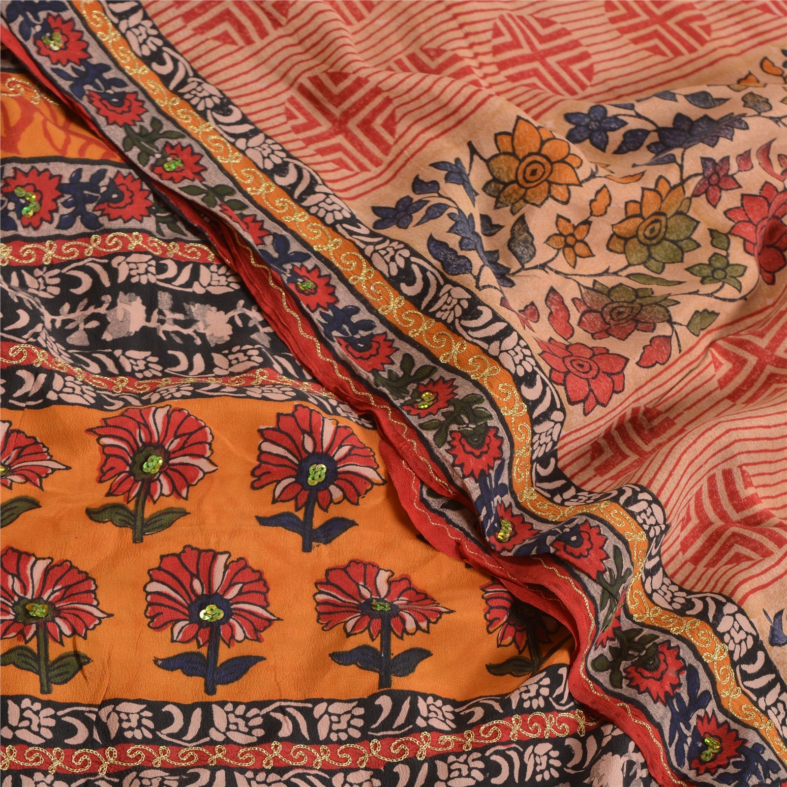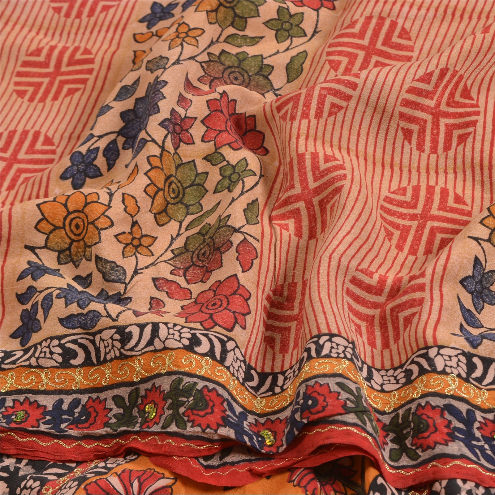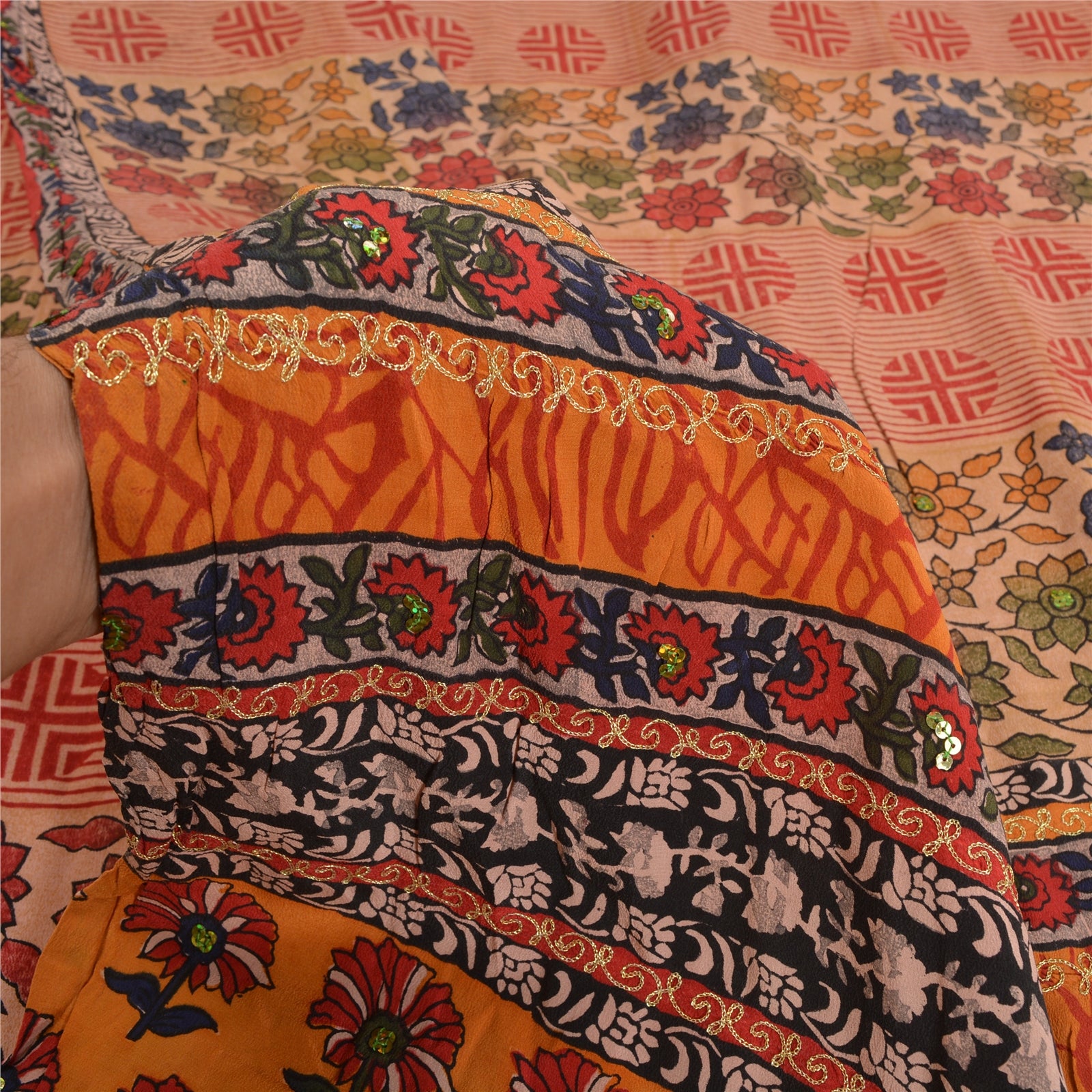 THE ITEM COLOR OR SHADE MAY BE DARKER OR LIGHTER THAN THE PICTURE.' Beautiful multi colored pure crepe silk printed & hand embroidered saree. Pallu & border has printed floral design with golden thread & sequins work. Similar work in center part of saree. What is special about this saree? Fabulous design is really enhancing the beauty of the saree. This unique vintage saree can be used for various crafting ideas even if you don't want to use it as a sari. Design a dress, use it as window,dressing, upholstery, sarongs, throw, dress making and table linen much more. Let your creative juices flow and use this decorated Sustainable Fabric in multiple fashion. International buyers please note: Import duties, taxes, and charges are not included in the item price or postage cost. These charges are the buyer's responsibility. Please check with your country's customs office to determine what these additional costs will be prior to bidding or buying.Buyer will pay custom duty/tax. It is calculated and charged differently by every country. As a seller I do not have any control over it.VAT or sales tax is calculated by the platform at the time of checkout. Customs charge is payable at the time of delivery.