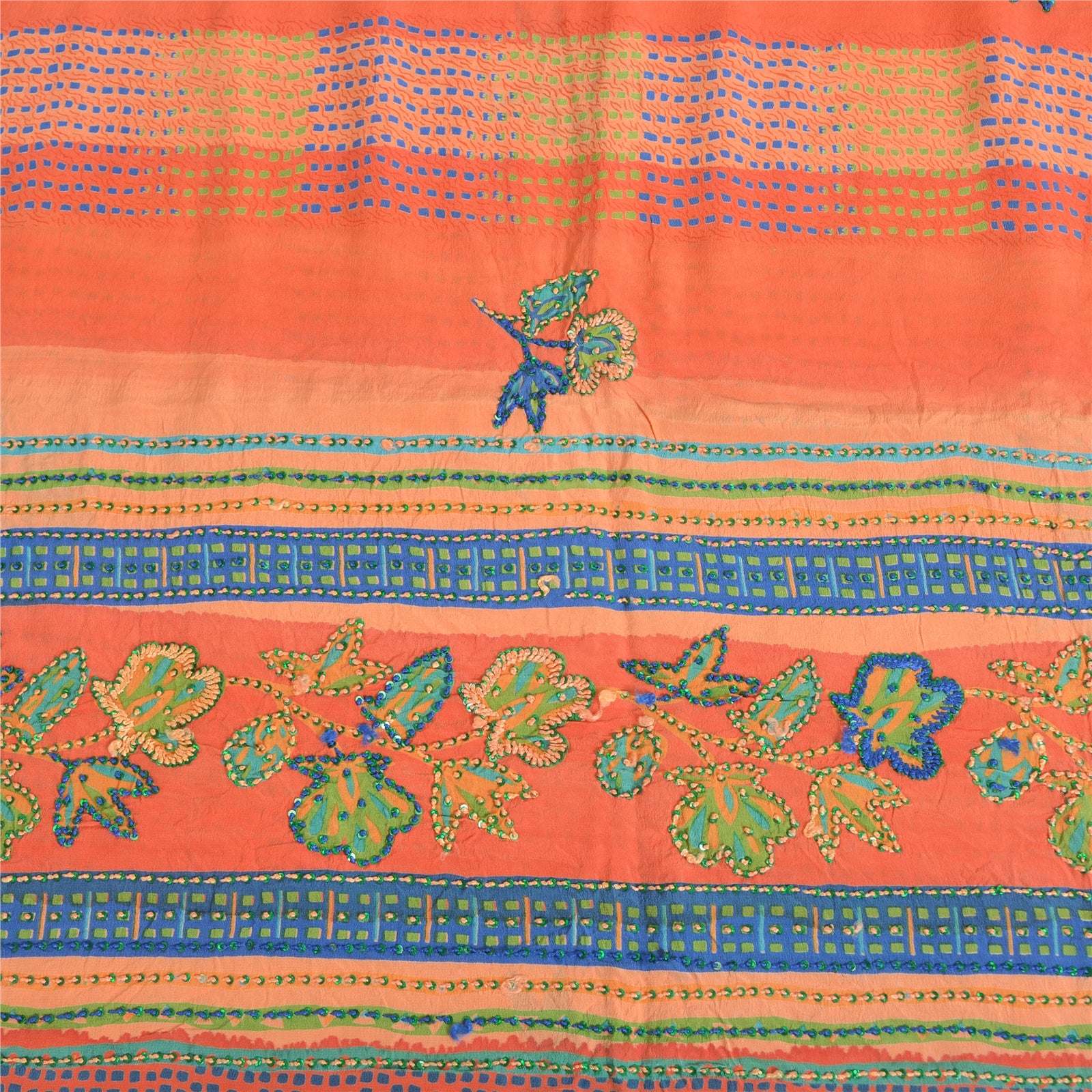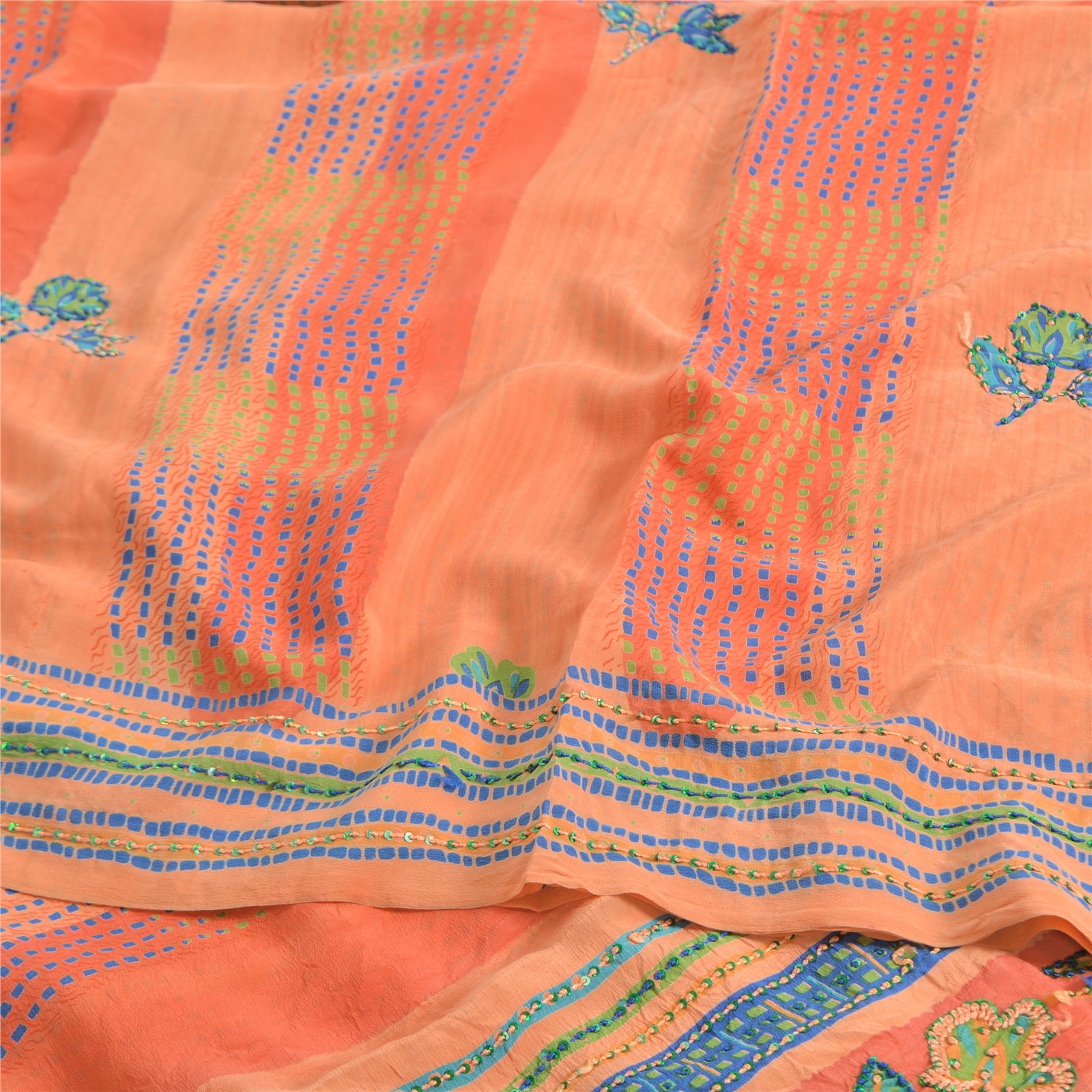 Sanskriti Vintage Sarees Orange/Peach Hand Beaded Pure Crepe Printed Sari Sustainable Fabric