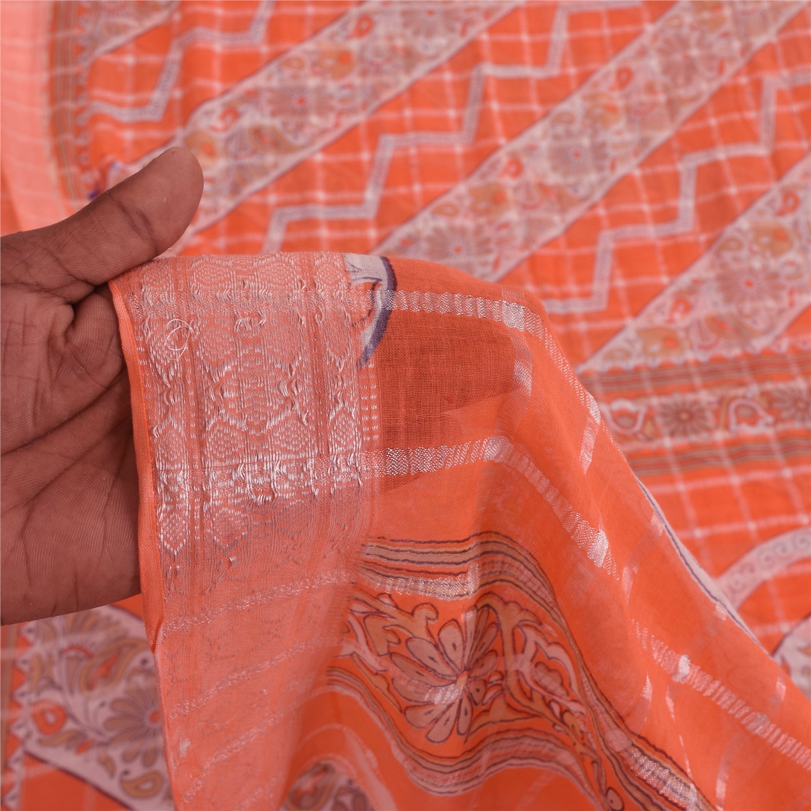 THE ITEM COLOR OR SHADE MAY BE DARKER OR LIGHTER THAN THE PICTURE. Attractive orange colored pure cotton printed & woven sari. Pallu & Border has printed floral design. Similar design in center part of saree.. Also you can see white woven work with check lines design on allover the saree. This unique vintage saree can be used for various crafting ideas even if you don't want to use it as a sari. Design a dress, use it as a as window dressing, upholstery, sarongs, throw, dress making and table linen much more. Let your creative juices flow and use this decorated Sustainable Fabric in multiple fashion. Shipping Note: 'International buyers please note: Import duties, taxes, and charges are not included in the item price or postage cost. These charges are the buyer's responsibility. Please check with your country's customs office to determine what these additional costs will be prior to bidding or buying. Buyer will pay custom duty/tax. It is calculated and charged differently by every country. As a seller I do not have any control over it. VAT or sales tax is calculated by the platform at the time of checkout. Customs charge is payable at the time of delivery.' PCS-6839