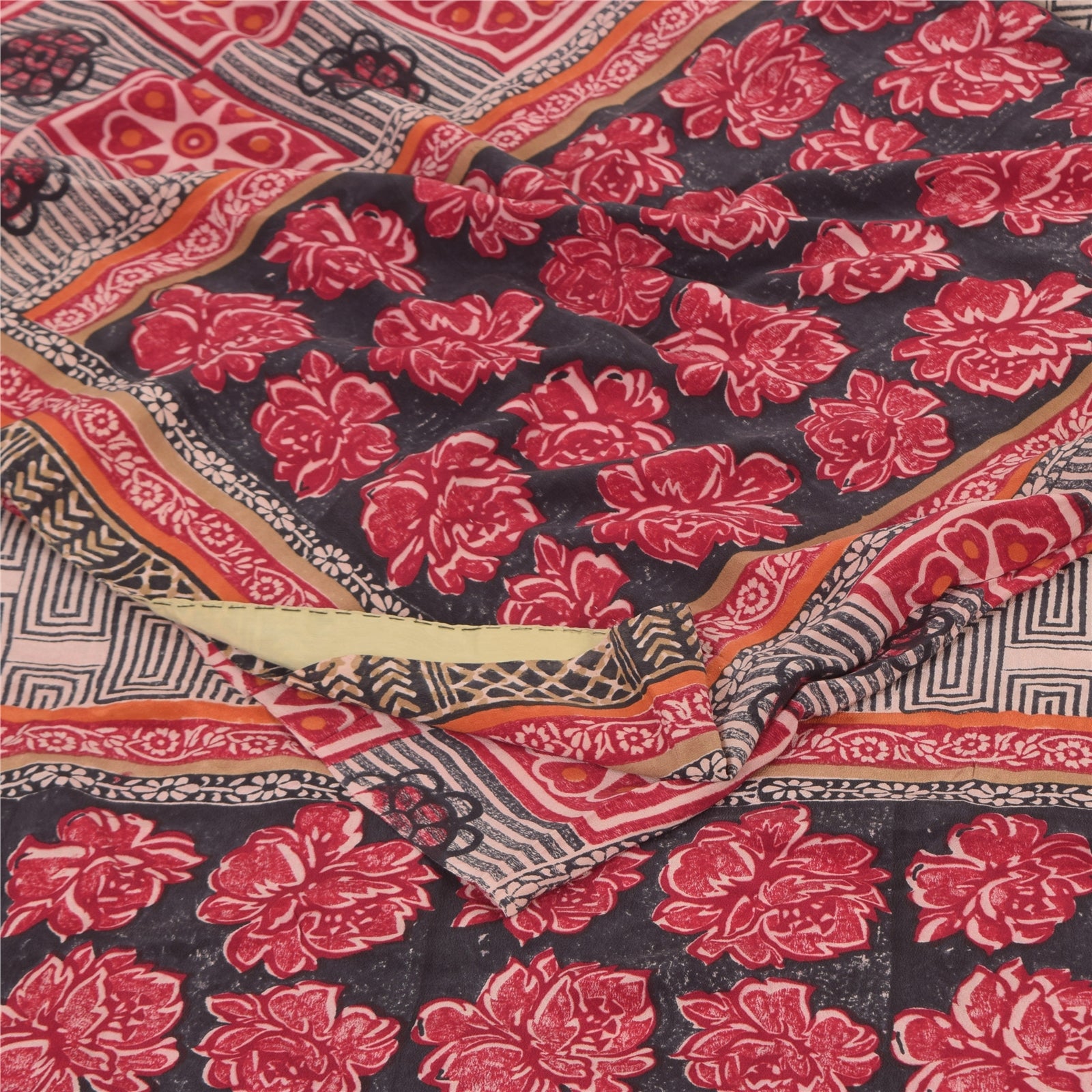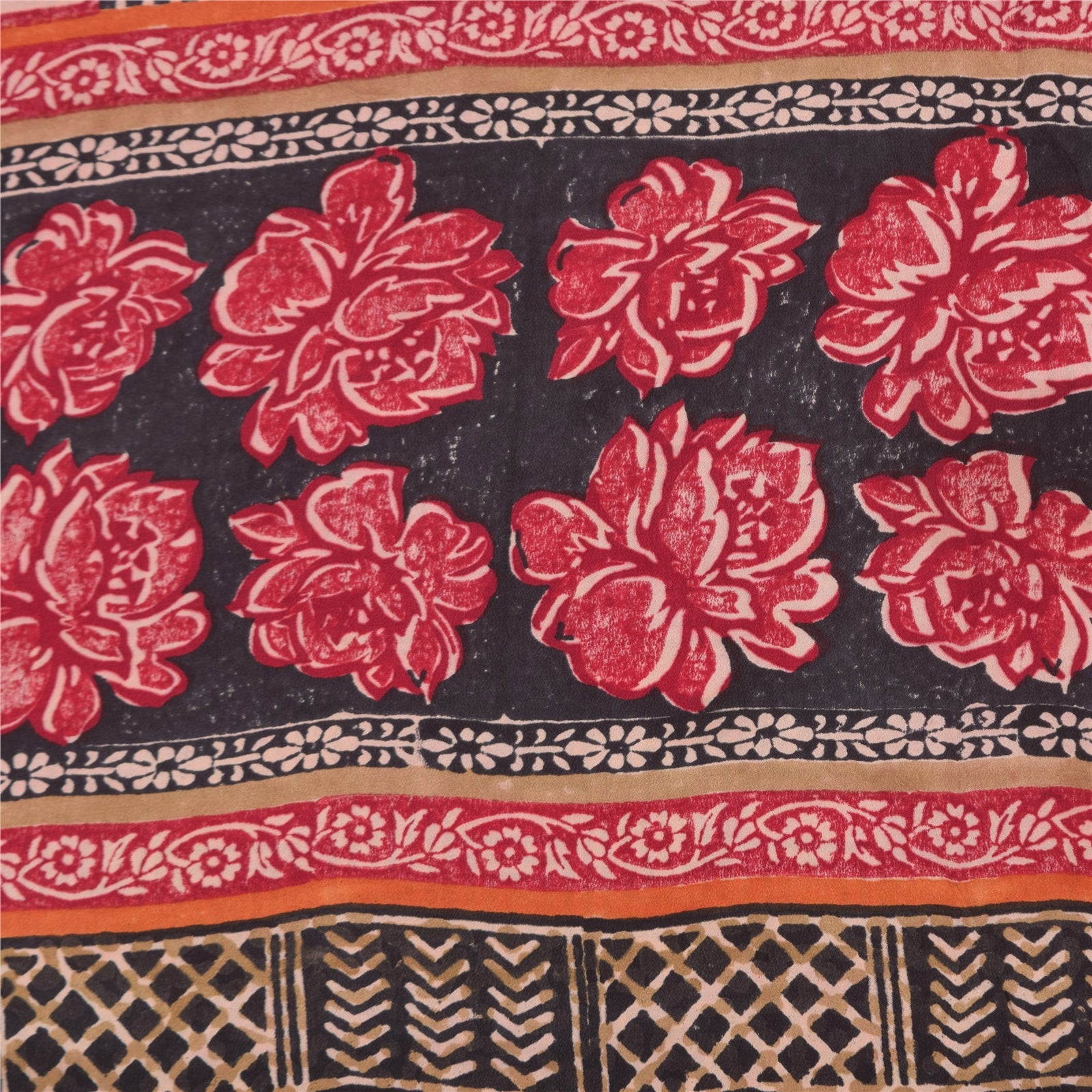 Sanskriti Vintage Sarees Red/Black Pure Crepe Silk Print Sari 6+yd Craft Sustainable Fabric