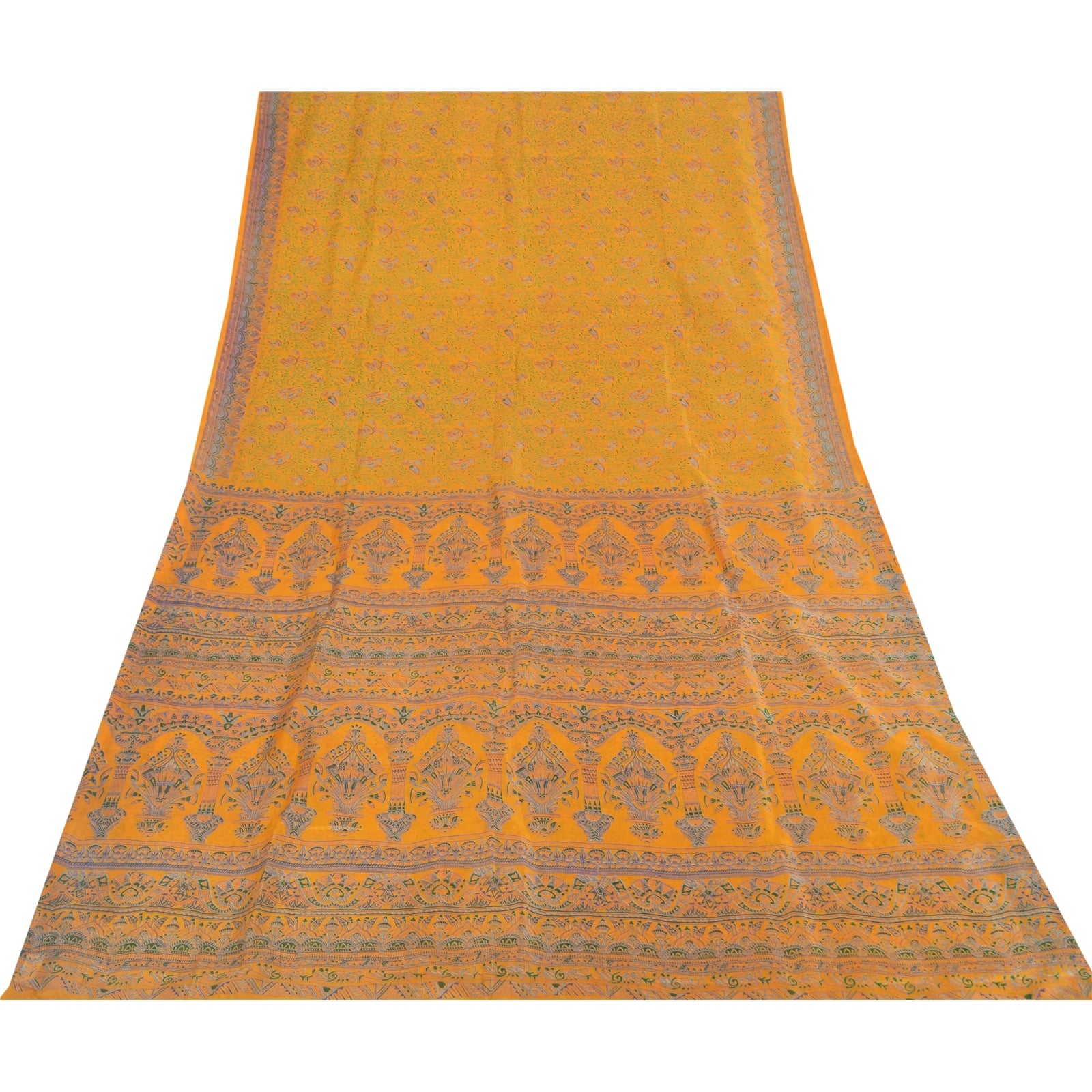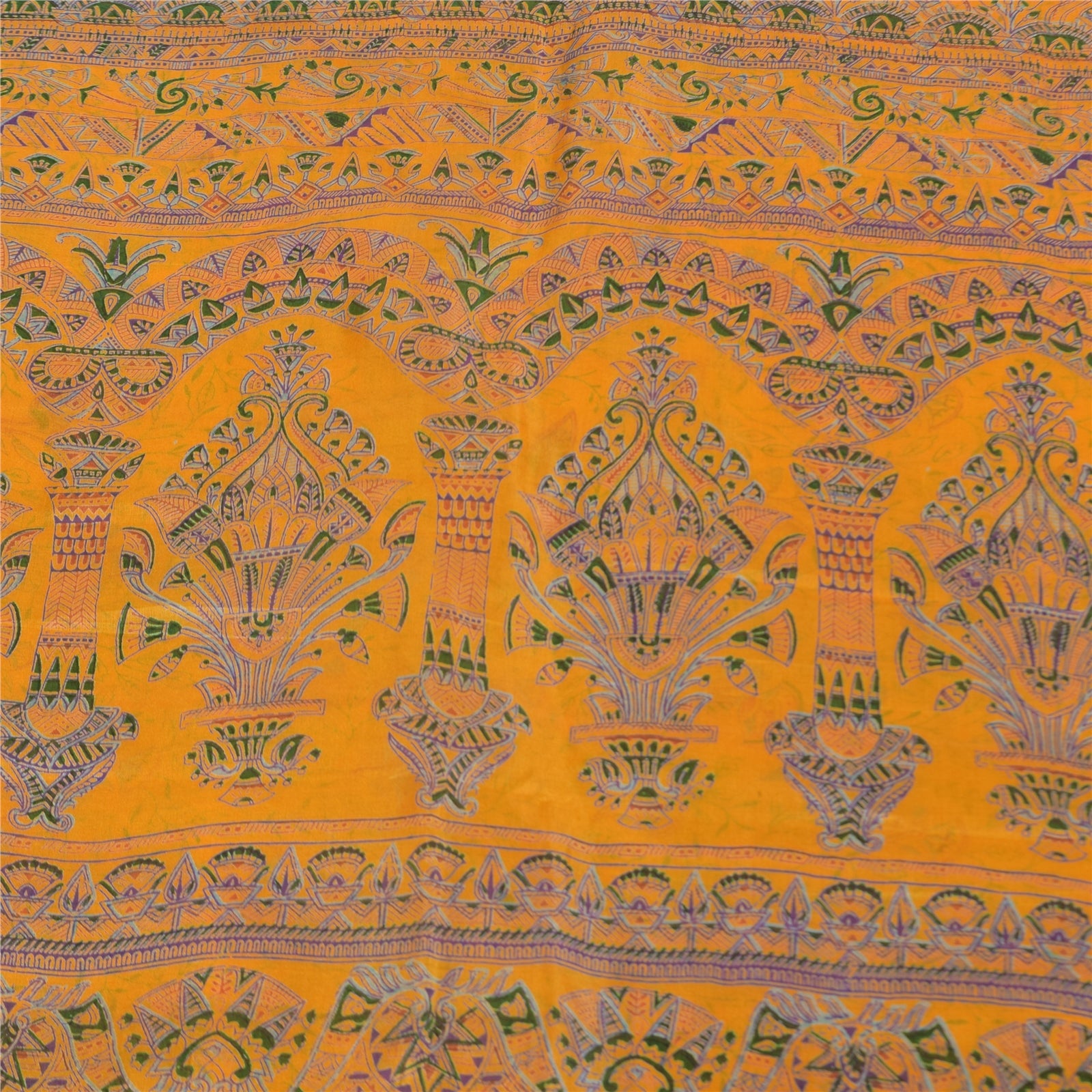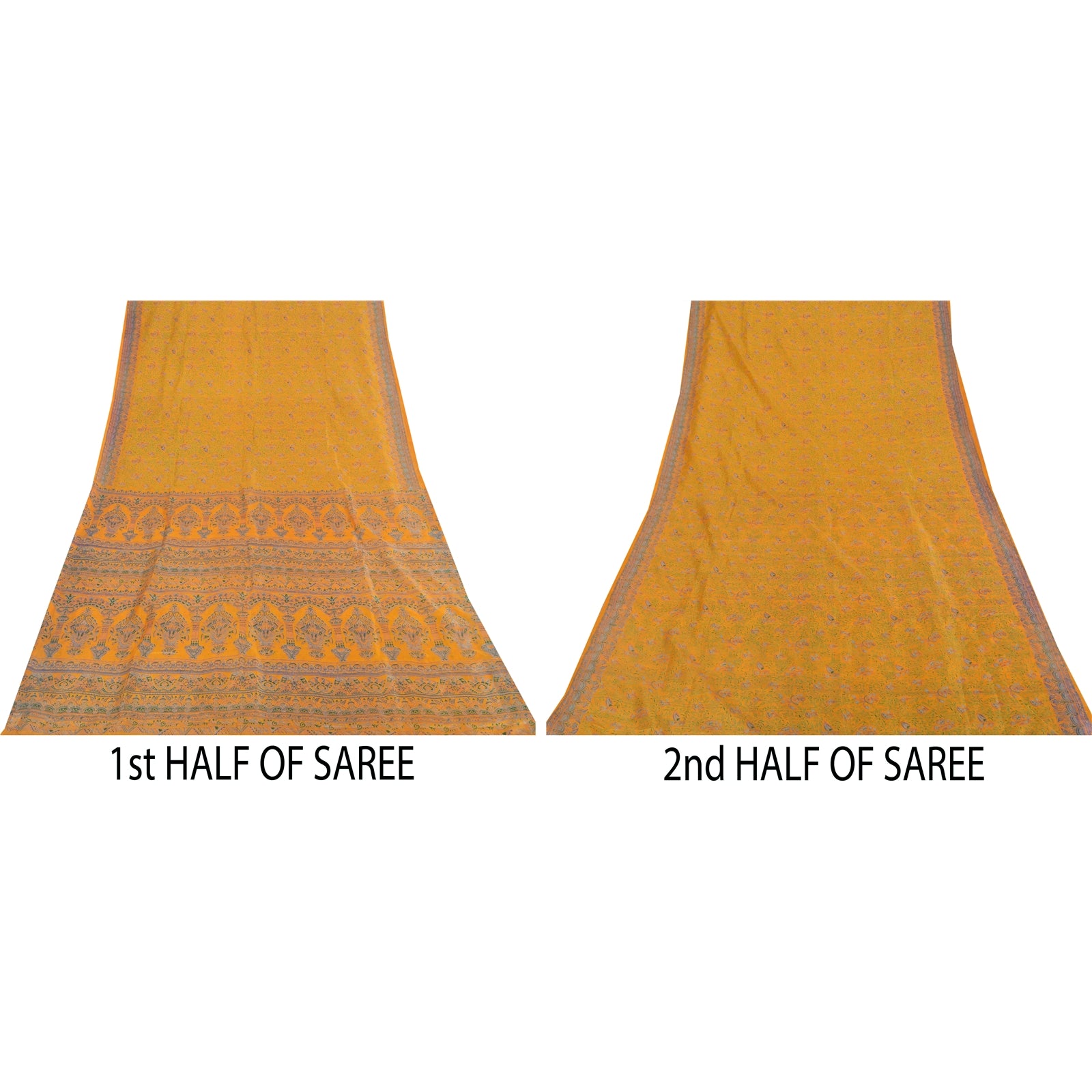 Sanskriti Vintage Sarees Yellow Indian Pure Silk Printed Sari 5+yd Craft Fabric