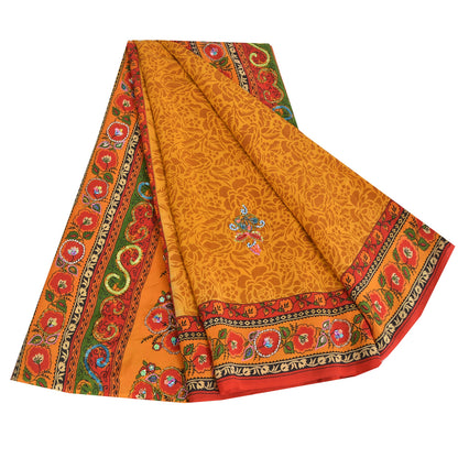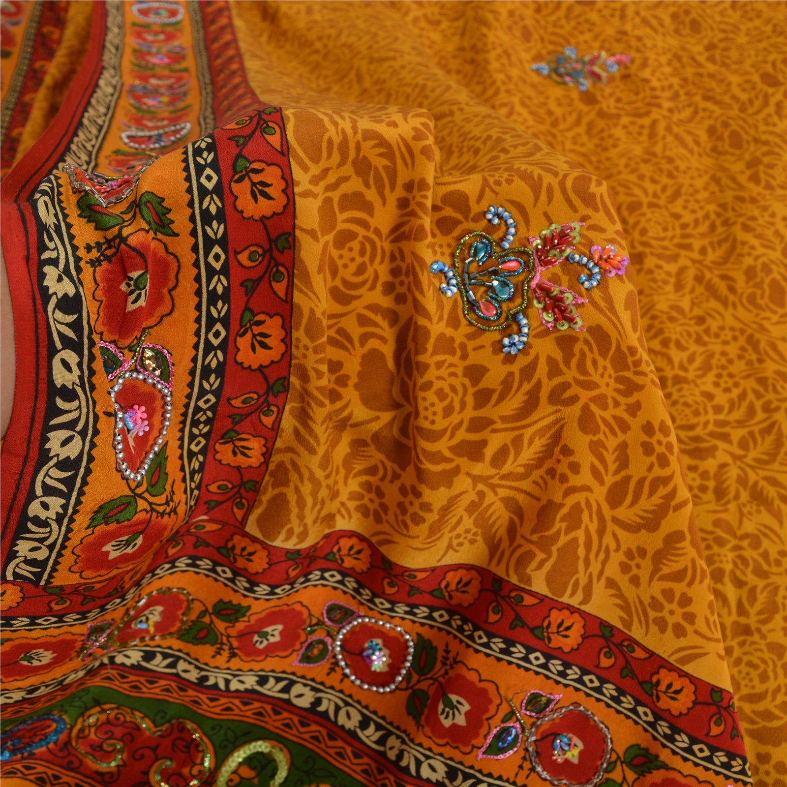 Sanskriti Vintage Sarees Yellow Pure Crepe Print Hand Bead Sari 5yd Craft Sustainable Fabric