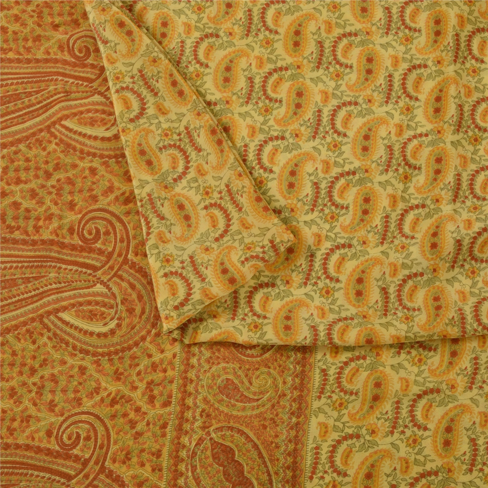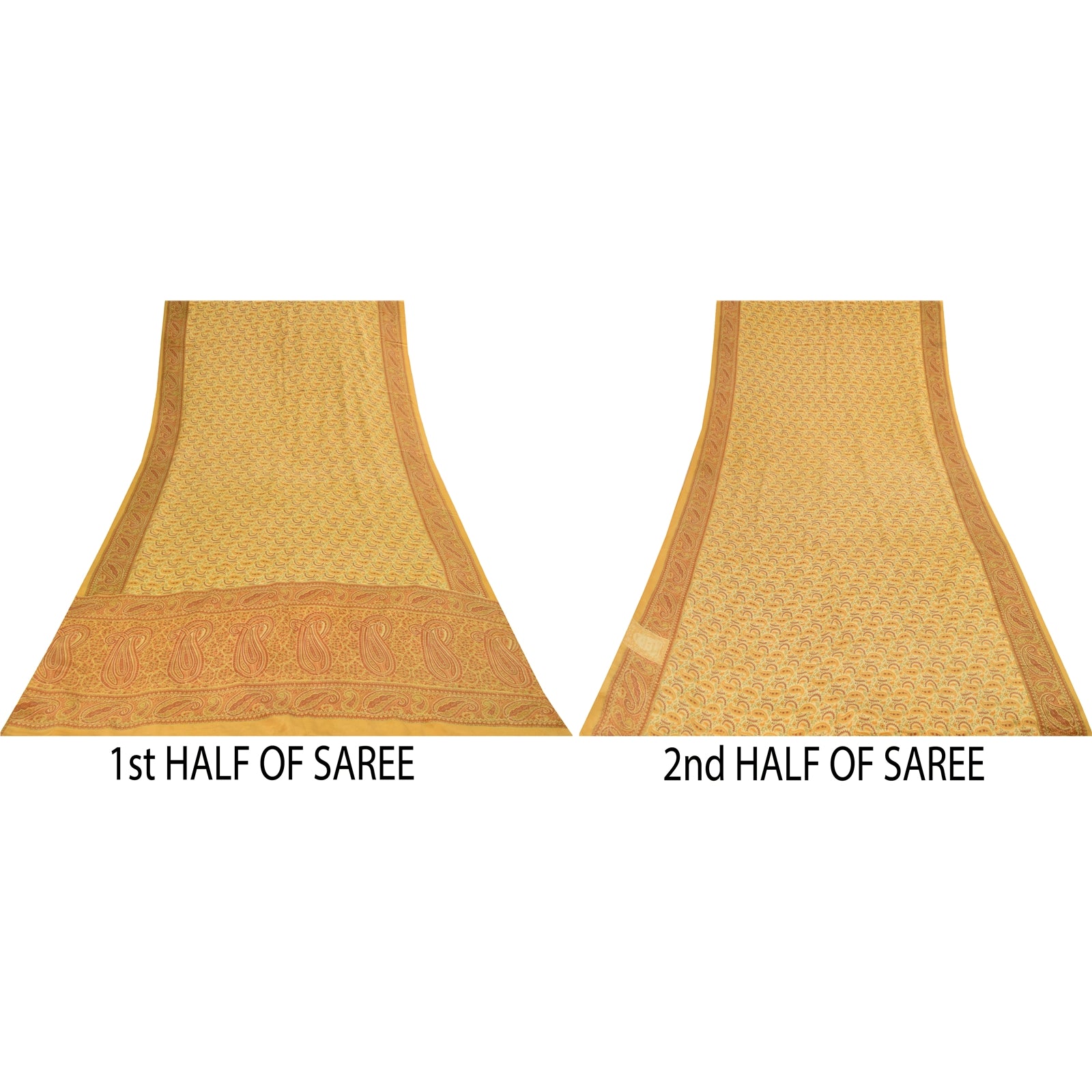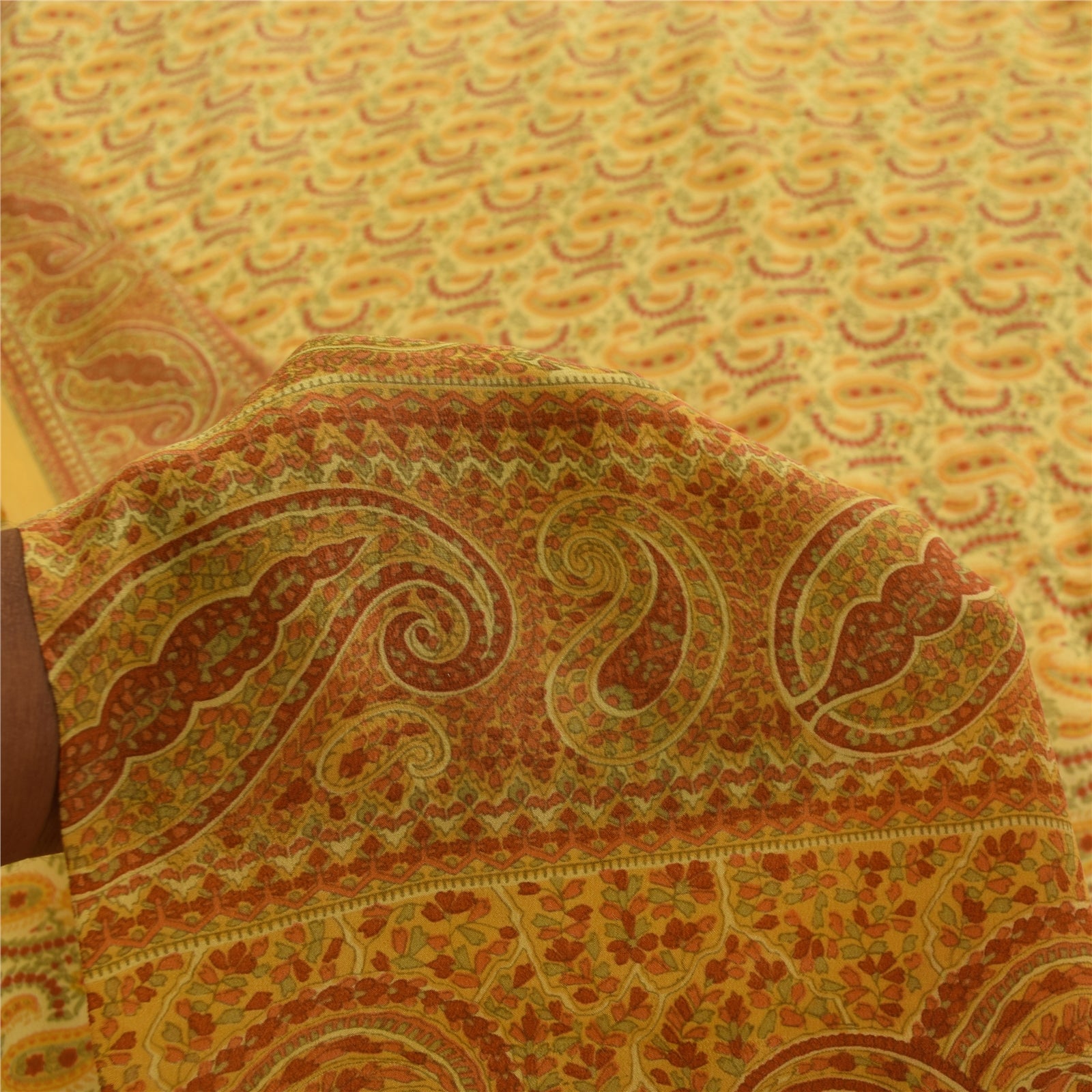 Sanskriti Vintage Sarees Yellow Pure Crepe Silk Printed Sari 5+yd Craft Fabric