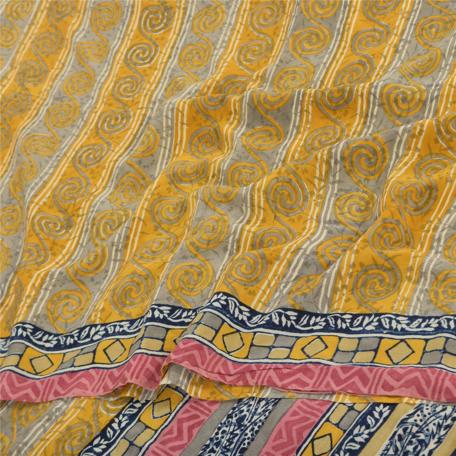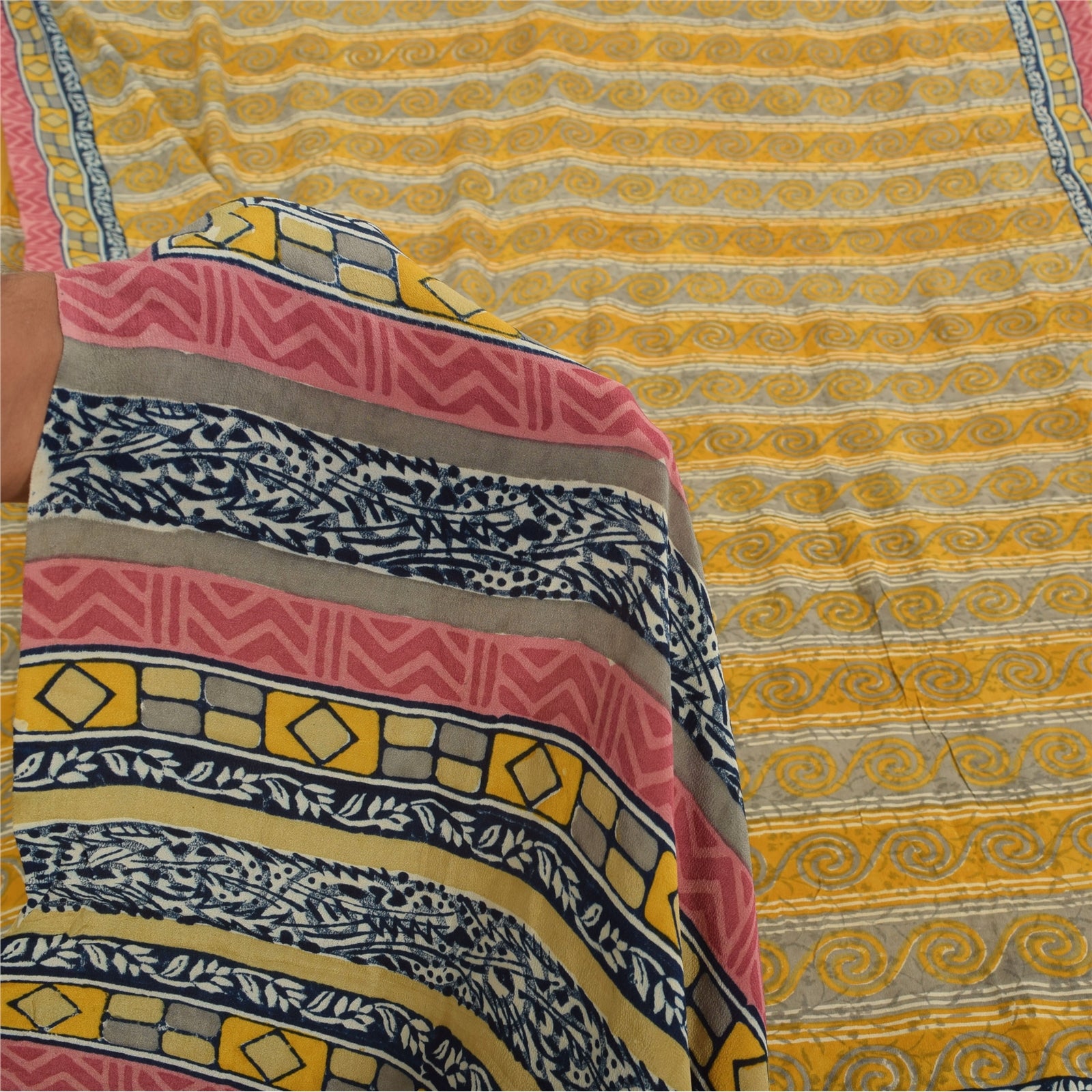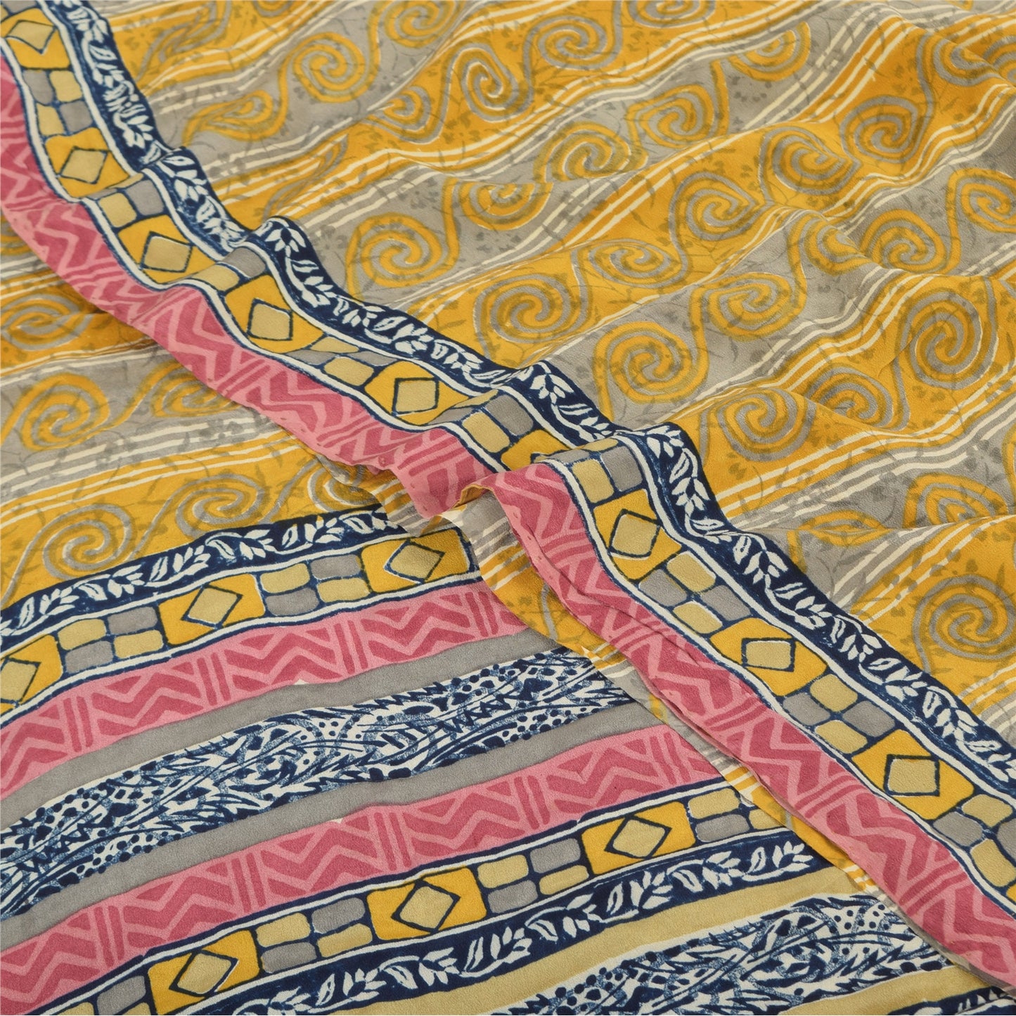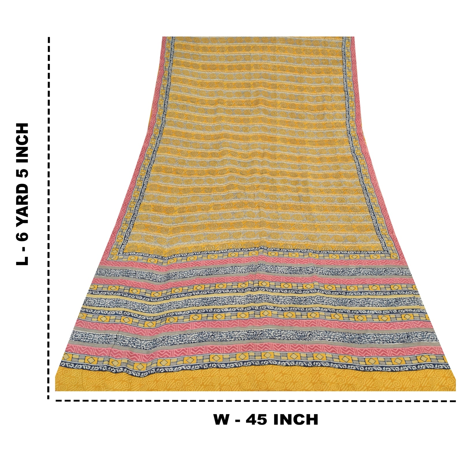 Sanskriti Vintage Sarees Yellow Pure Crepe Silk Printed Sari 6yd Craft Sustainable Fabric