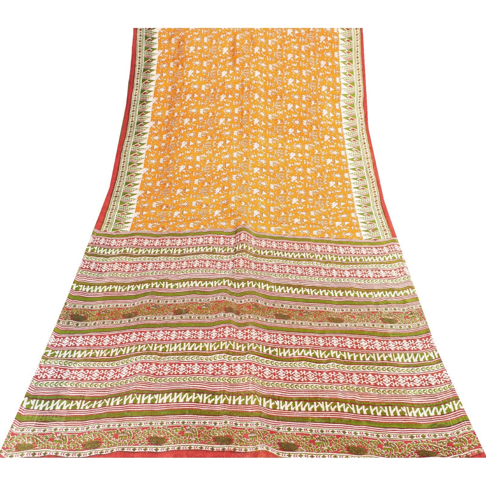 Sanskriti Vintage Sarees Yellow Pure Silk Paisley GeometricPrint Sari 6yd Fabric