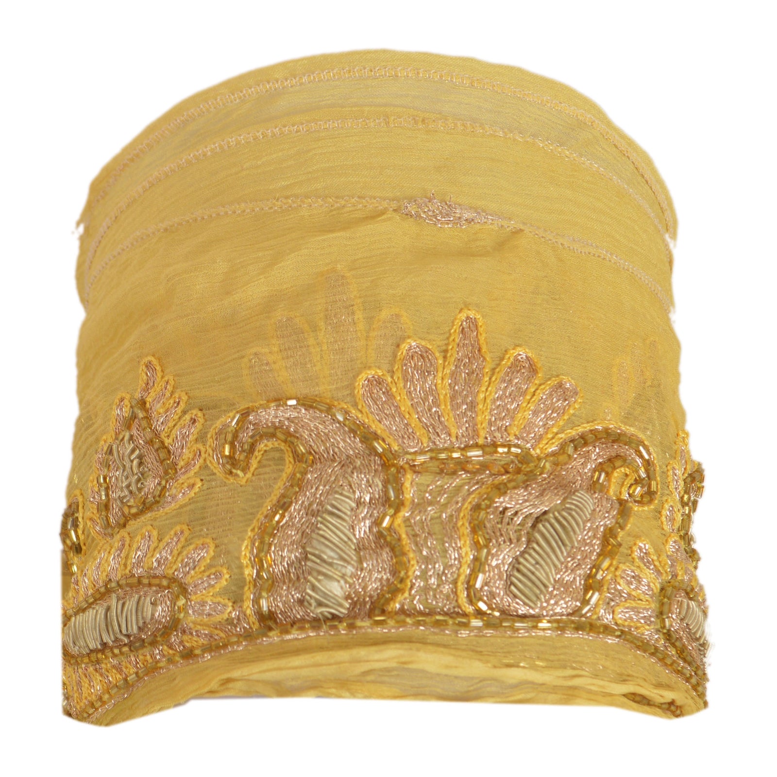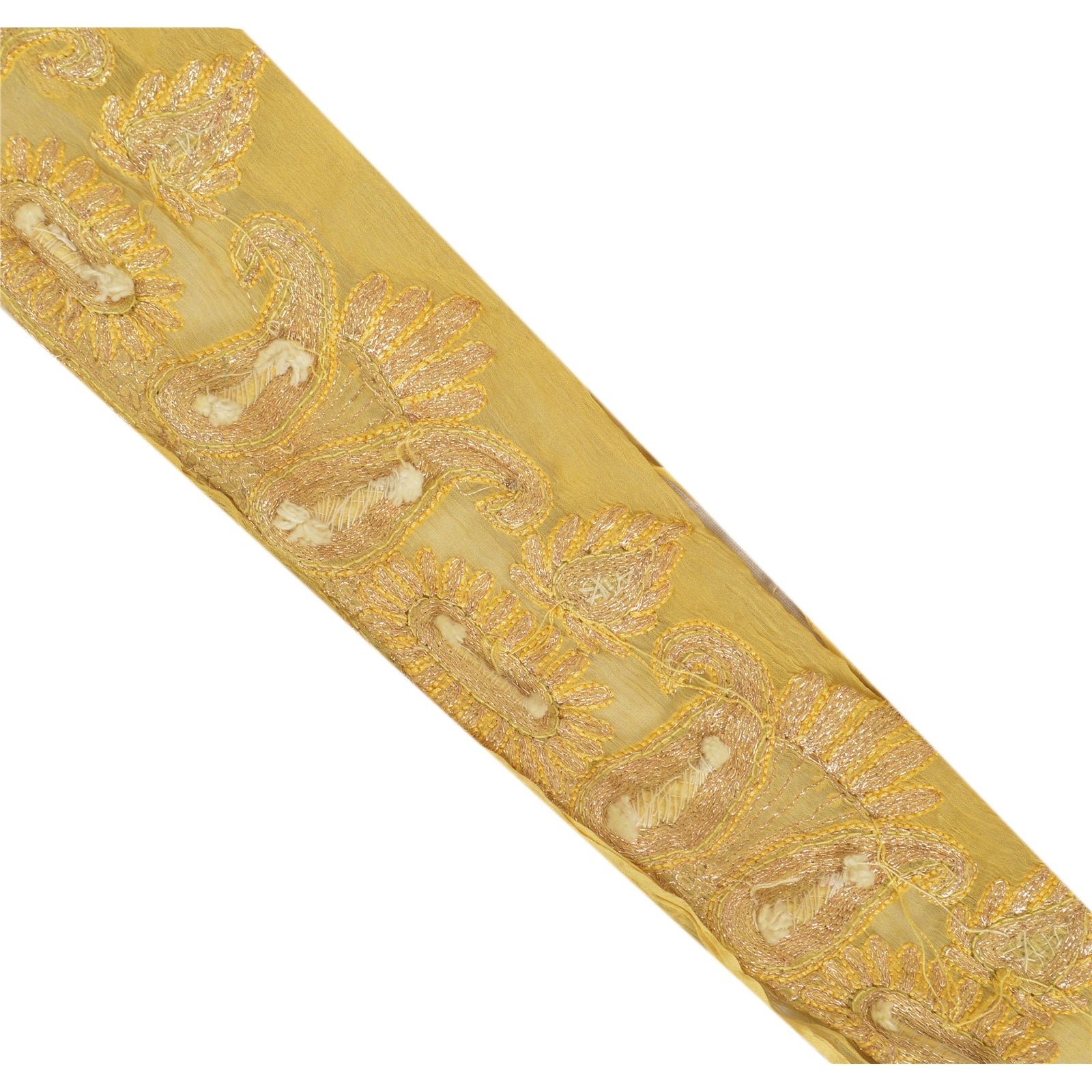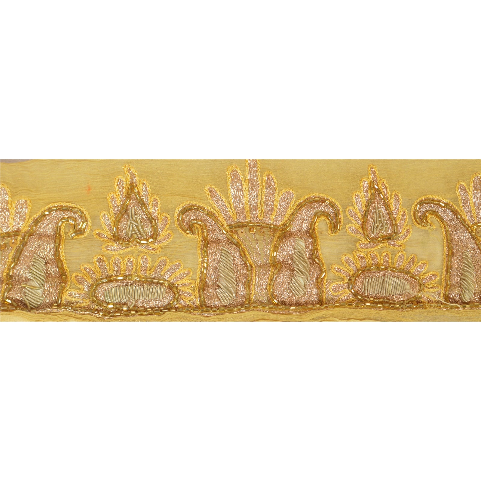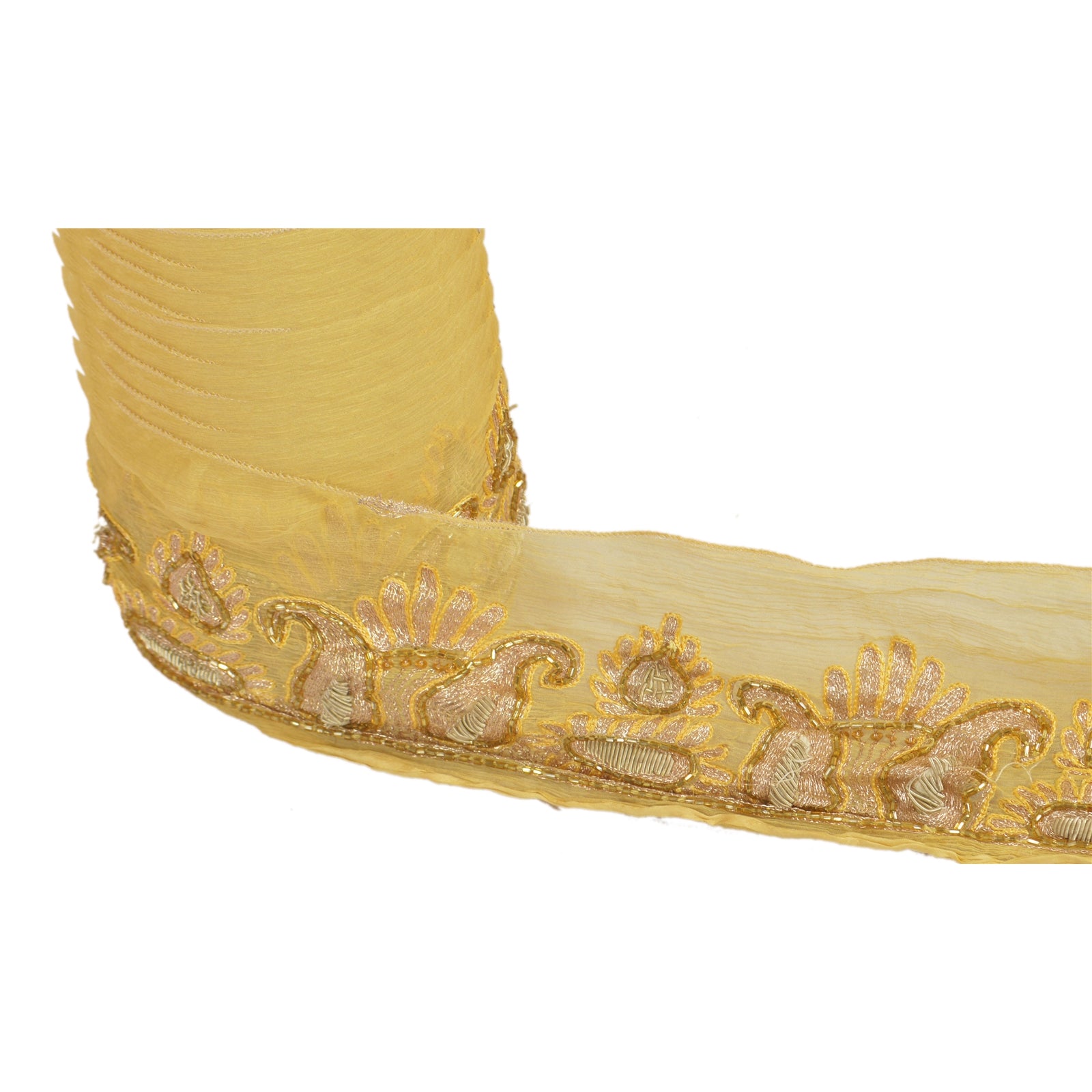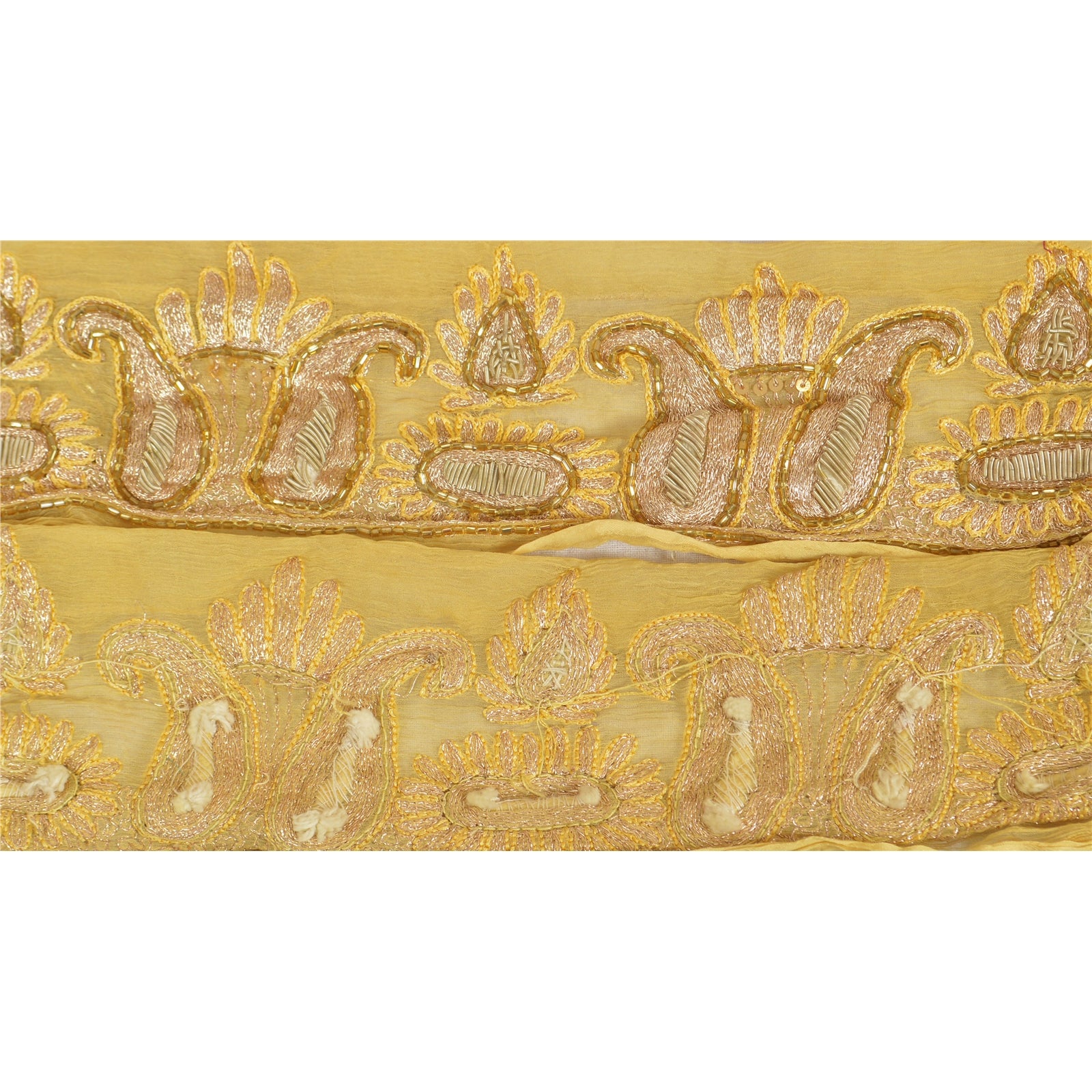 Amazing chiffon silk hand beaded sari border in cream color highlighting beaded work. Border has beautiful floral & paisley patterns painstakingly hand beaded with gold zari/zardozi work, yellow glass beads work . Further you can see fine detailing with cream thread work. WOW!! an awesome one of a kind versatile border. 1 Quantity = 1 Yard