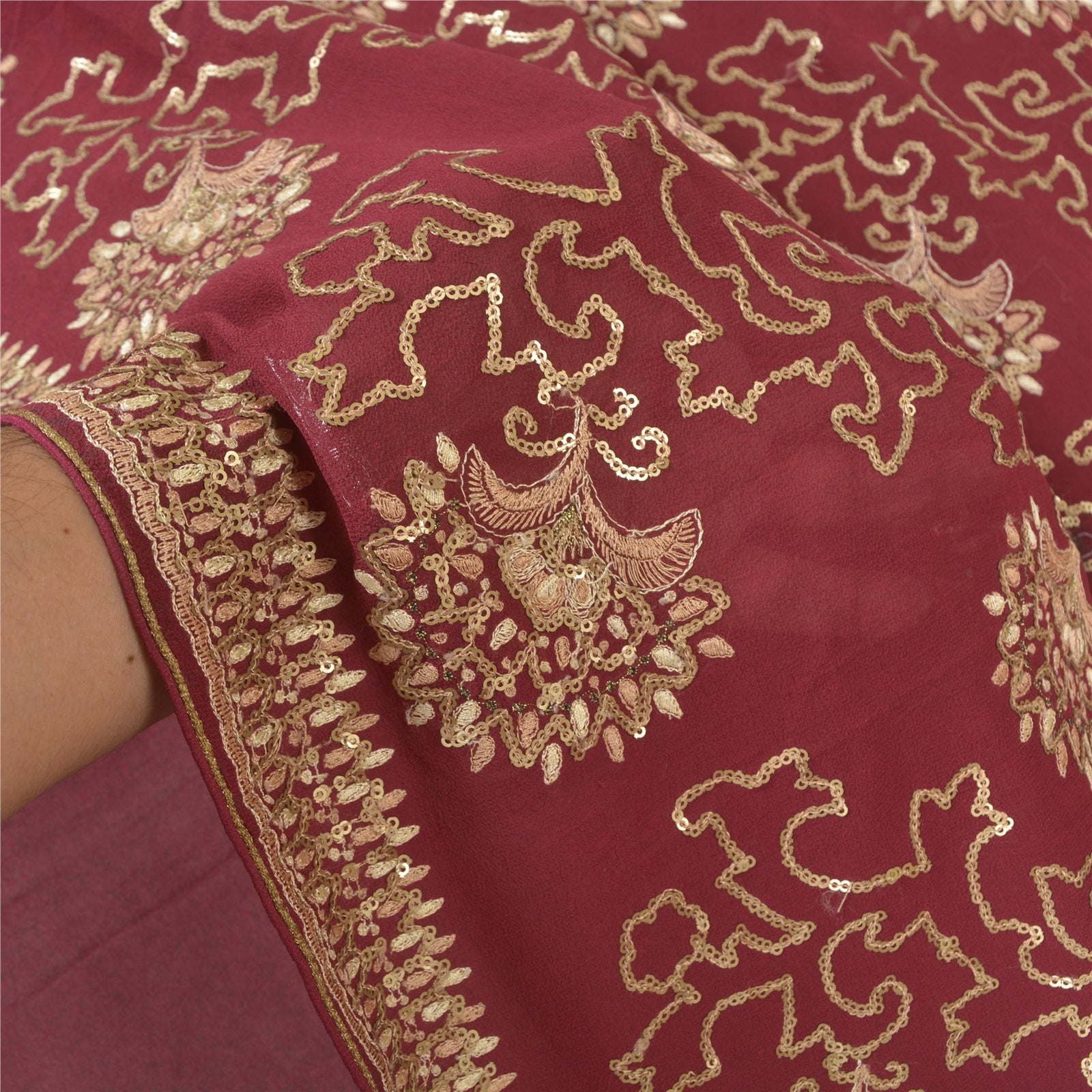 Beautiful shade of wine colored 100% pure georgette silk hand embroidered heavy saree. Border features floral design embroidered with golden sequins & thread work. You can see the center part of saree fully covered thread & sequins work with floral pattern. This heavy saree can be used for various crafting ideas too. Use it for dress designing, as a throw, as window dressing, upholstery, table linen and much more. Let your creative juices flow!
