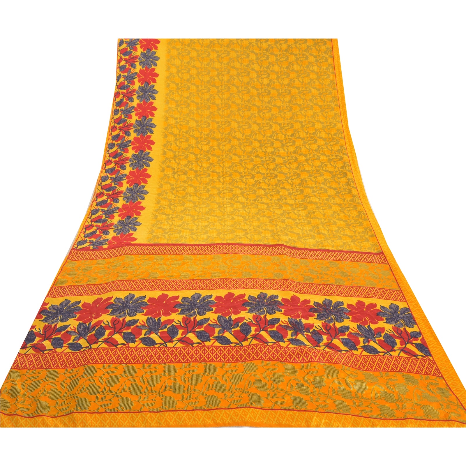 Sanskriti Vintage Yellow Sarees Moss Crepe Floral Printed Craft Sustainable Fabric Sari