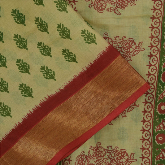 Sanskriti Vintage Sarees Green Pure Silk Block Printed & Woven Sari 5+yd Fabric