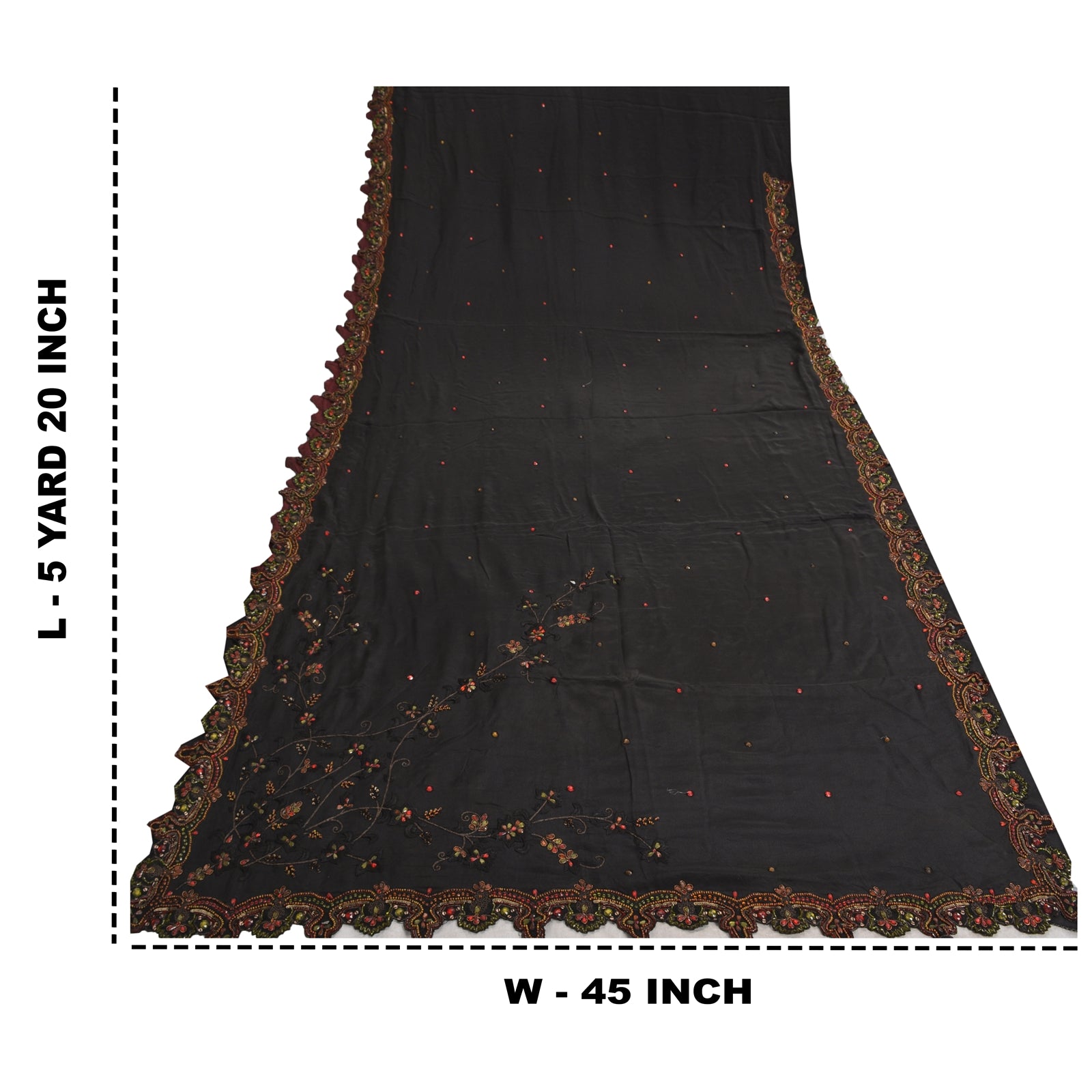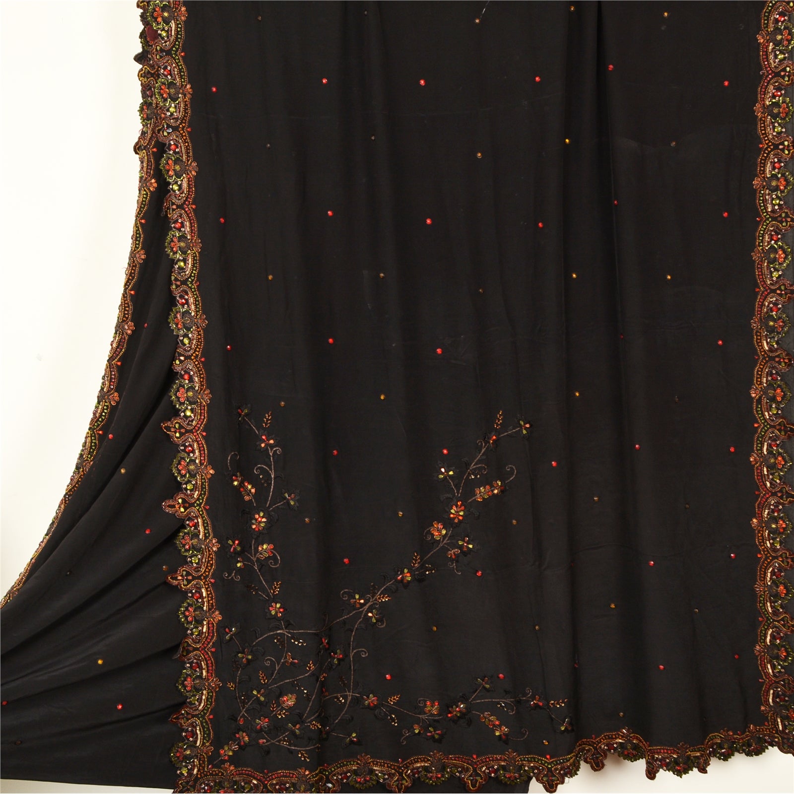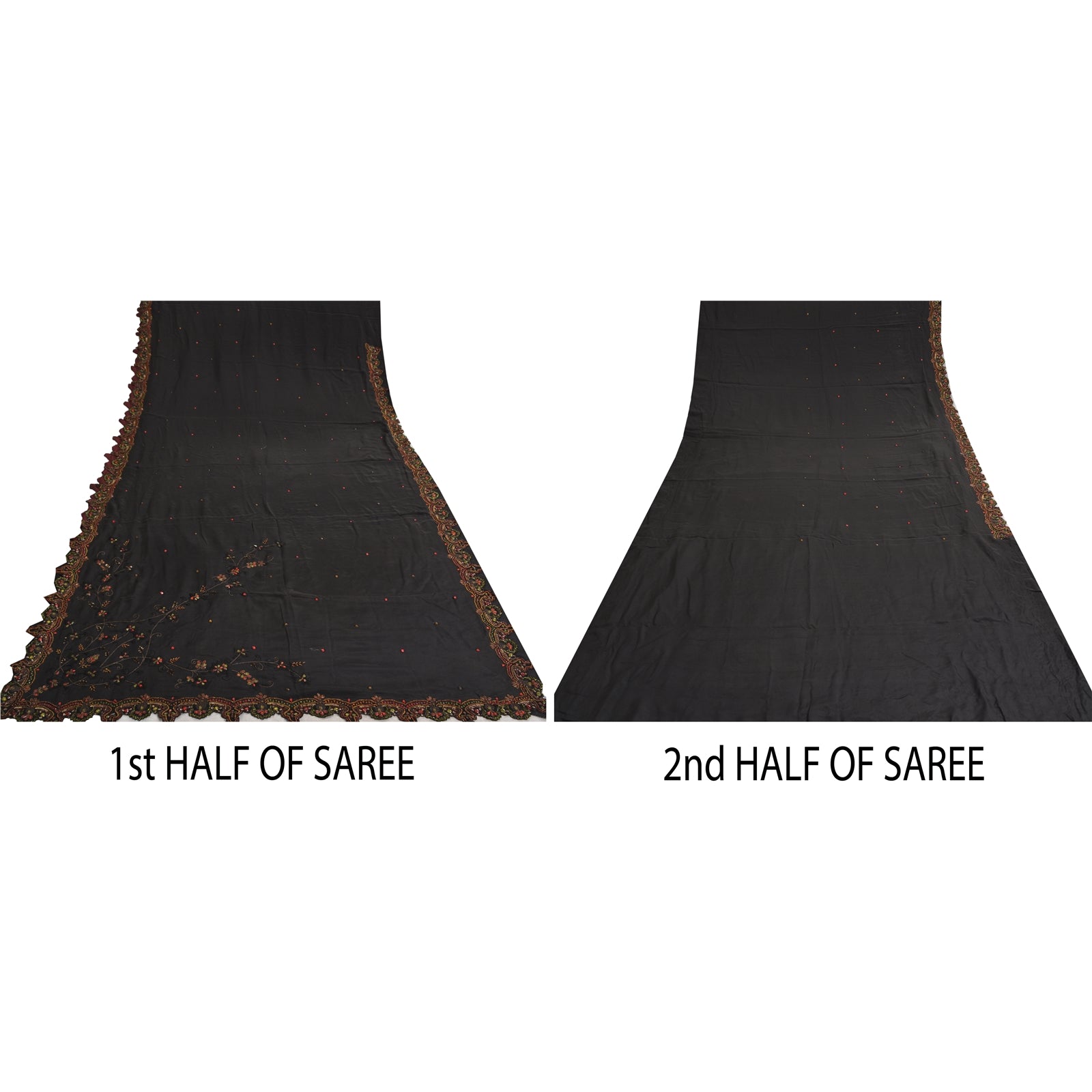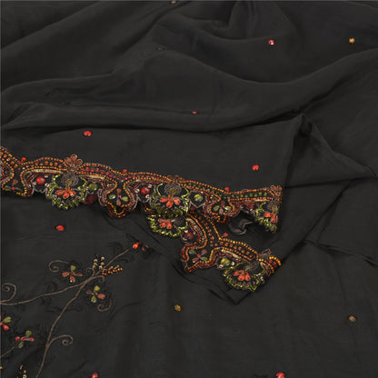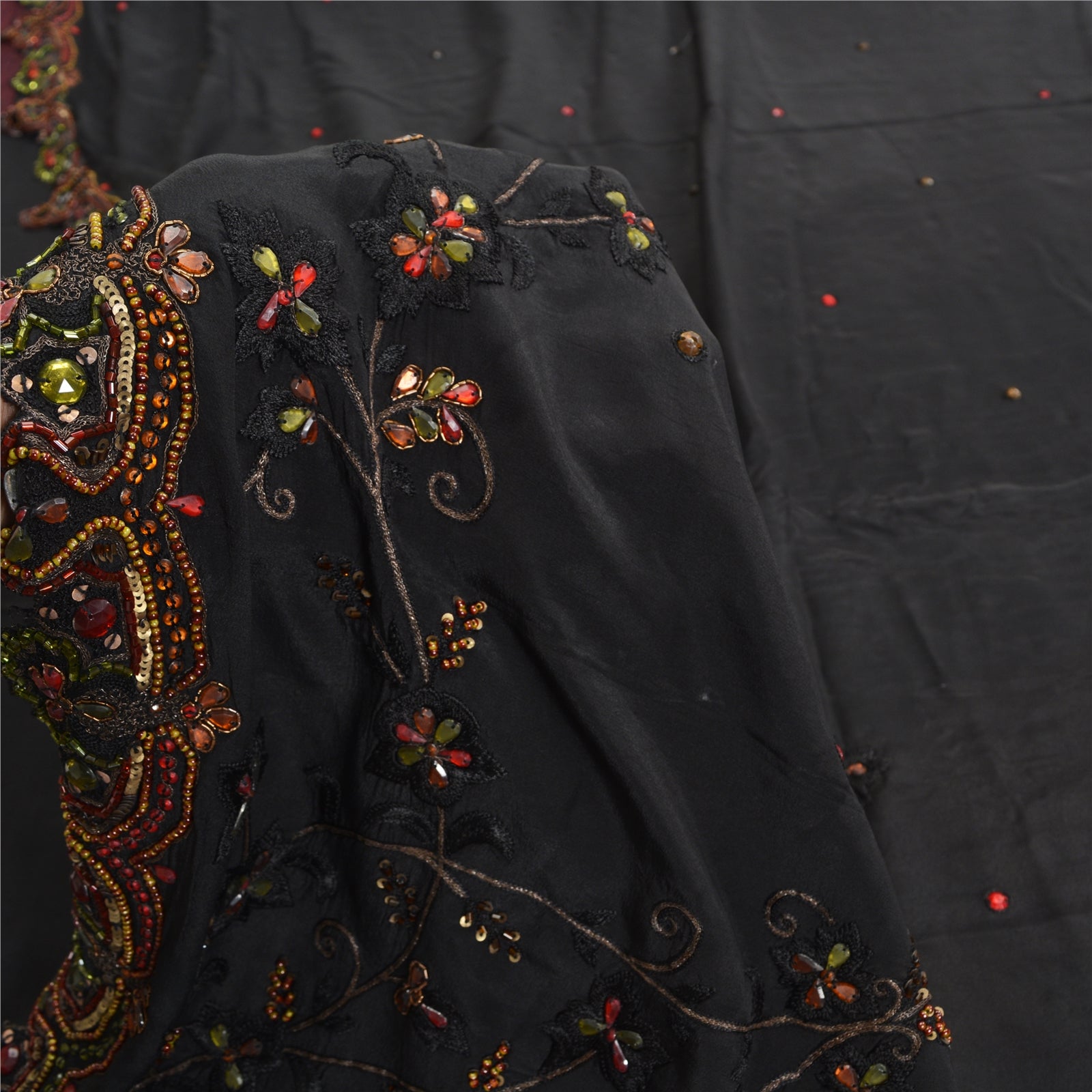 'THE ITEM COLOR OR SHADE MAY BE DARKER OR LIGHTER THAN THE PICTURE.' Beautiful black colored pure crepe silk woven sari/Sustainable Fabric. Pallu & border has floral design embellished with golden zari work, multi color sequins, beads & rhinestones work. The center of the saree has floral design with beaded work. This saree can be used for various crafting ideas too. Use it for dress designing, as a throw, as window dressing, upholstery, table linen and much more. Let your creative juices flow. 'International buyers please note: Import duties, taxes, and charges are not included in the item price or postage cost. These charges are the buyer's responsibility. Please check with your country's customs office to determine what these additional costs will be prior to bidding or buying. Buyer will pay custom duty/tax. It is calculated and charged differently by every country. As a seller I do not have any control over it. VAT or sales tax is calculated by the platform at the time of checkout. Customs charge is payable at the time of delivery.'