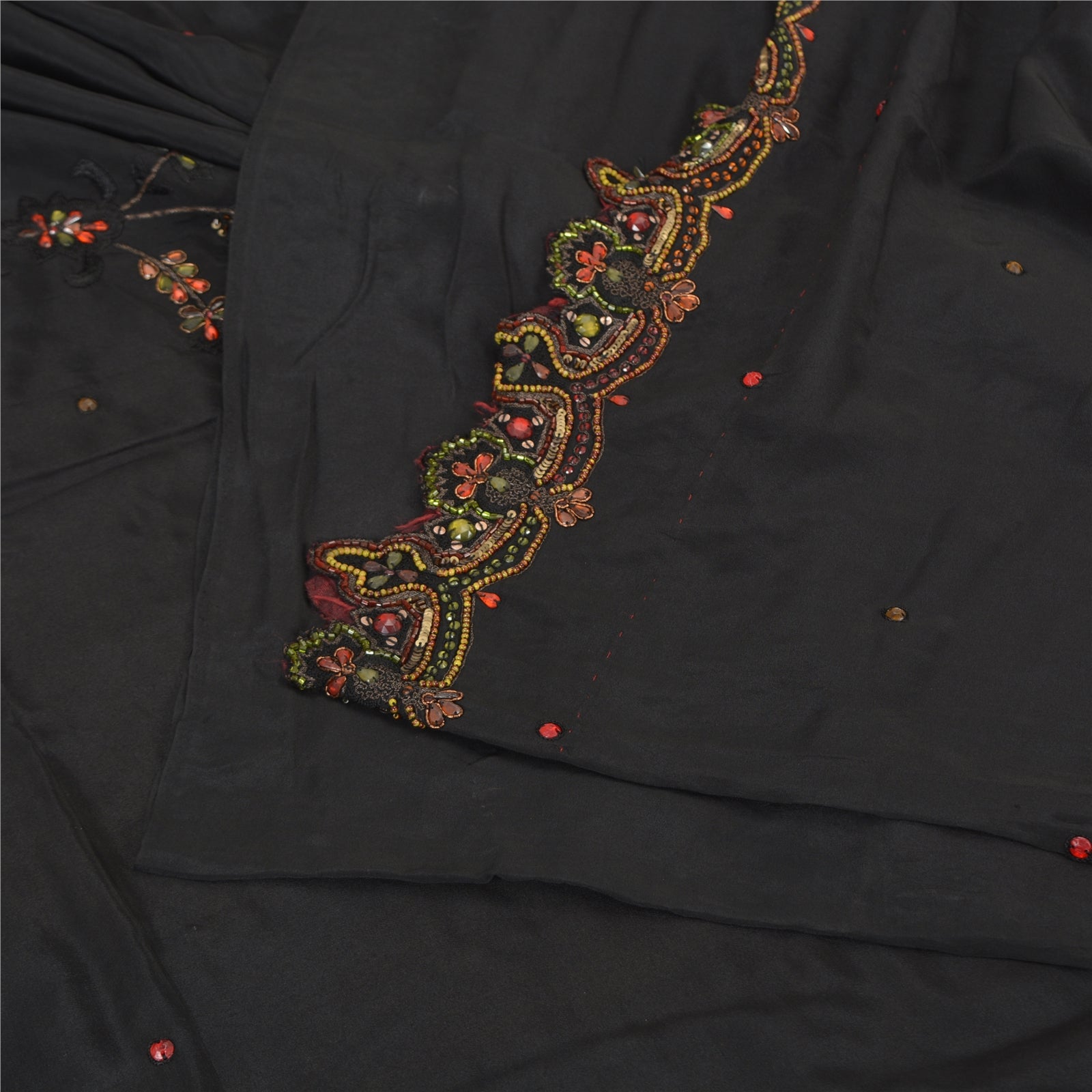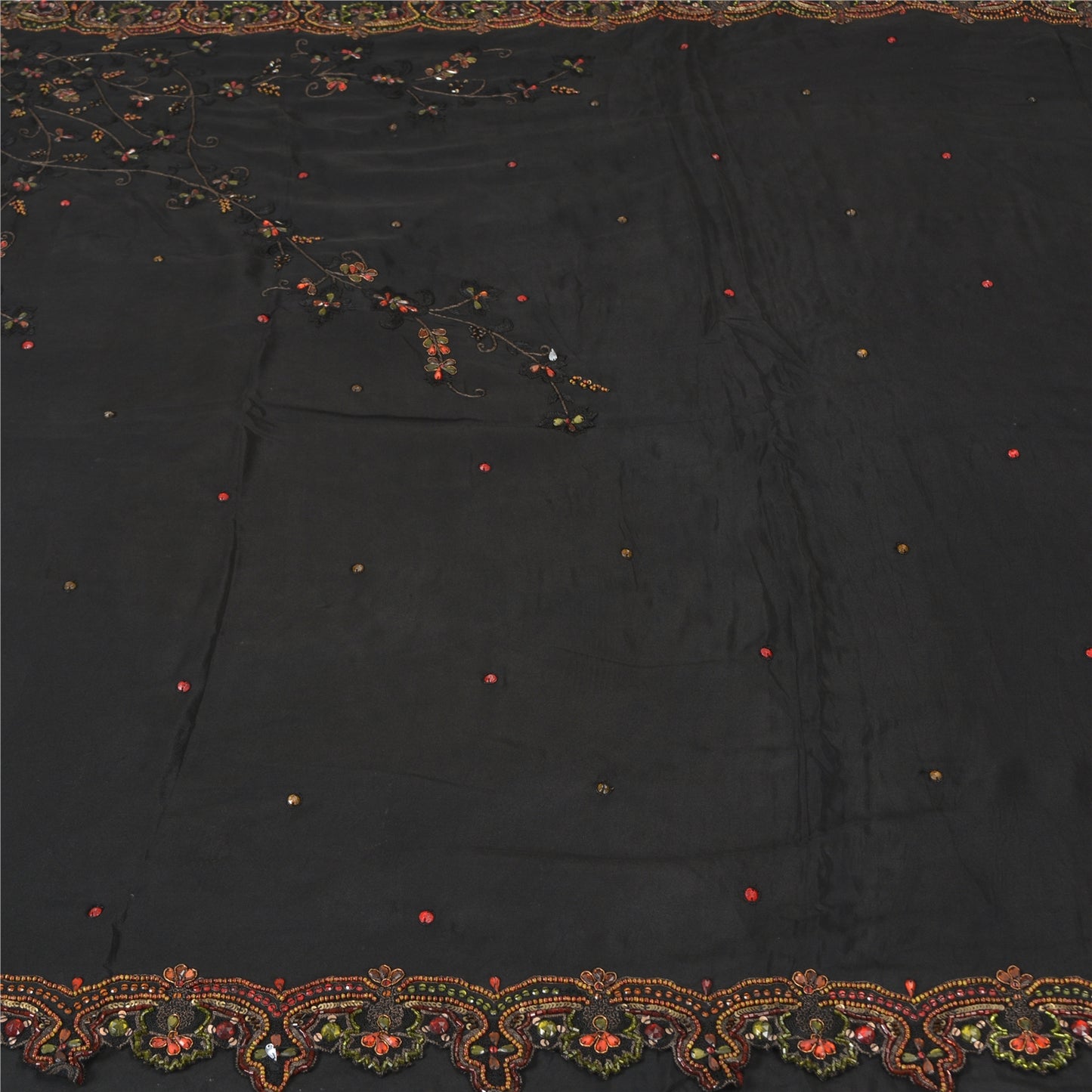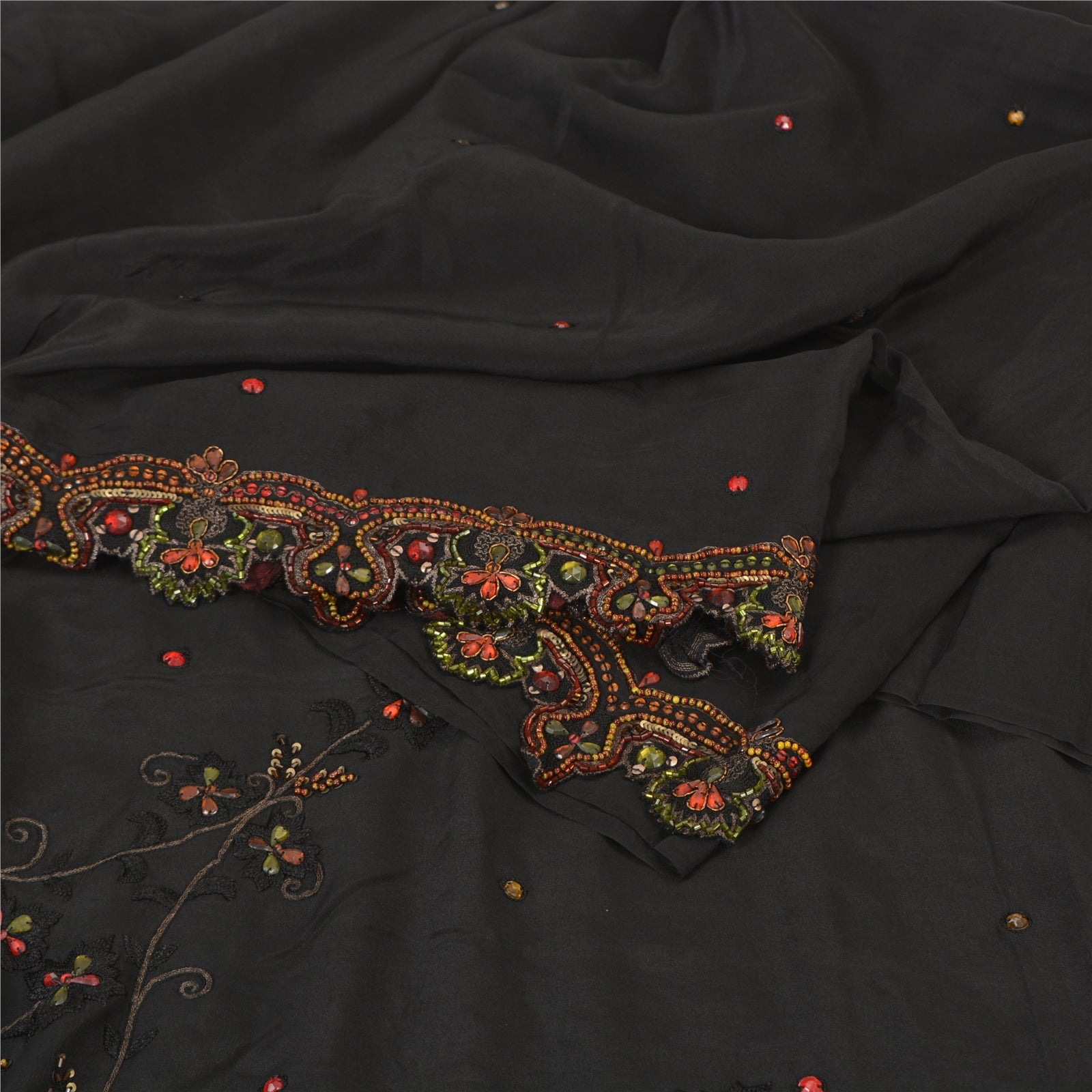 'THE ITEM COLOR OR SHADE MAY BE DARKER OR LIGHTER THAN THE PICTURE.' Beautiful black colored pure crepe silk woven sari/Sustainable Fabric. Pallu & border has floral design embellished with golden zari work, multi color sequins, beads & rhinestones work. The center of the saree has floral design with beaded work. This saree can be used for various crafting ideas too. Use it for dress designing, as a throw, as window dressing, upholstery, table linen and much more. Let your creative juices flow. 'International buyers please note: Import duties, taxes, and charges are not included in the item price or postage cost. These charges are the buyer's responsibility. Please check with your country's customs office to determine what these additional costs will be prior to bidding or buying. Buyer will pay custom duty/tax. It is calculated and charged differently by every country. As a seller I do not have any control over it. VAT or sales tax is calculated by the platform at the time of checkout. Customs charge is payable at the time of delivery.'