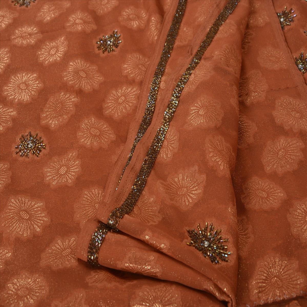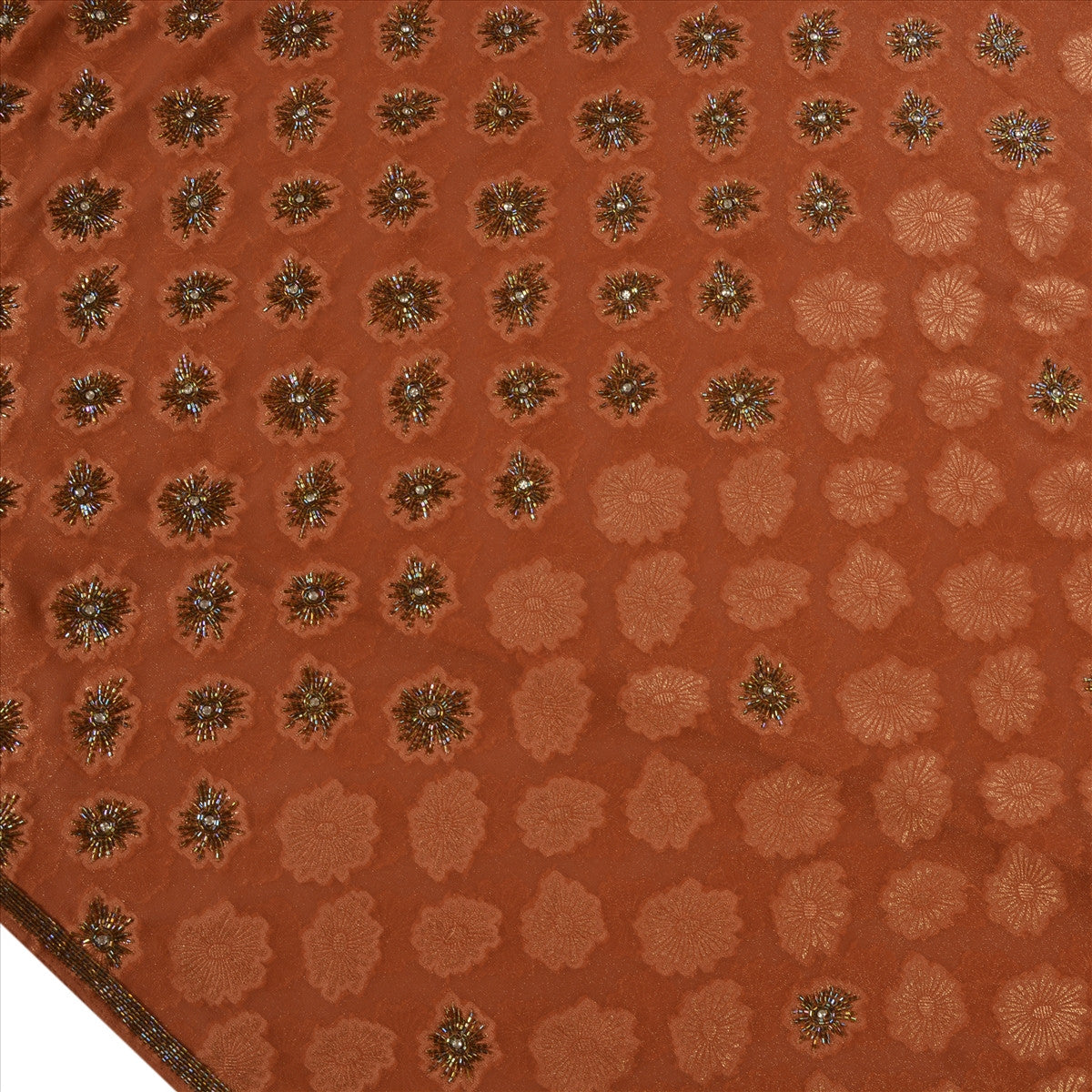 Sparkling zircon work with floral design on peach color base Sustainable Fabric is really enhancing the beauty of the saree.