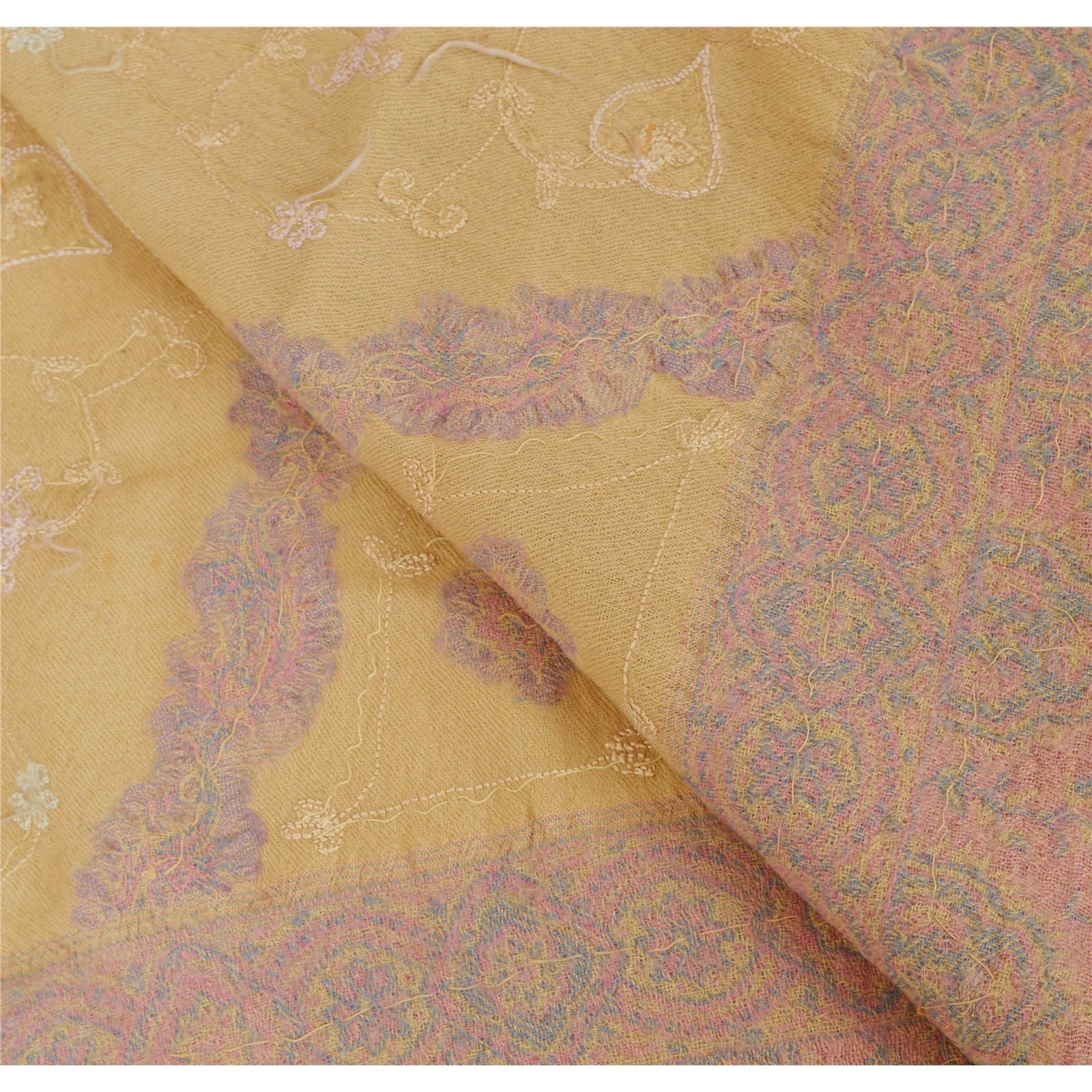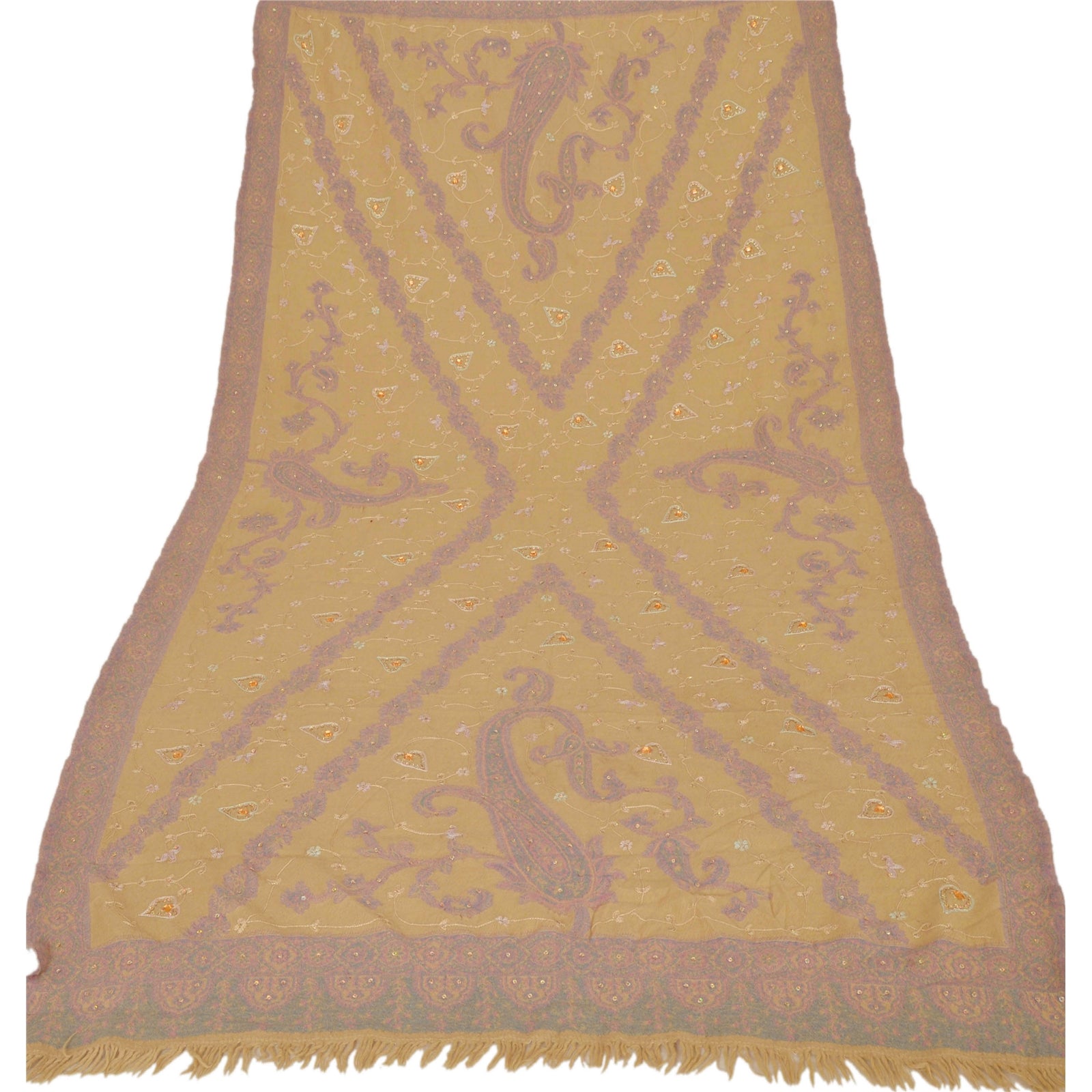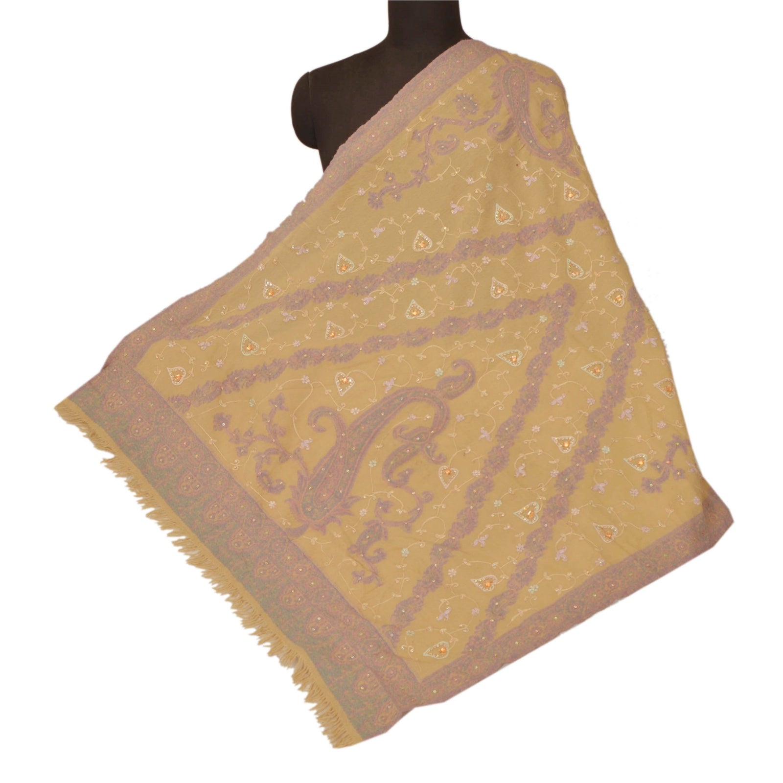 We are offering you a vintage cream colored woolen stole which adorns hand embroidered Ari work & woven work. A pen like needle which resembles the shape of a crochet needle, gives rise to an intrinsic form of artwork called the ‘Ari work’. It is an exquisite needlework of repeated fine chain stitches, worked in multi-colored silk on a satin or cotton Sustainable Fabric. It is a series of unbroken stitches that take the shape of abstract nature and wildlife motifs. The shawl or stole features floral & paisley design with cream color threads, golden sequins, peach rhinestone work & pink/blue woven work. It also has cream fringes. This cozy, warm and fuzzy stole is soft against skin due to the mellow woolen Sustainable Fabric. A truly gorgeous piece which will also make an admirable gift.
