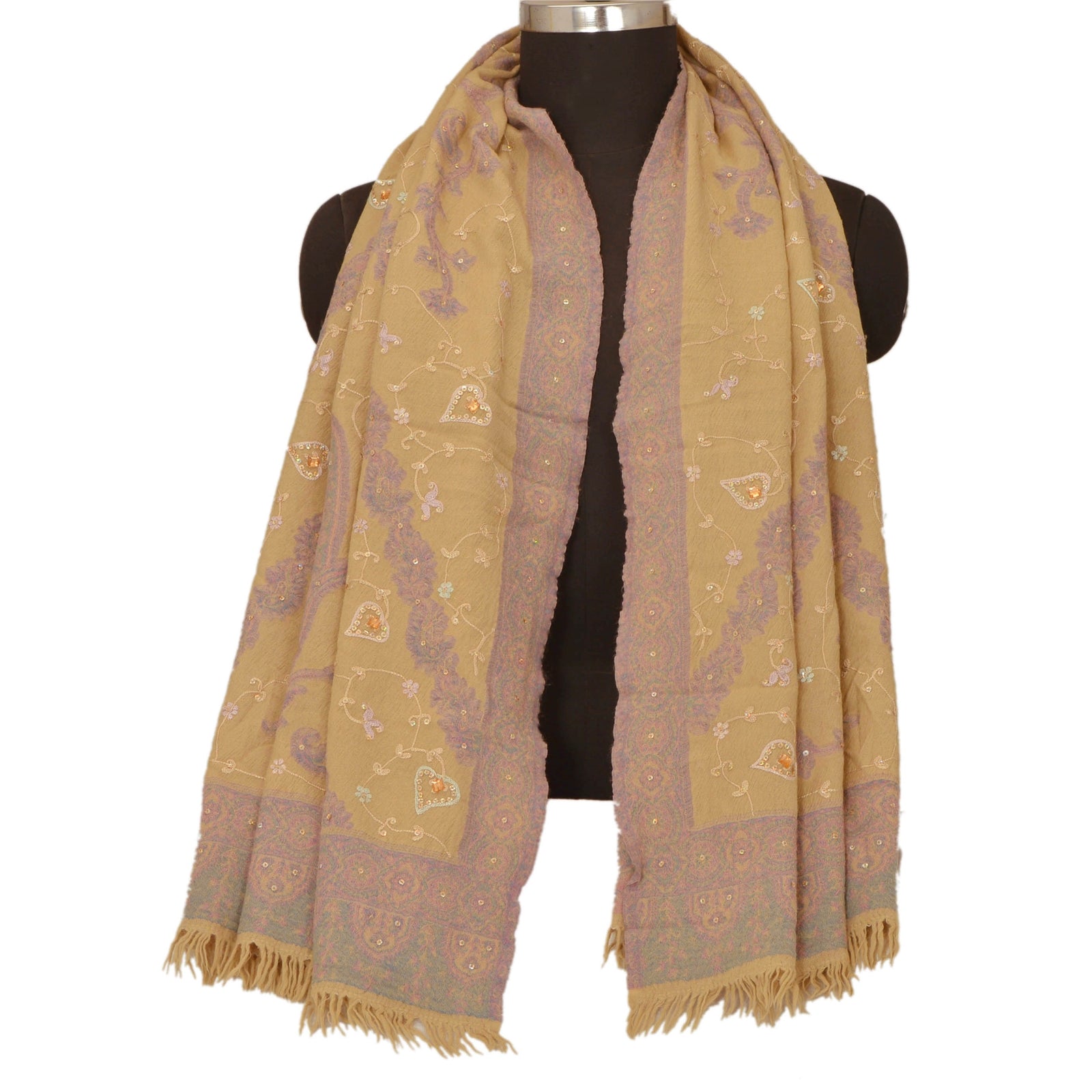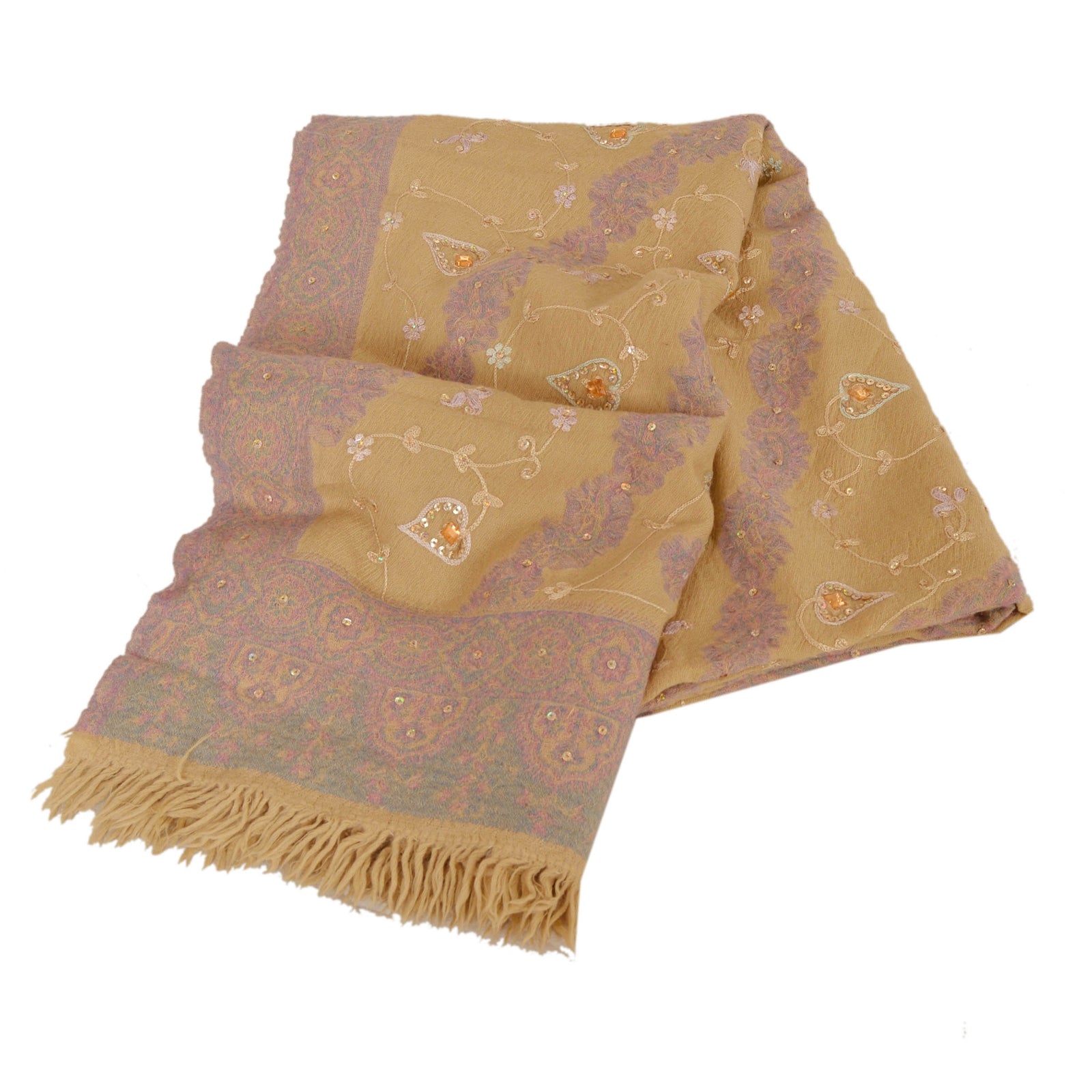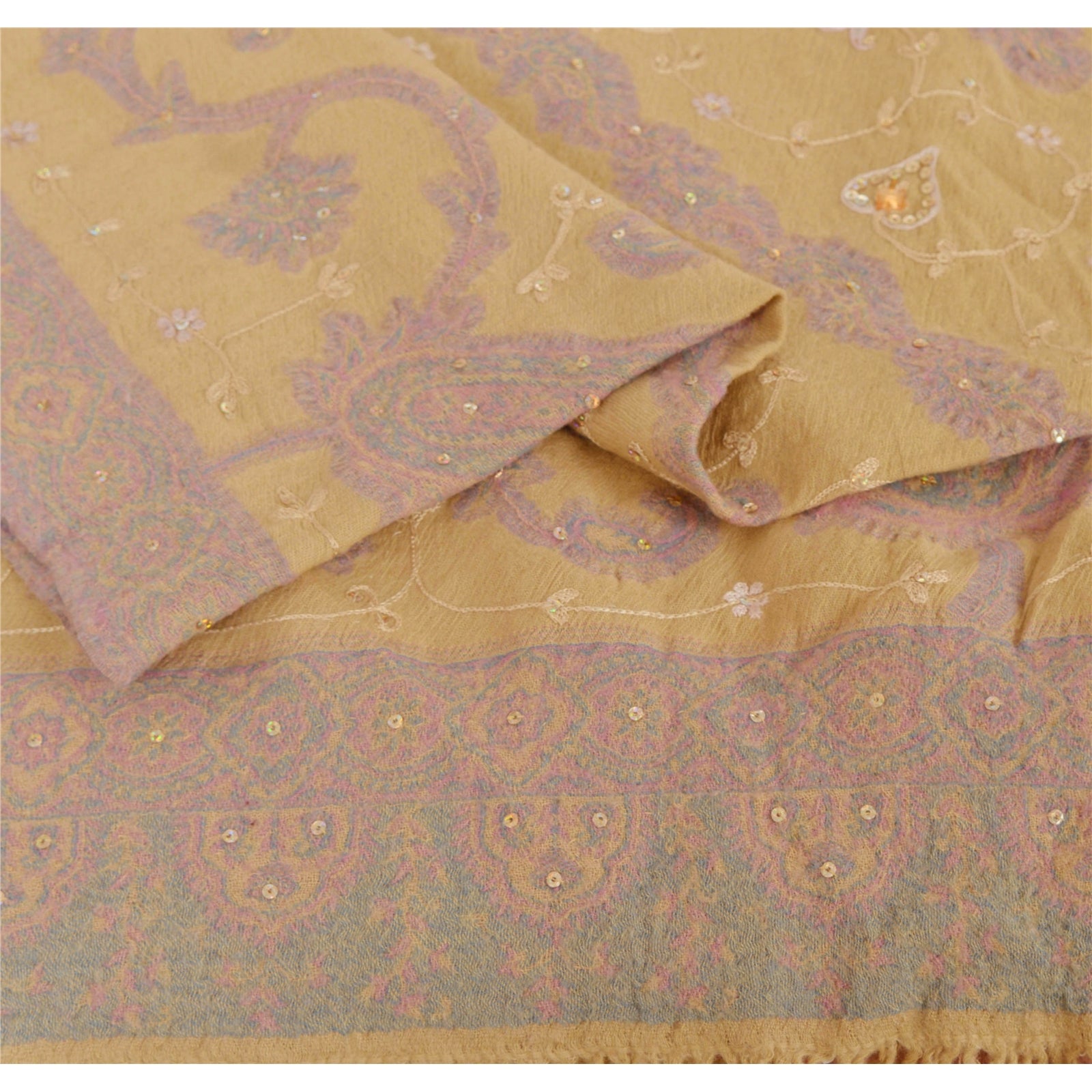 We are offering you a vintage cream colored woolen stole which adorns hand embroidered Ari work & woven work. A pen like needle which resembles the shape of a crochet needle, gives rise to an intrinsic form of artwork called the ‘Ari work’. It is an exquisite needlework of repeated fine chain stitches, worked in multi-colored silk on a satin or cotton Sustainable Fabric. It is a series of unbroken stitches that take the shape of abstract nature and wildlife motifs. The shawl or stole features floral & paisley design with cream color threads, golden sequins, peach rhinestone work & pink/blue woven work. It also has cream fringes. This cozy, warm and fuzzy stole is soft against skin due to the mellow woolen Sustainable Fabric. A truly gorgeous piece which will also make an admirable gift.