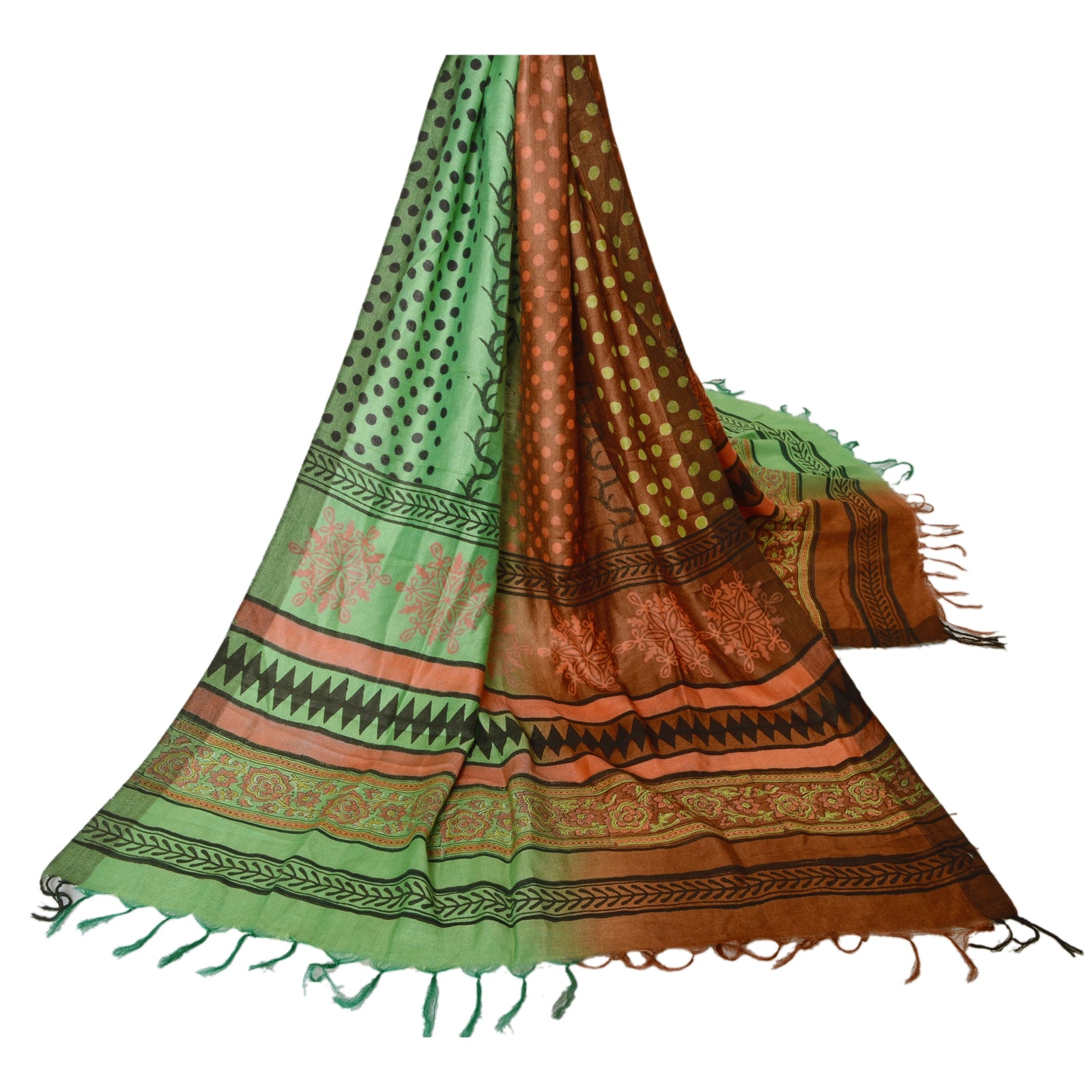 Elegant green & brown colored woolen printed long scarf/dupatta. Lovely green & brown color contrast is the main highlight of the dupatta. Alluring floral & polka dots adds to the beauty of the dupatta. A truly awesome dupatta.!!!! Dupatta has green fringes on both ends of borders . Sustainable Fabric is very soft and drapy , very easy to carry.