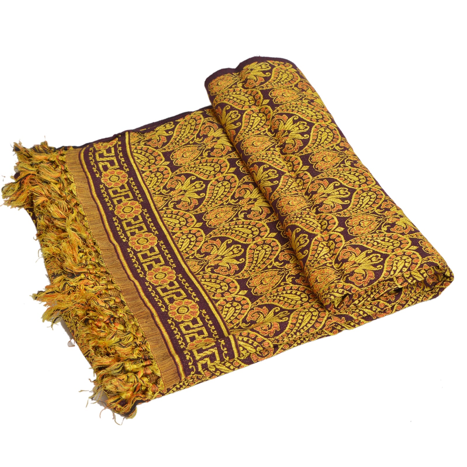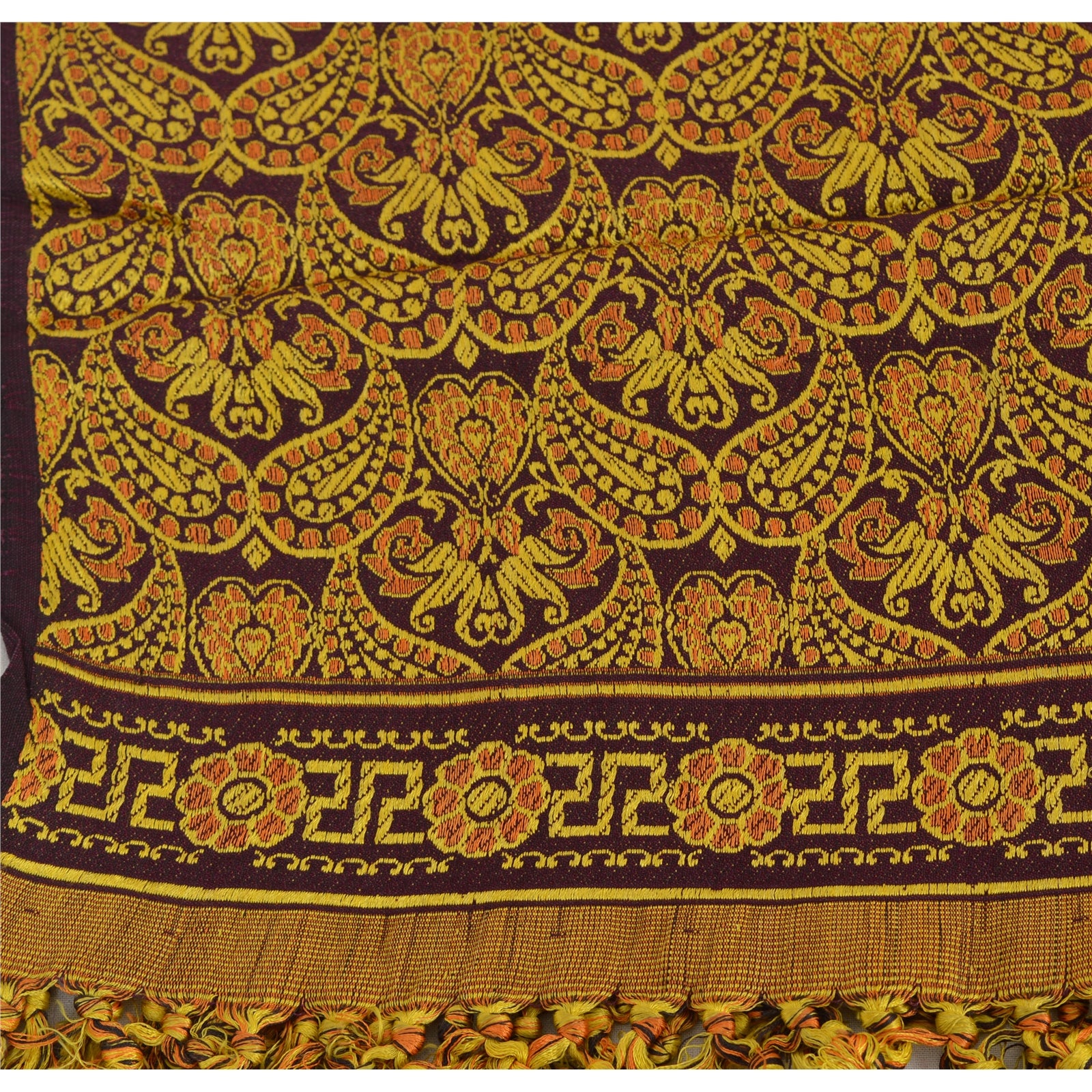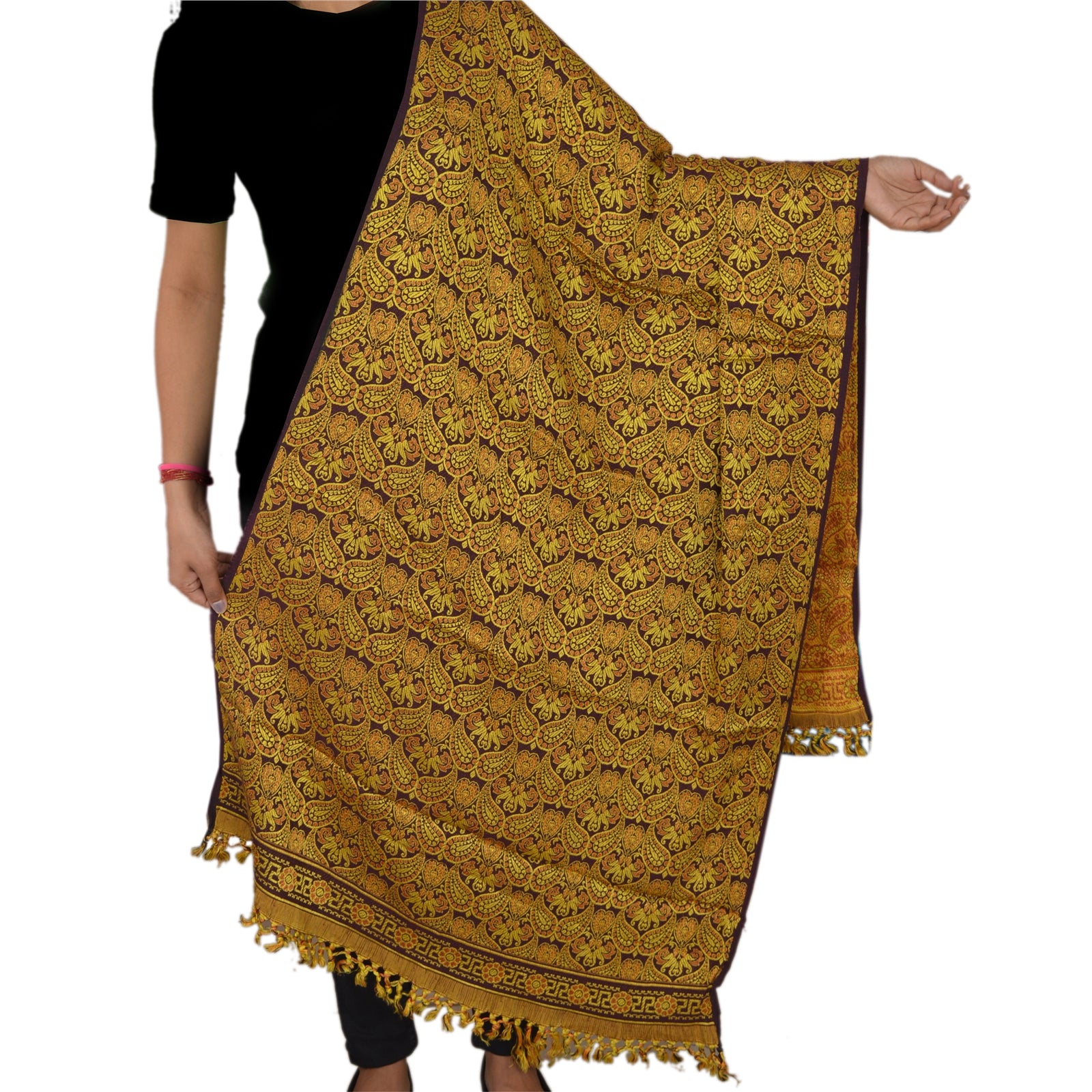 Fabulous brown colored woven woolen shawl/scarf/stole. Cozy and gorgeously soft to touch, this shawl has a beautiful woven floral & paisley design. Shawl has yellow/peach tassels on both edges. Wear this versatile piece as a scarf, stole or wrap.