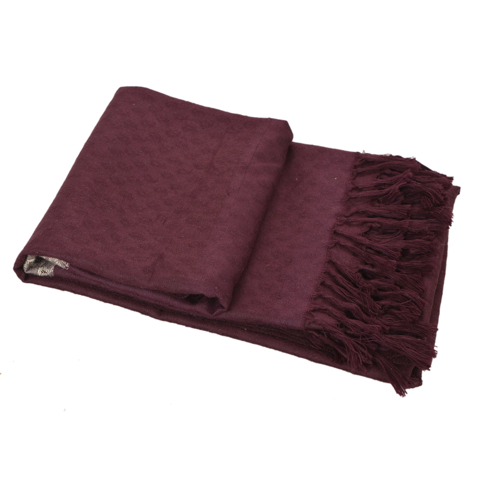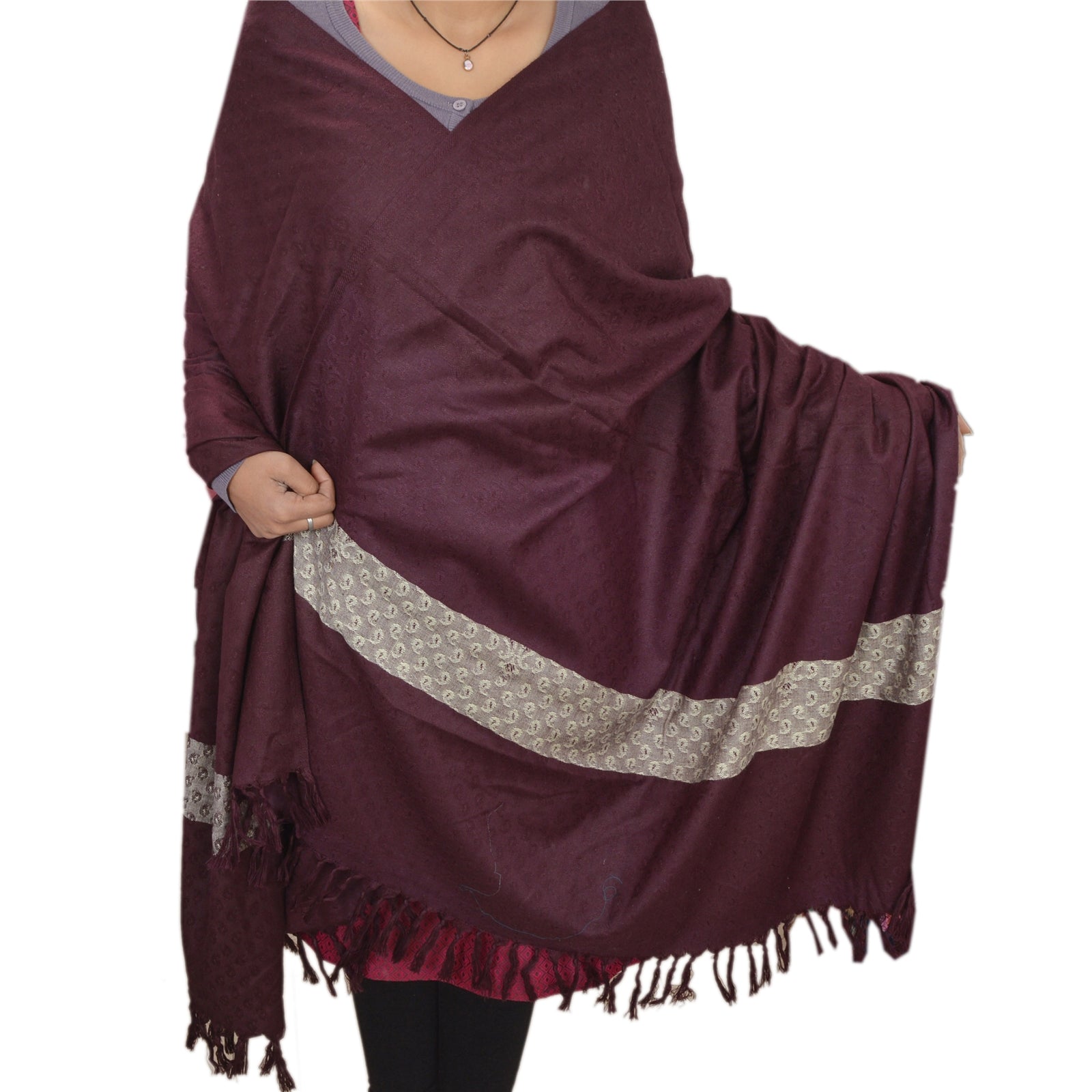 Fabulous purple colored woven woolen shawl/scarf/stole. Cozy and gorgeously soft to touch, this shawl has a beautiful woven floral & paisley design. Shawl has maroon fringes on both edges. Wear this versatile piece as a scarf, stole or wrap.