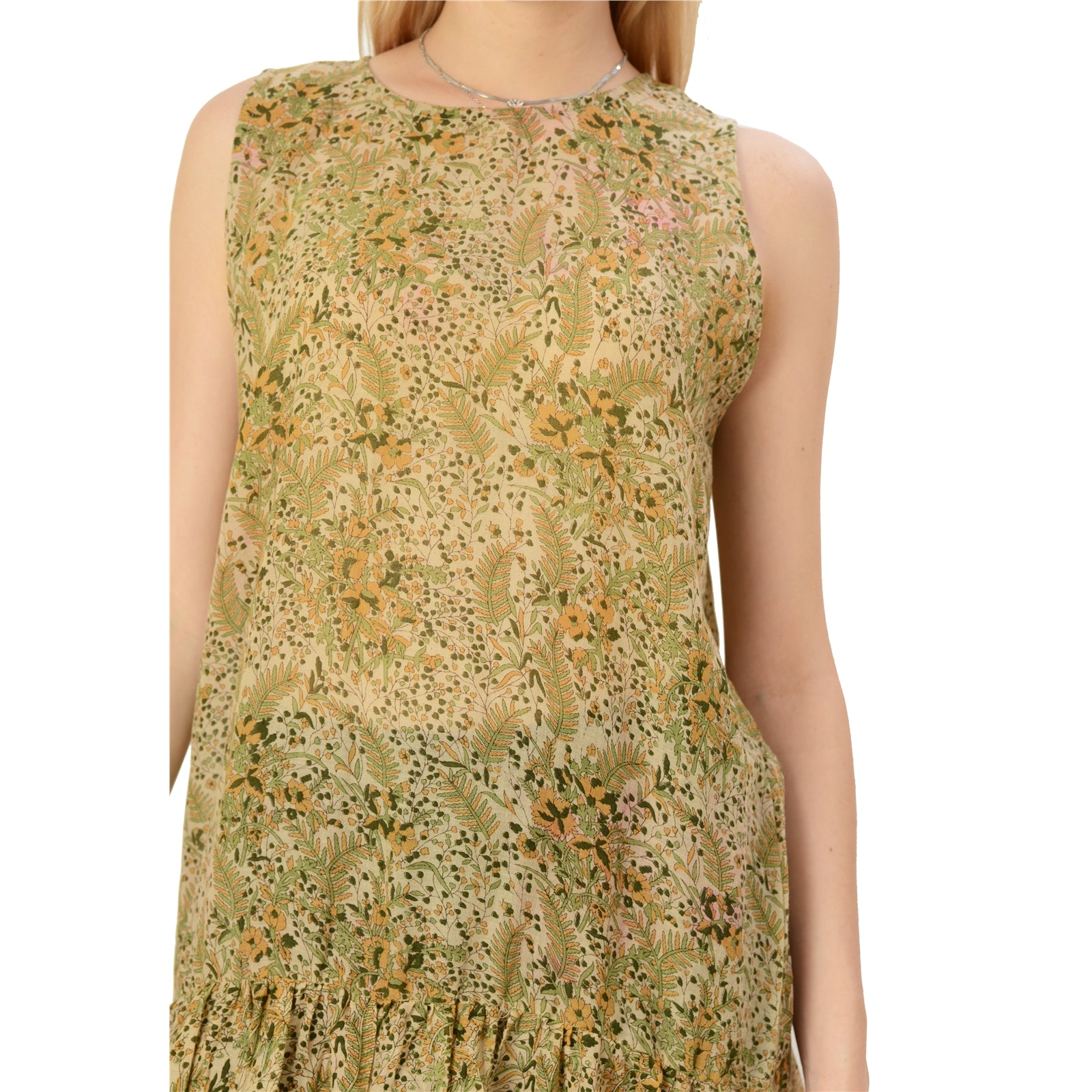 Elevate your sustainable style with our upcycled floral print beige dress. Crafted from pure cotton, this sleeveless dress offers a soft and breathable feel for all-day comfort. The delicate floral print and clever gathers on the pelvis create a flattering silhouette. Complete with an accompanying belt that can be worn as a head scarf or creatively styled, this dress is a versatile embodiment of elegance and ingenuity, allowing you to express yourself fashionably while treading lightly on the planet.