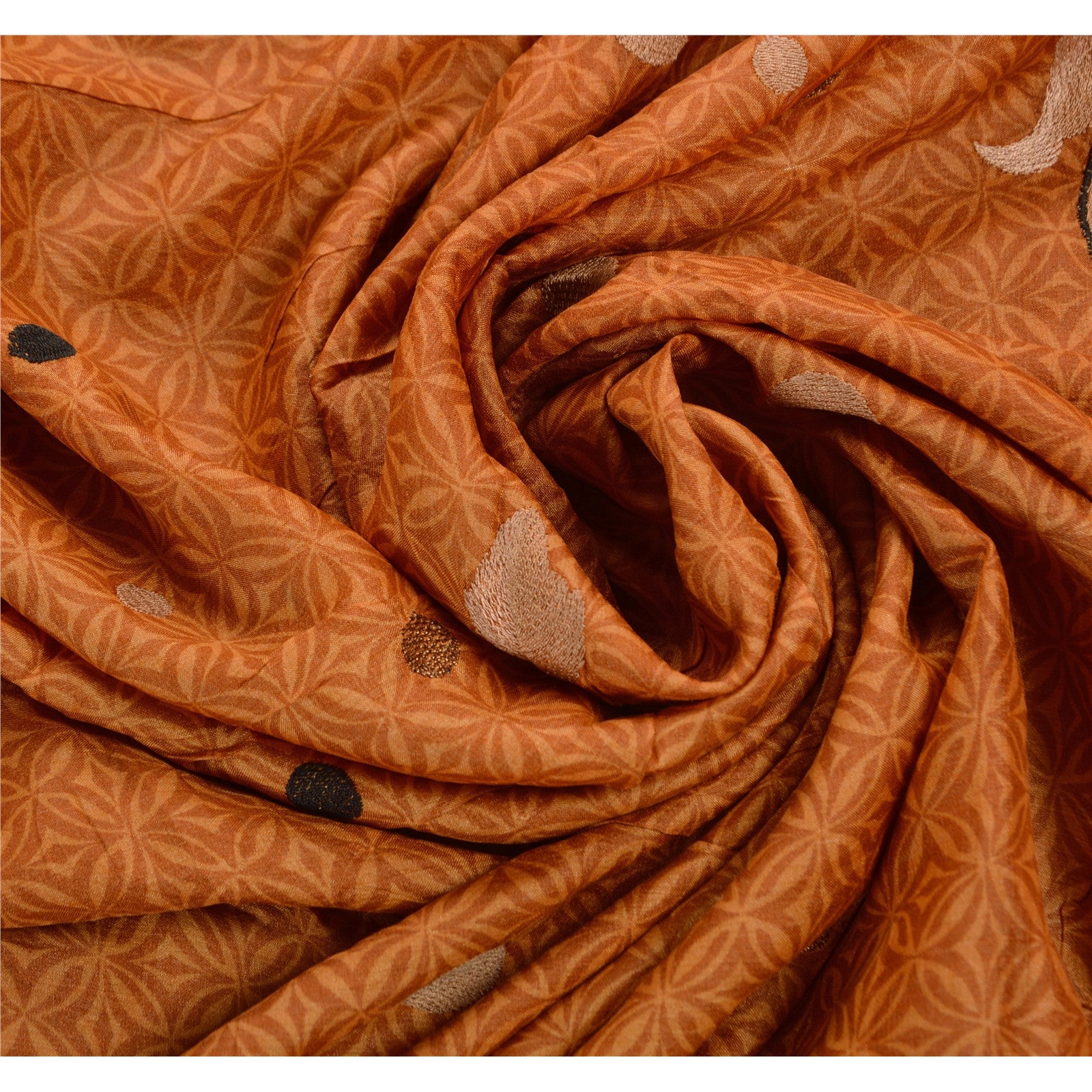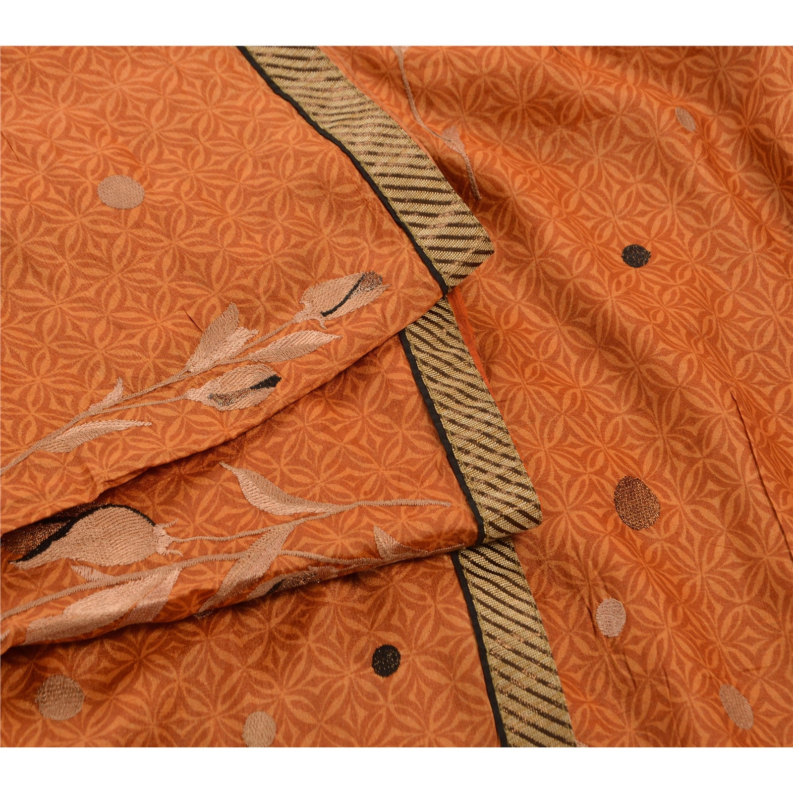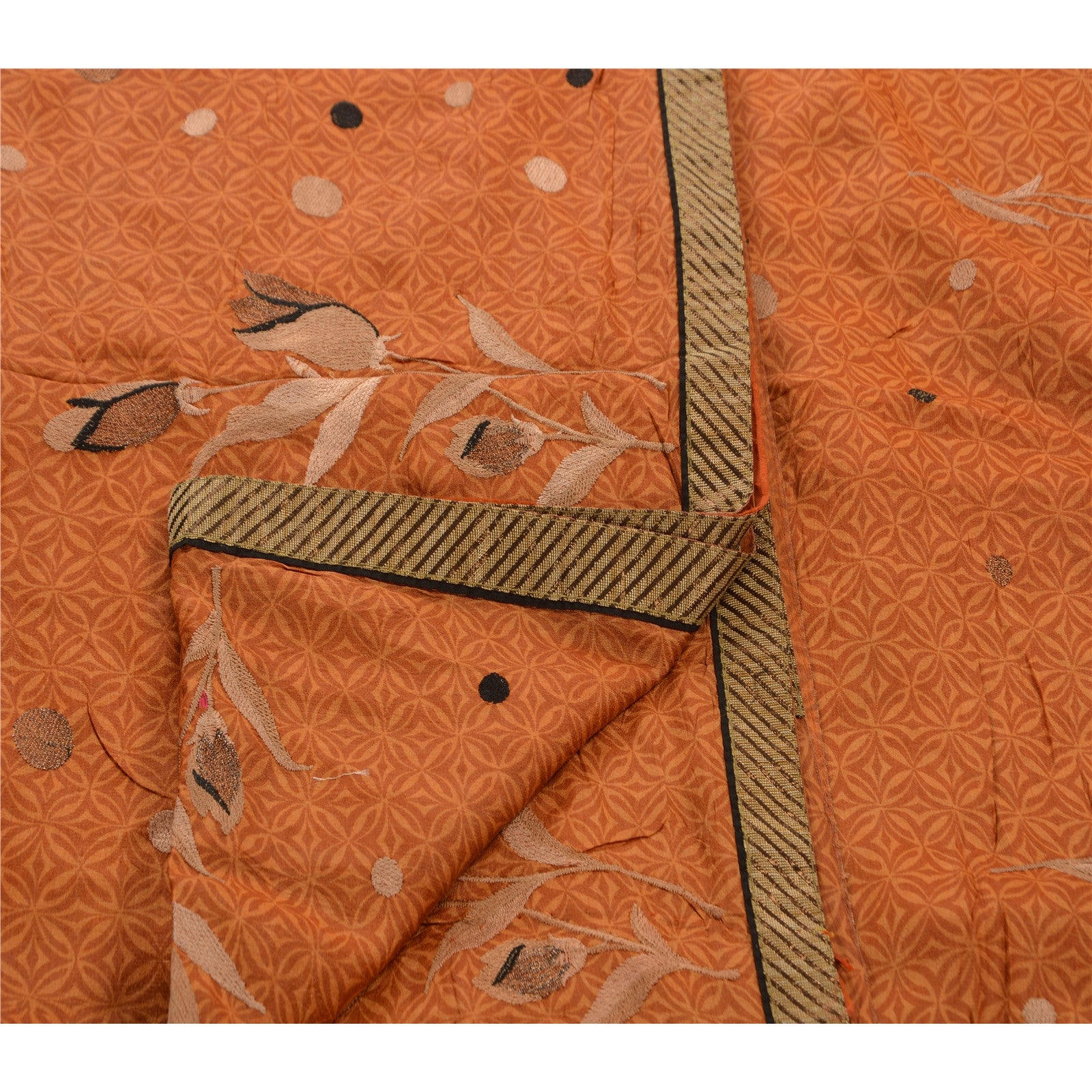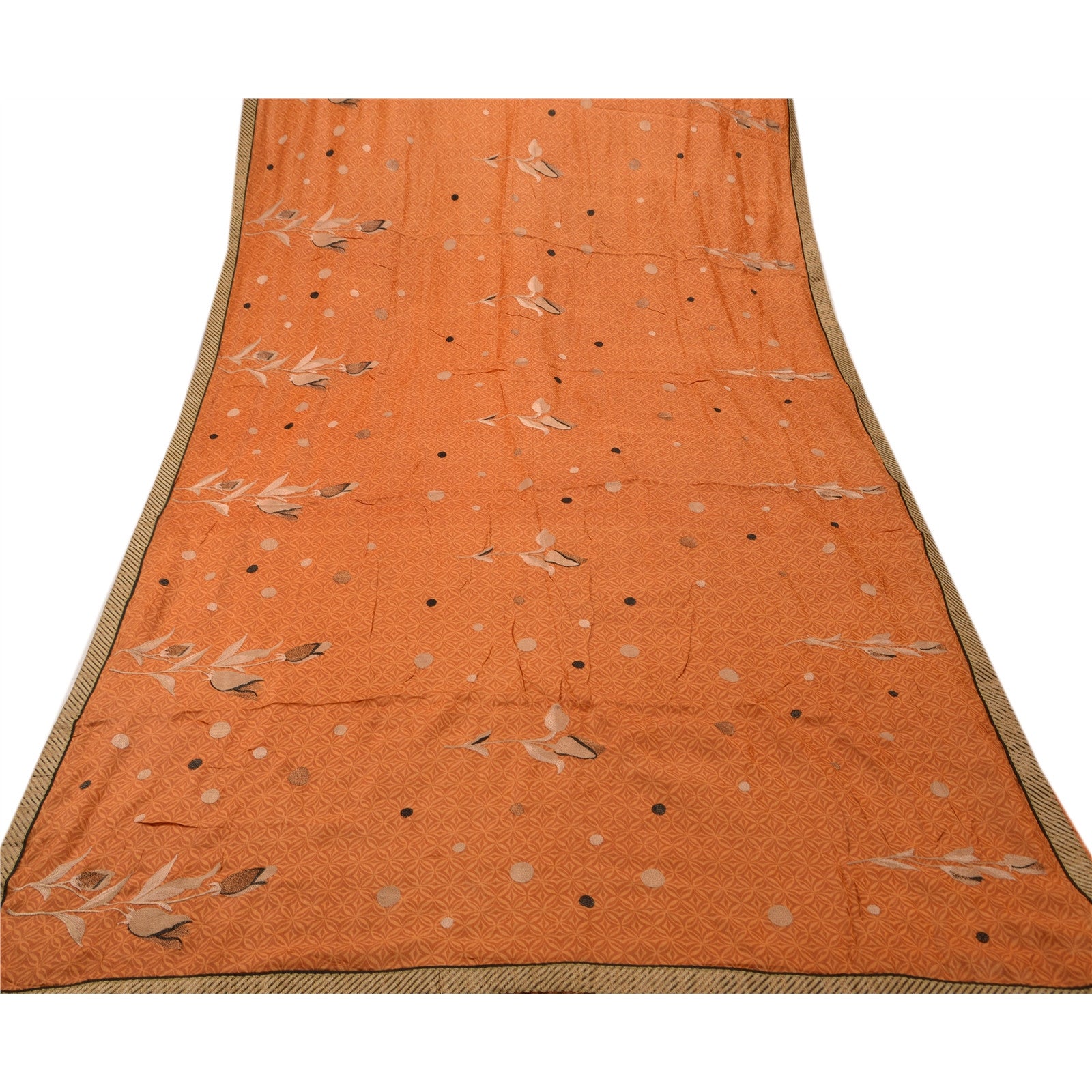 ? Beautiful orange colored hand printed pure silk sari ? All over sari features floral design embellished with black/gold/cream/brown thread work. ? There are woven cream Sustainable Fabric patch work on both sides of borders. What is special about this saree? Vibrant multi color thread work with floral design on orange color base Sustainable Fabric is really enhancing the beauty of the saree. This unique vintage saree can be used for various crafting ideas even if you don't want to use it as a sari. Design a dress, use it as a throw, as window dressing, upholstery, sarongs, table linen and much more. Let your creative juices flow and use this decorated Sustainable Fabric in multiple fashion.